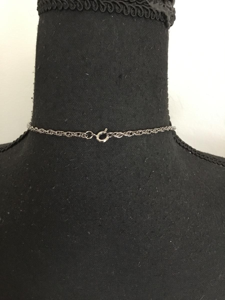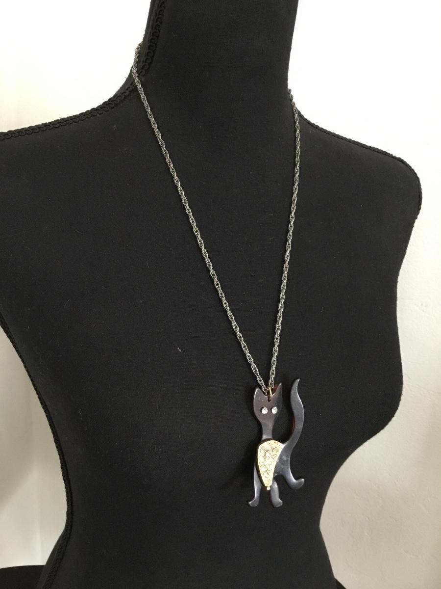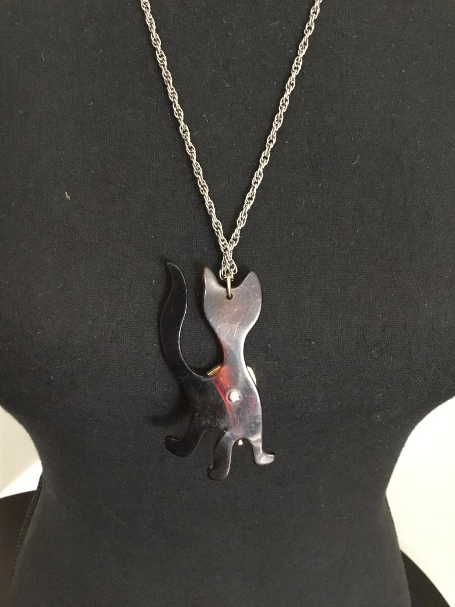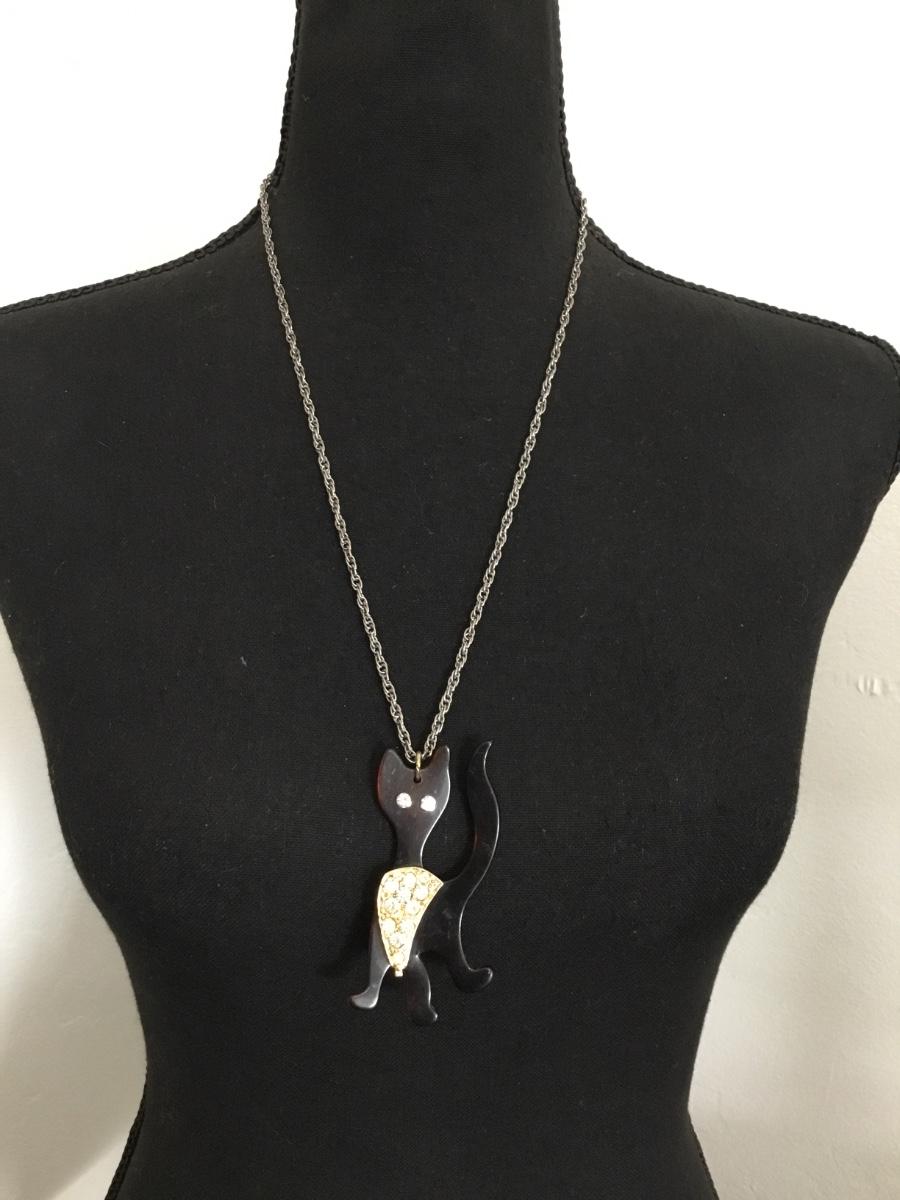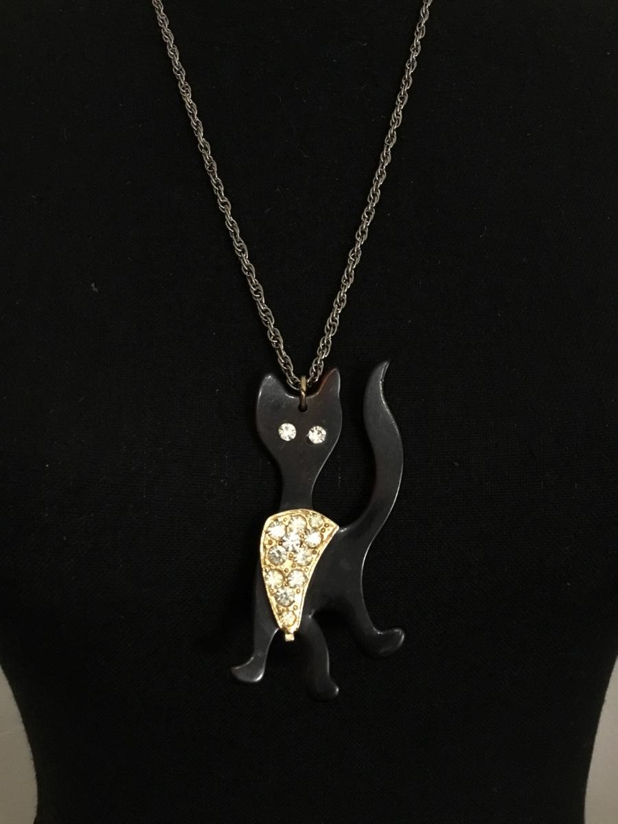 Super cute, vintage cat pendant with rhinestones and silver tone chain necklace