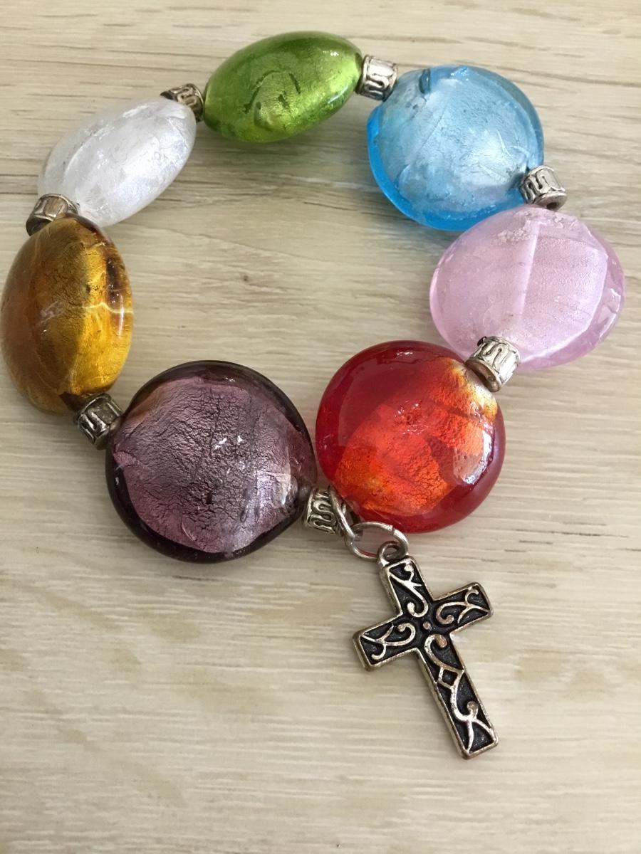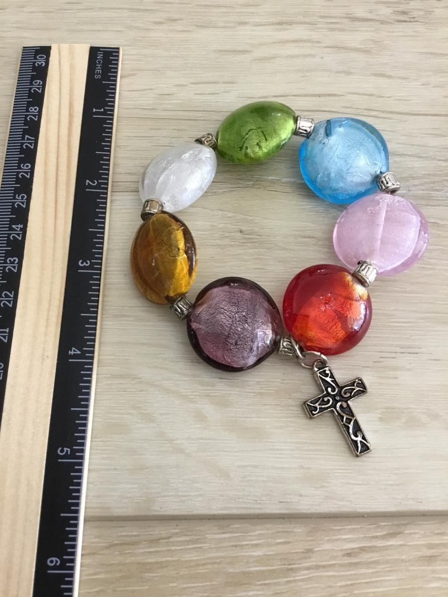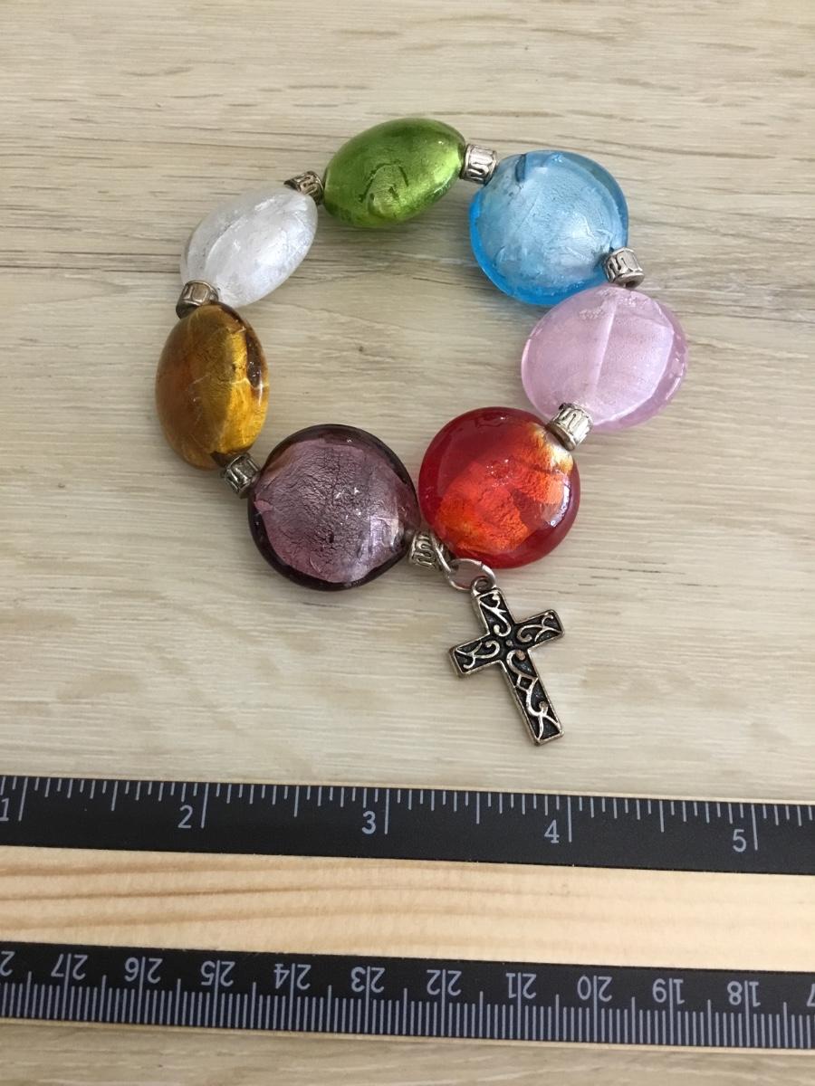 Super cute Vintage colorful glass with silver tone cross charm stretch bracelet