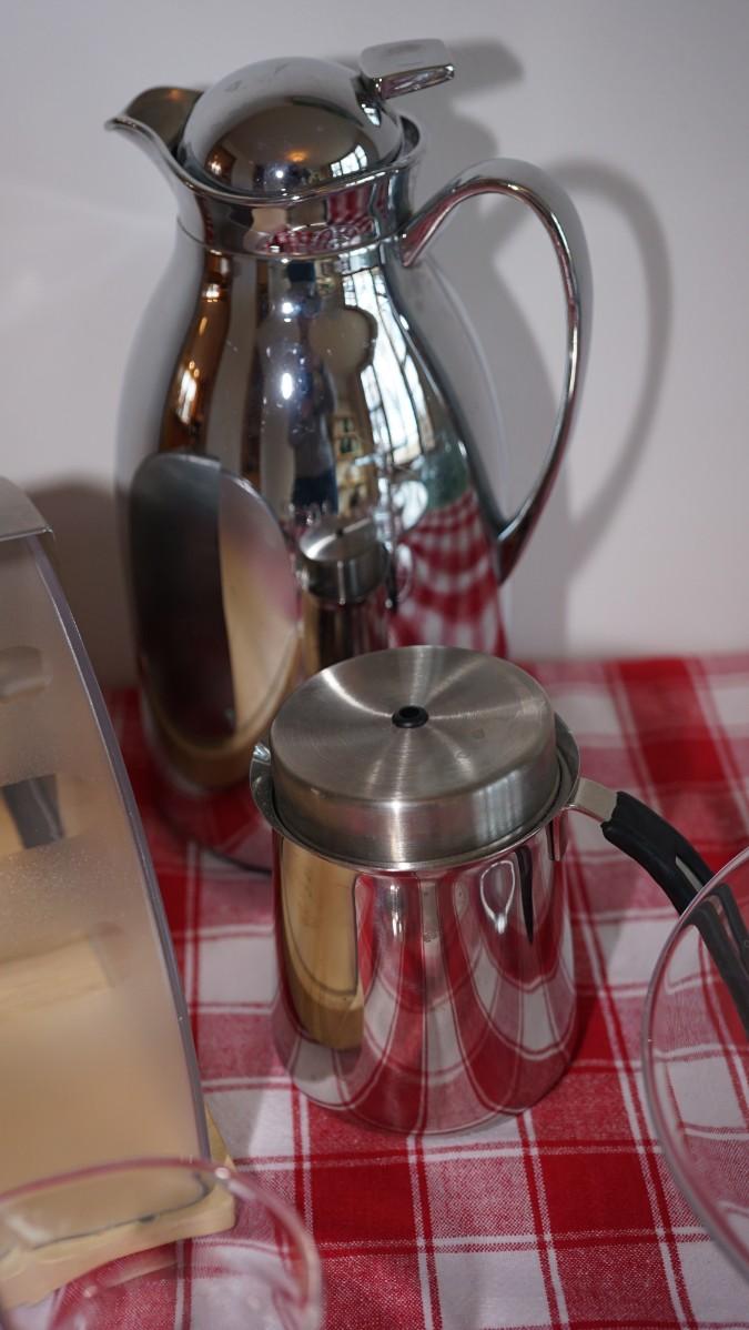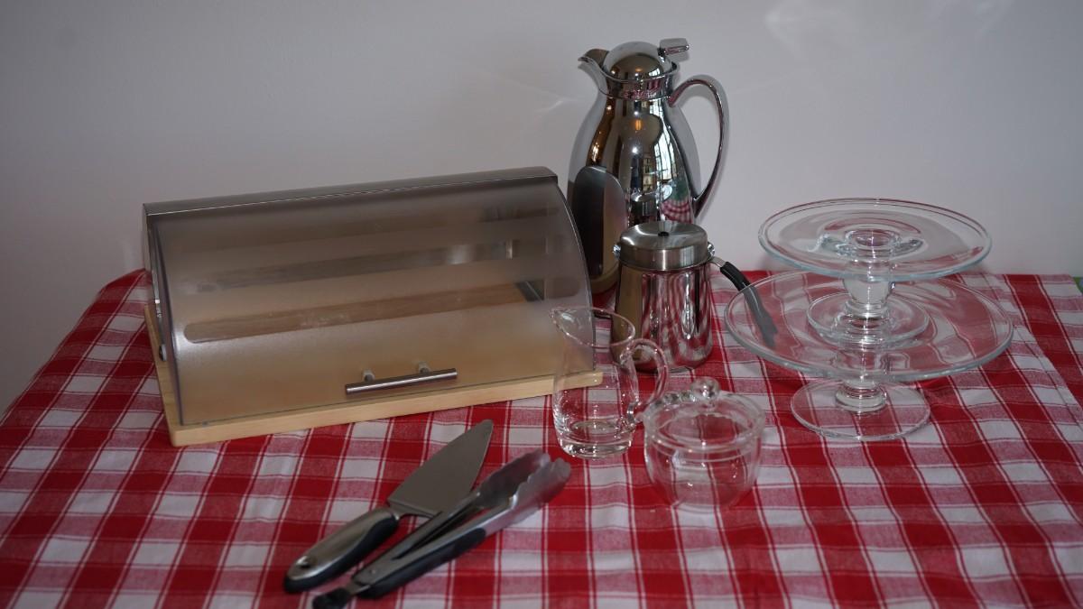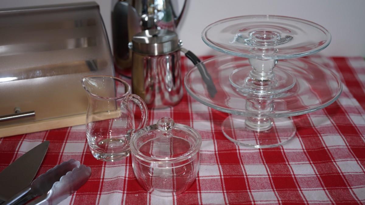 nice bread keep with heavy plastic dome lid, the glass creamer and sugar are nice to have for guests or to keep near the coffee station, two tazzas for family guests when the stop in the holidays. Coffee carafe and espresso pitcher.