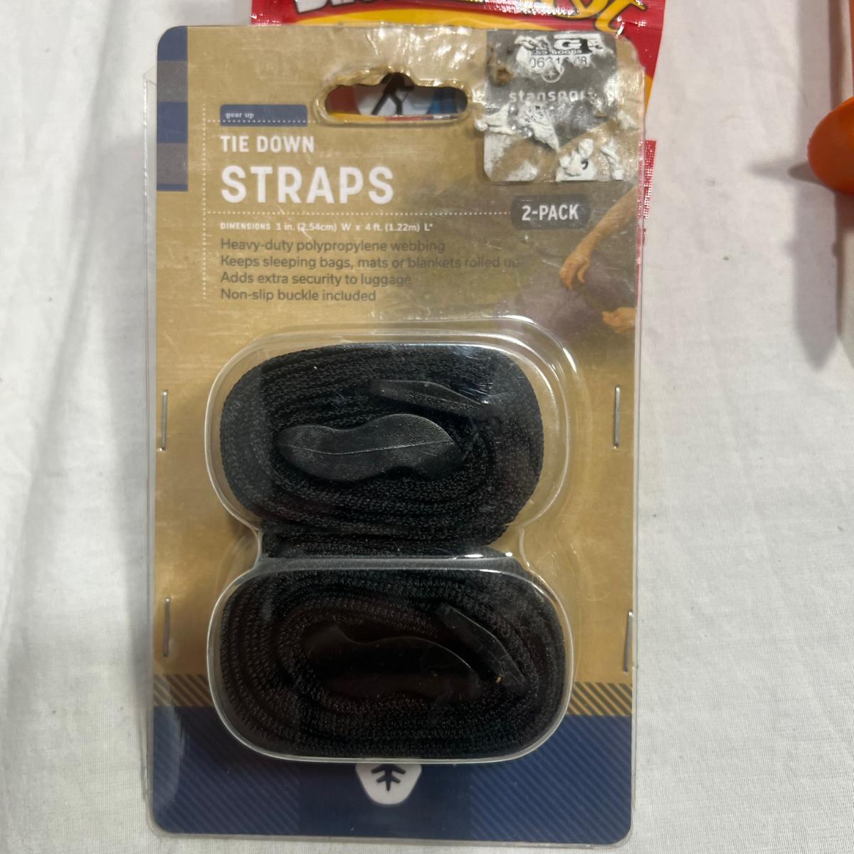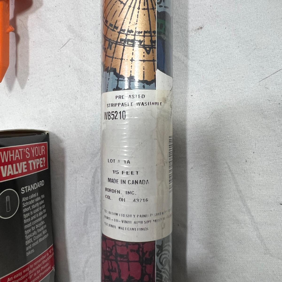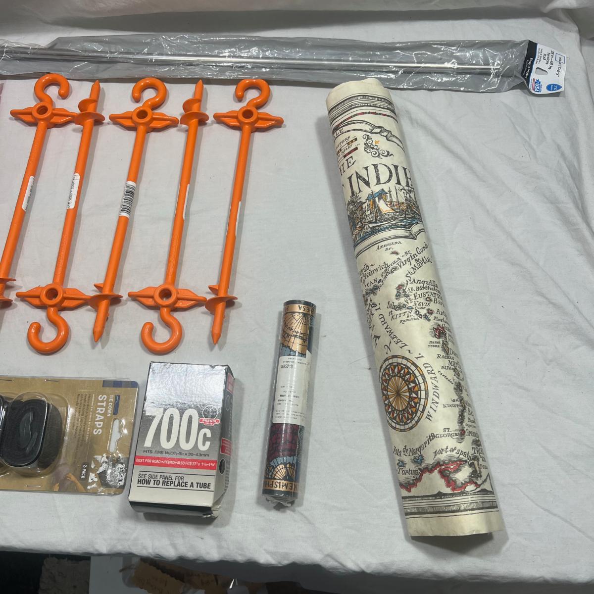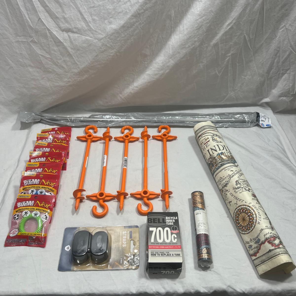 Super miscellaneous garage bundle; steaks, bike tire, straps, bug repellent bracelets, map design wallpaper, treasure looking map, small tension rod