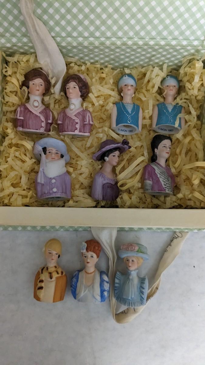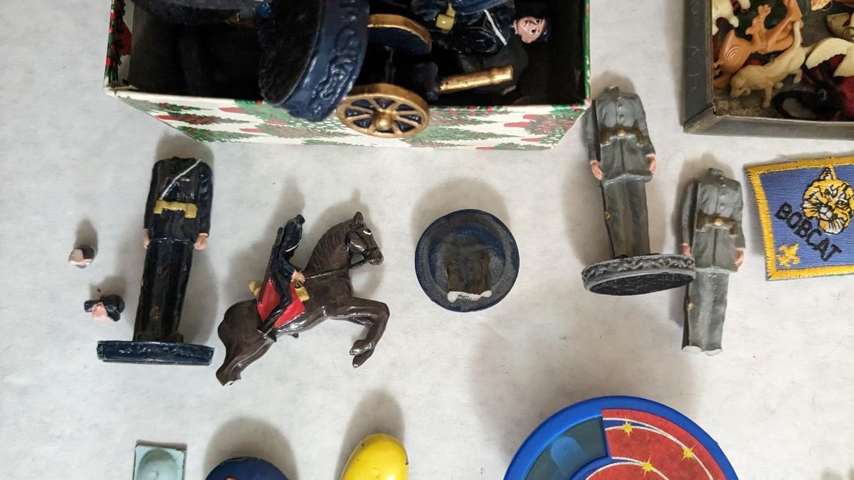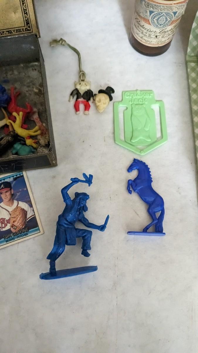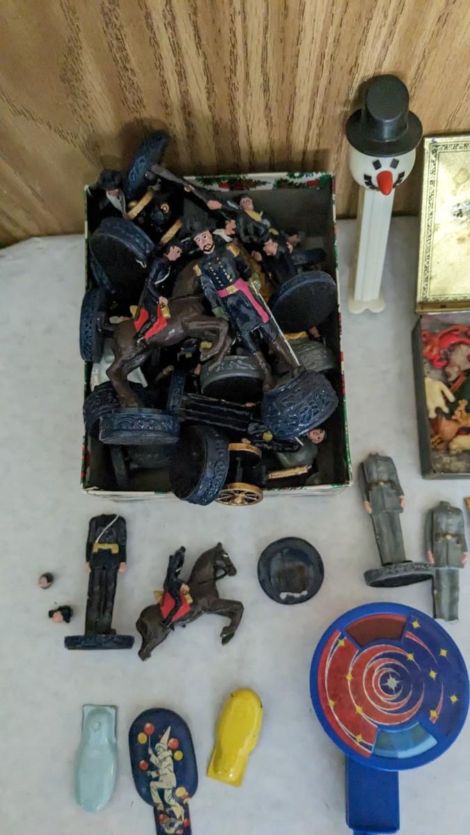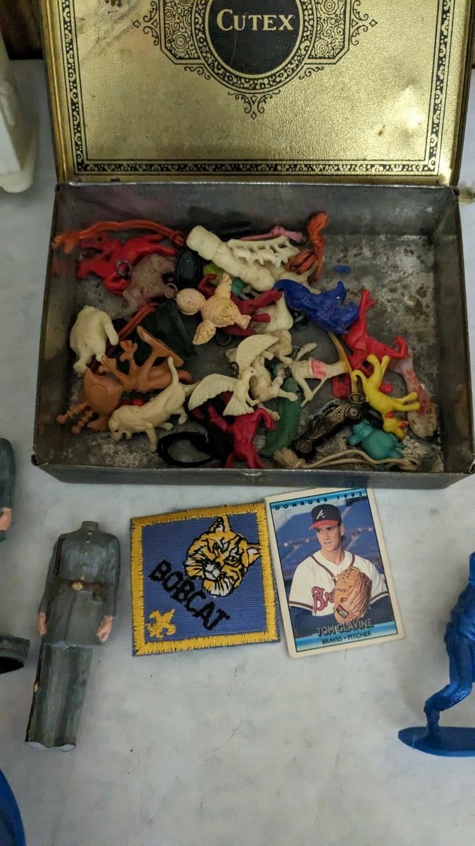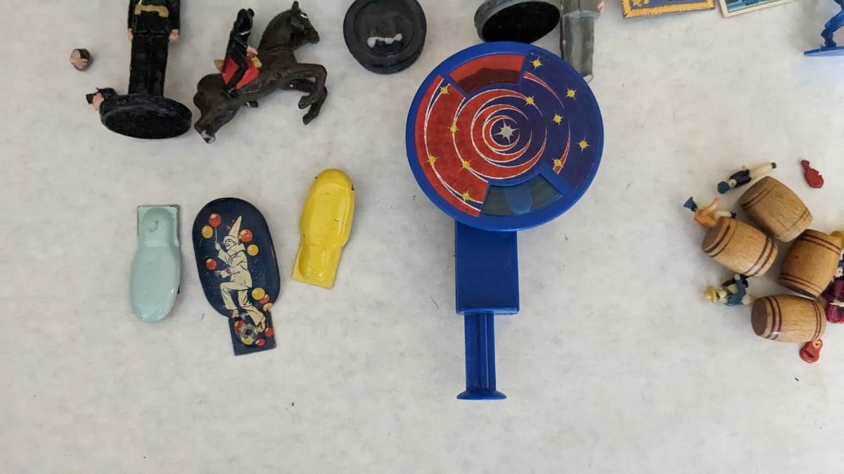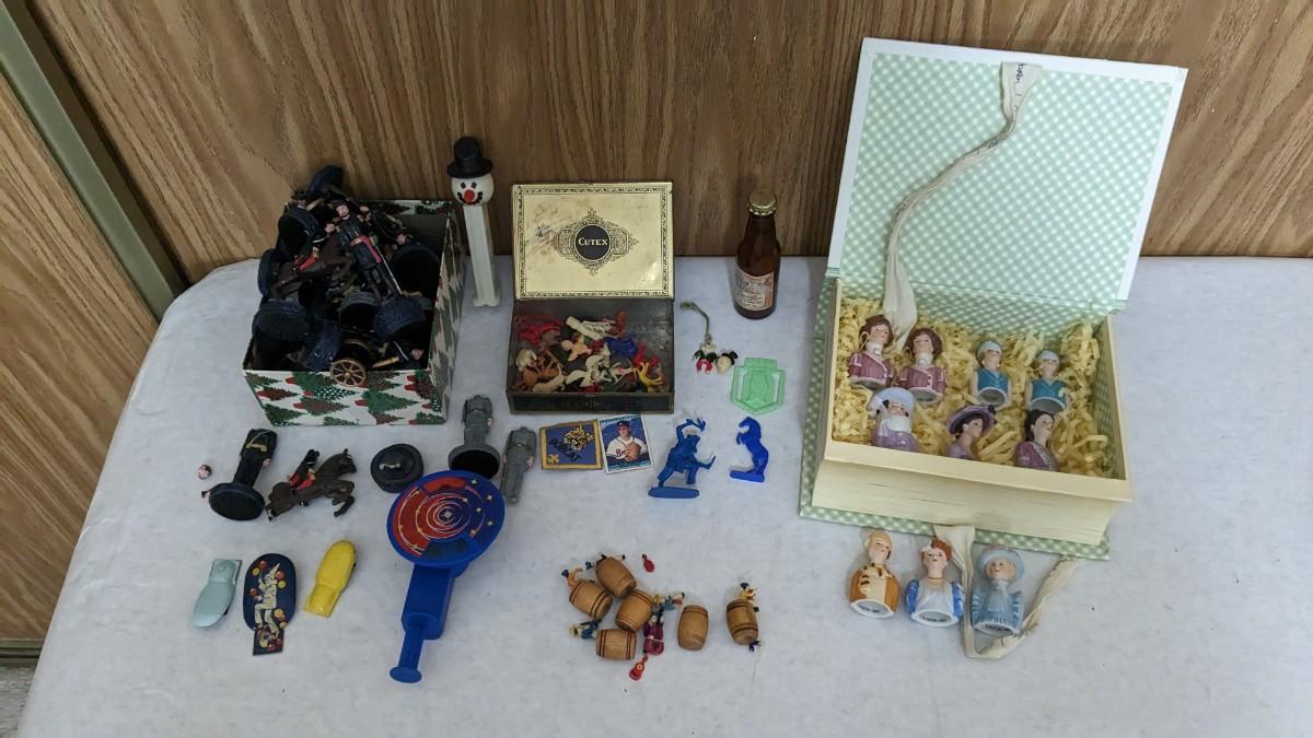 includes Avon porcelain thimbles, what appears to be chess pieces-some are noted as broken, vintage noisemakers, 1" wood barrel people from Japan, a vintage box full of old plastic pieces, some appear to be toys and others appear to be pendants for necklaces, an old PEZ dispenser, and 4.25" Budweiser bottle. bdrm1