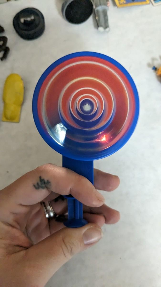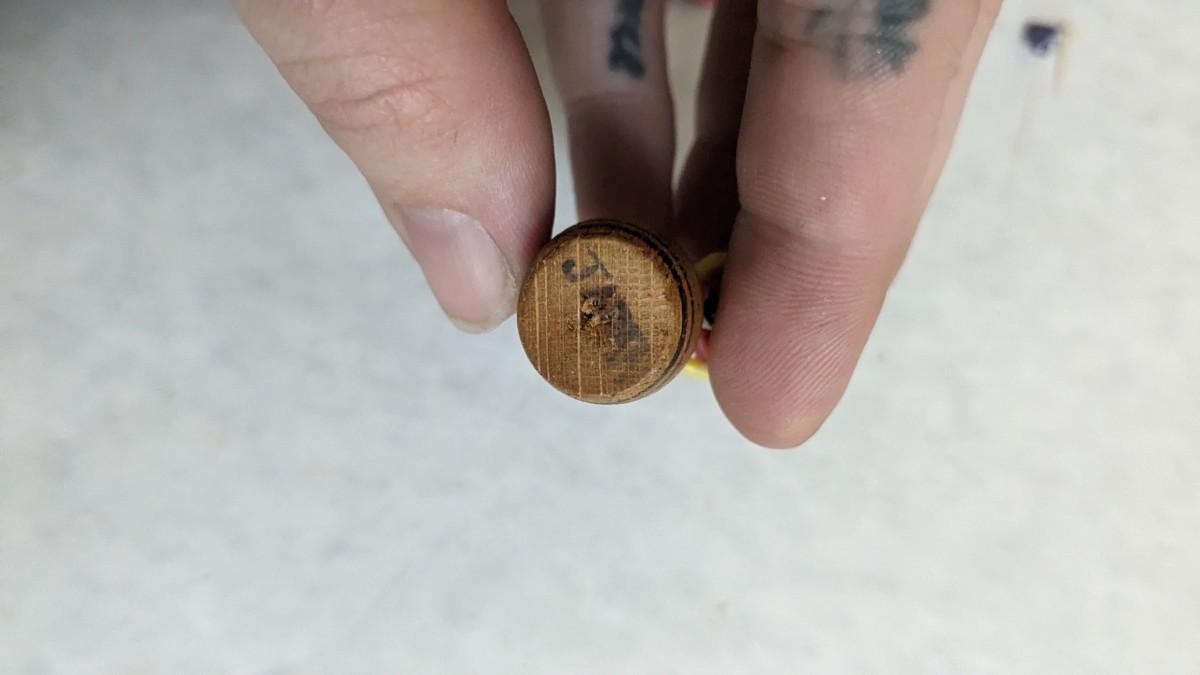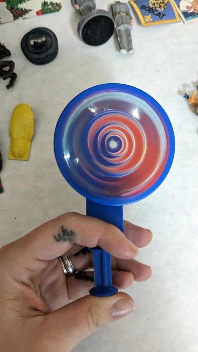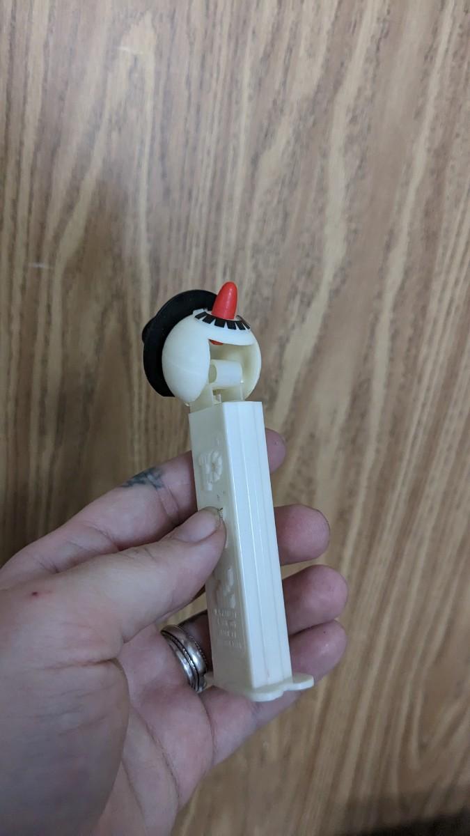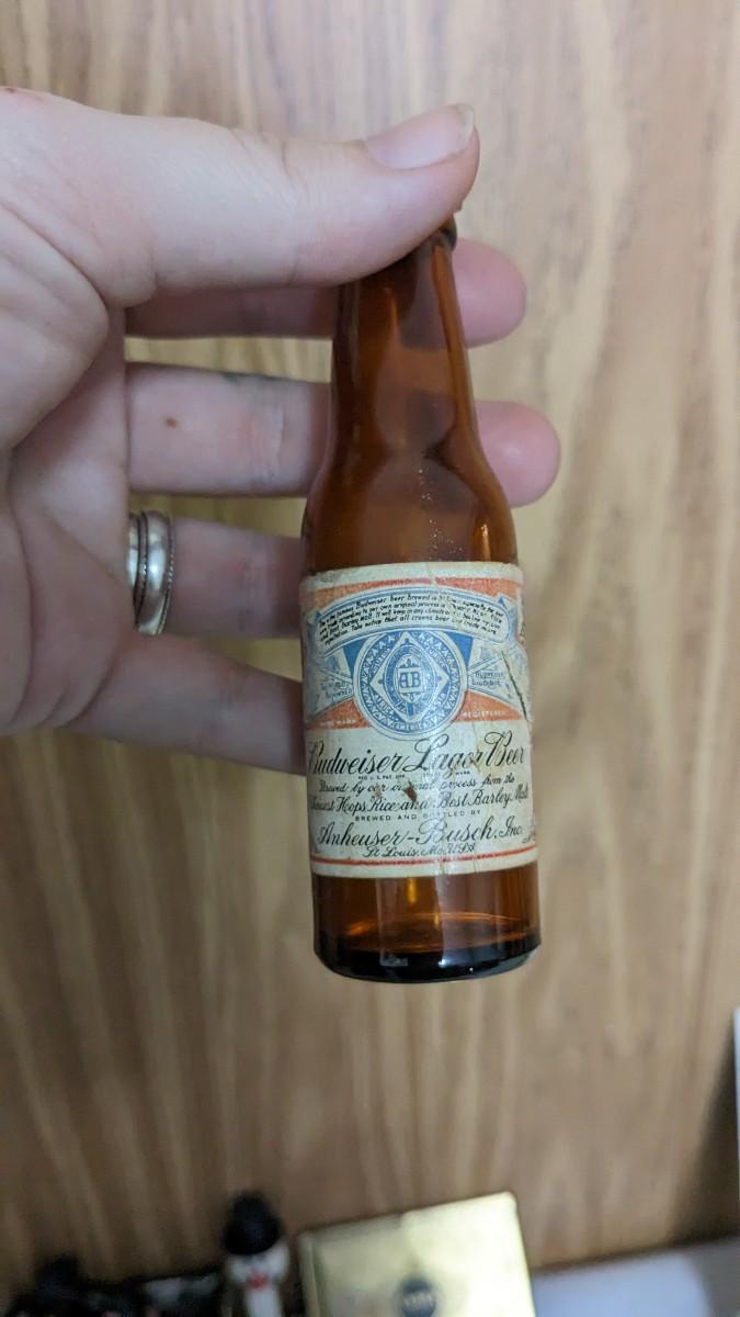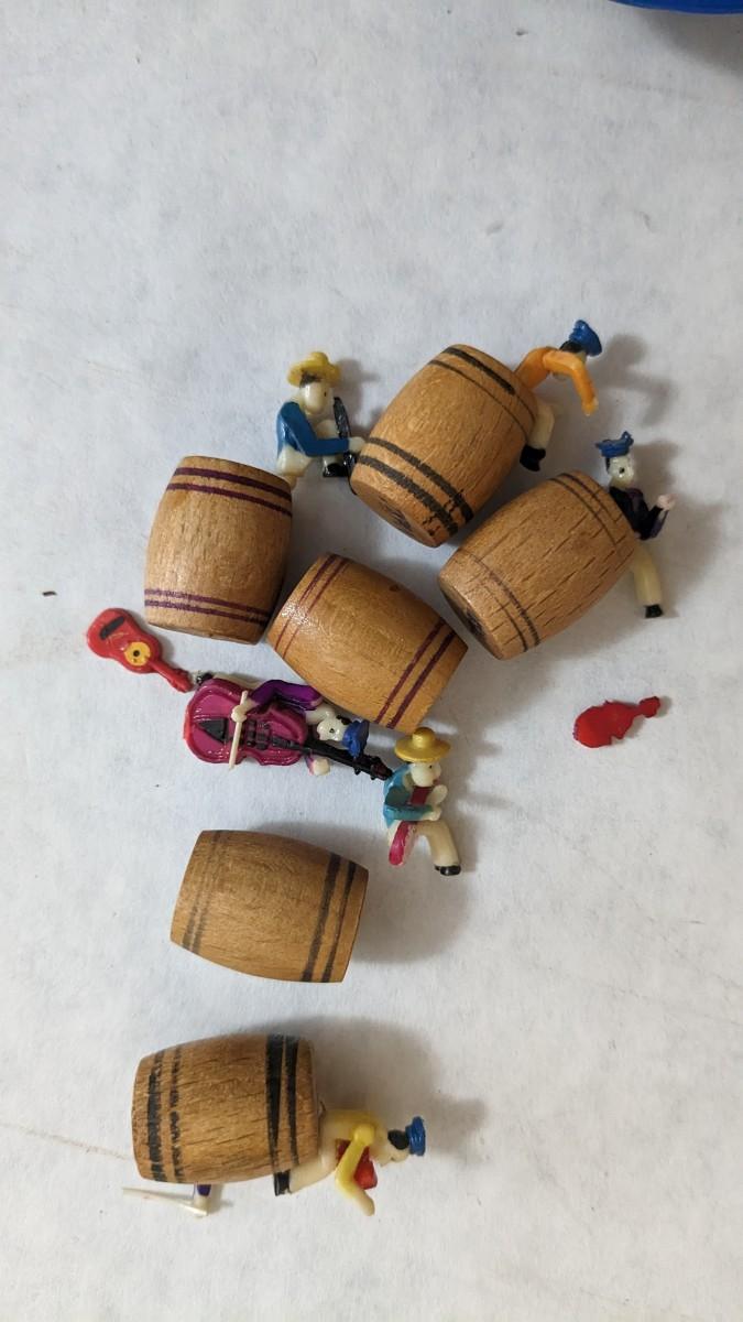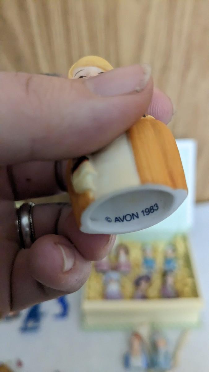 includes Avon porcelain thimbles, what appears to be chess pieces-some are noted as broken, vintage noisemakers, 1" wood barrel people from Japan, a vintage box full of old plastic pieces, some appear to be toys and others appear to be pendants for necklaces, an old PEZ dispenser, and 4.25" Budweiser bottle. bdrm1