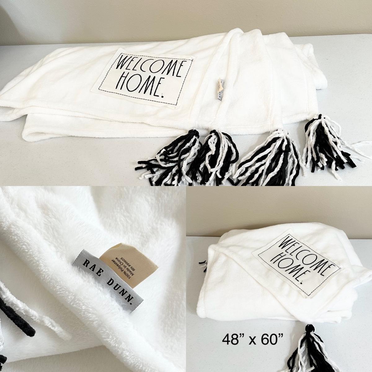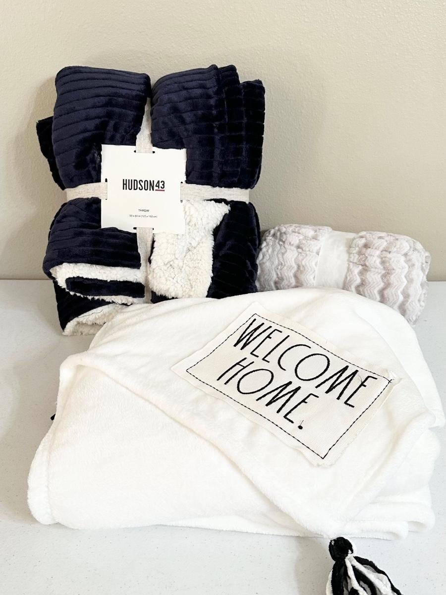 See photos. ~ the rolled up one is brand new and appears to be 50 x 60. Rae Dunn, Hudson 43 and CVS