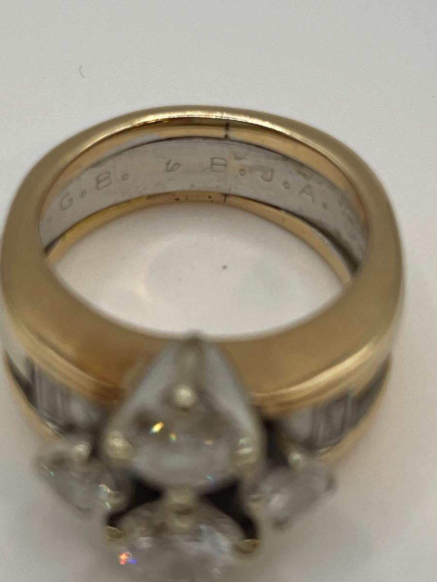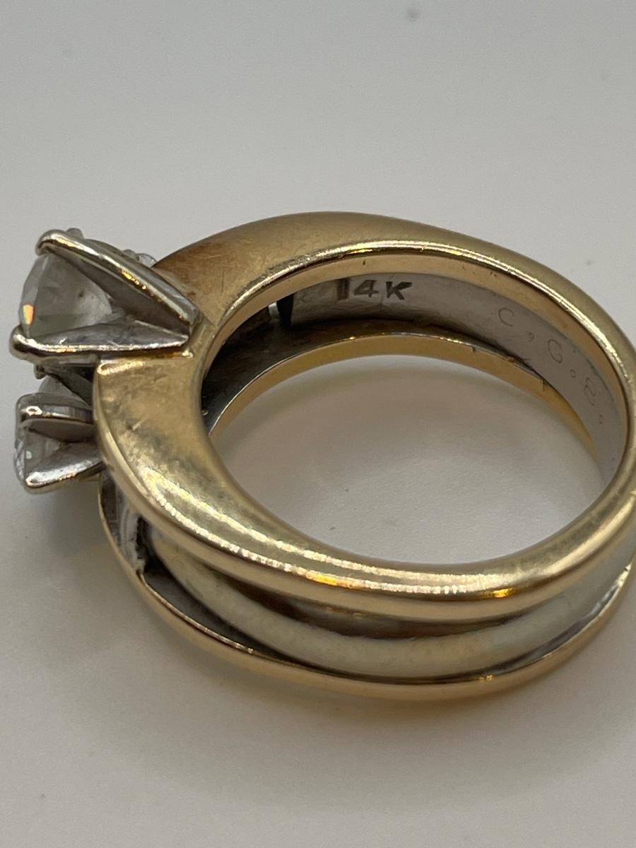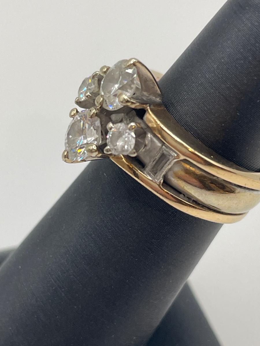 One ladies 14k yellow gold handmade one of a kind diamond engagement ring jacket containing six diamonds, two larger center diamonds, one weighing approximately 7/8 carats, G-H color, VS clarity, round brilliant cut, one weighing approximately 3/4 carats, H-I color, SI2 clarity, European cut, with one diamond set on either side weighing approximately 1/6 carats each, full cut round brilliant, G-H color, VS clarity, with one straight baguette diamond weighing approximately .08 carats each, G-H color, VS clarity, this ring is made to match a 3.75 mm wide semi-domed 14k white gold wedding band, the band weighs approximately 2.25 DWTS, handmade 14k yellow gold