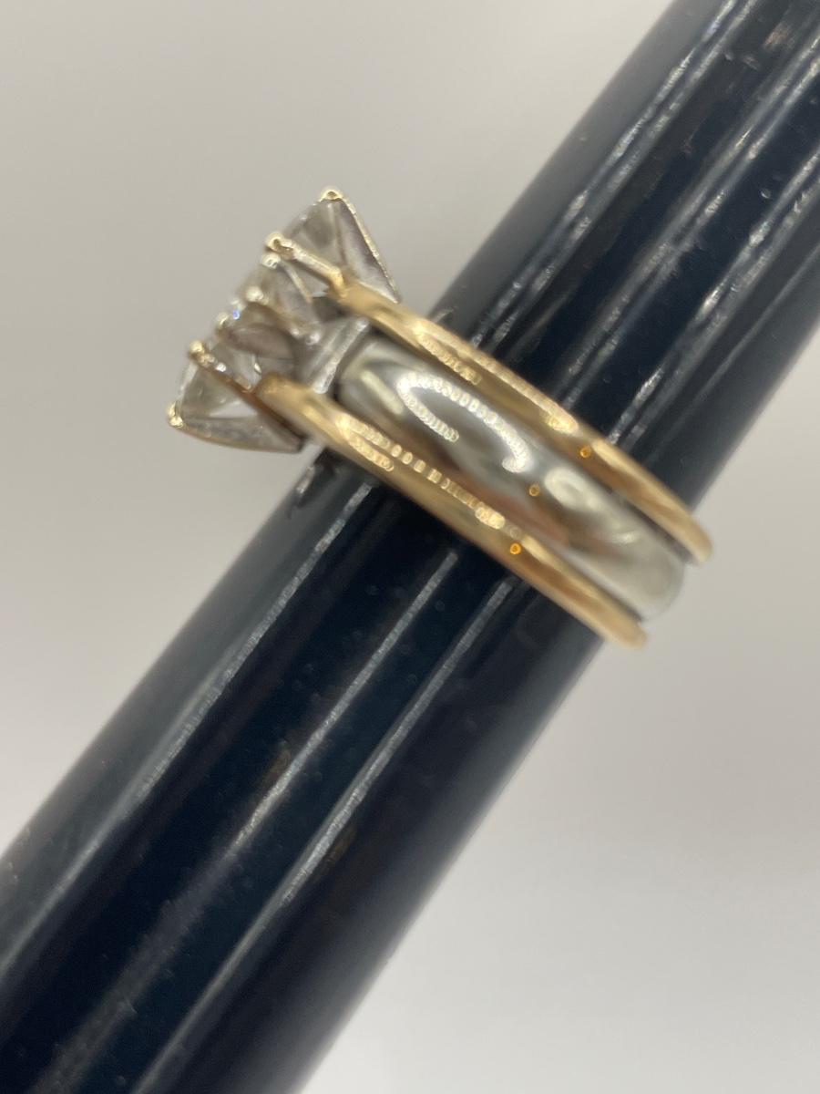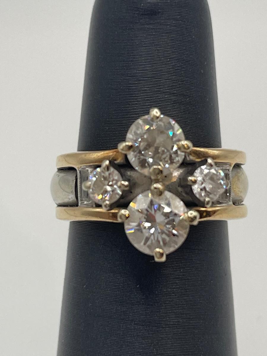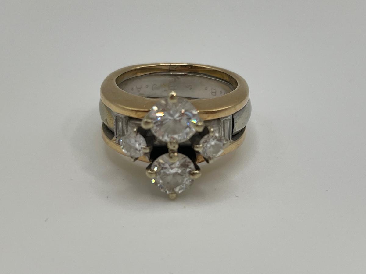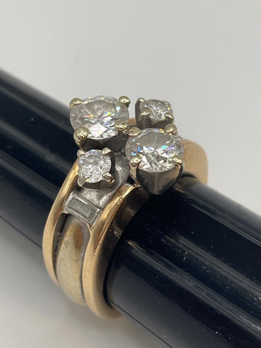 One ladies 14k yellow gold handmade one of a kind diamond engagement ring jacket containing six diamonds, two larger center diamonds, one weighing approximately 7/8 carats, G-H color, VS clarity, round brilliant cut, one weighing approximately 3/4 carats, H-I color, SI2 clarity, European cut, with one diamond set on either side weighing approximately 1/6 carats each, full cut round brilliant, G-H color, VS clarity, with one straight baguette diamond weighing approximately .08 carats each, G-H color, VS clarity, this ring is made to match a 3.75 mm wide semi-domed 14k white gold wedding band, the band weighs approximately 2.25 DWTS, handmade 14k yellow gold
