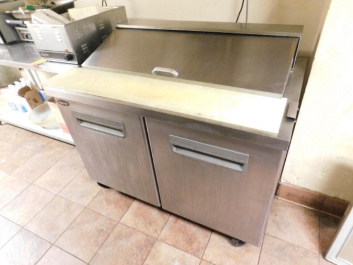 Superior Brand Commercial Kitchen Double Door Sandwich Prep Box Cooler 48". Appears to be in working order but we did not test temperature stabilization. Expect some wear or scratches to finish. Shipping option available via freight or local mover at Buyer's expense. Buyer must have all shipping scheduled within the stated dates and times of pickup. Recommended local mover is Beaty Bros. Moving 828-201-2982