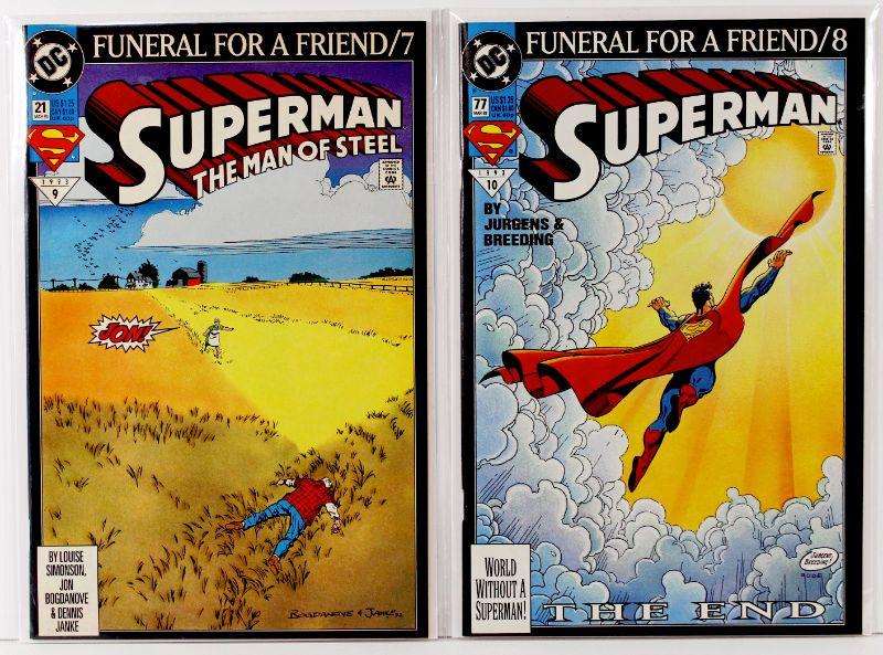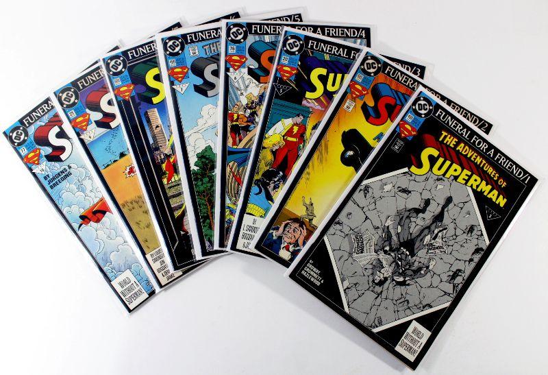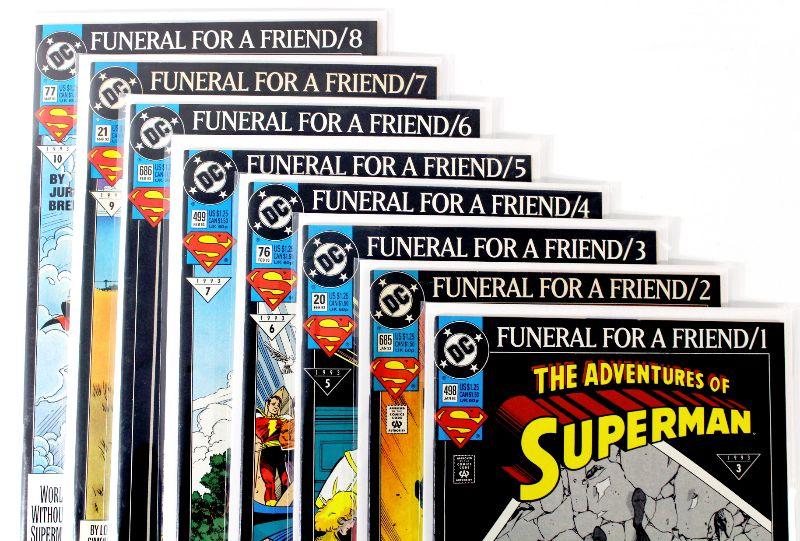 Included are following books - Funeral for a Friend Part 1 - Adventures of Superman #498, Funeral for a Friend Part 2 - Action Comics #685, Funeral for a Friend Part 3 - Superman: The Man of Steel #20, Funeral for a Friend Part 4 - Superman #76, Funeral for a Friend Part 5 - Adventures of Superman #499, Funeral for a Friend Part 6 - Action Comics #686, Funeral for a Friend Part 7 - Superman: The Man of Steel #21, Funeral for a Friend Part 8 - Superman #77 - All comics in high collector's grade - VF/NM to NM.