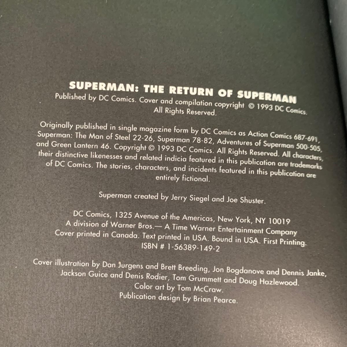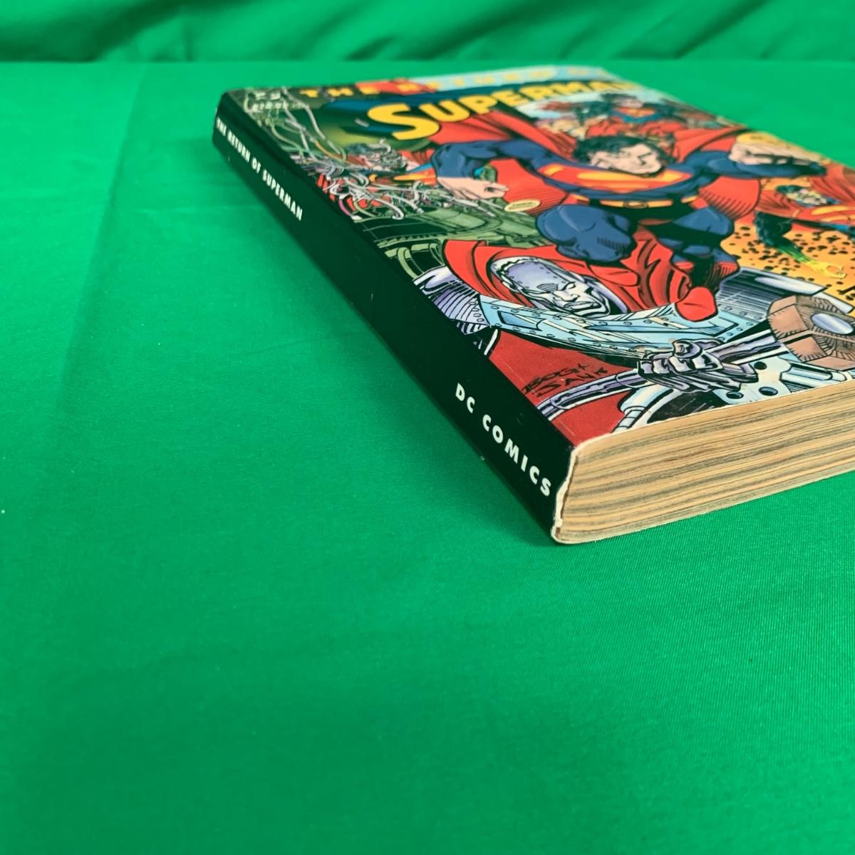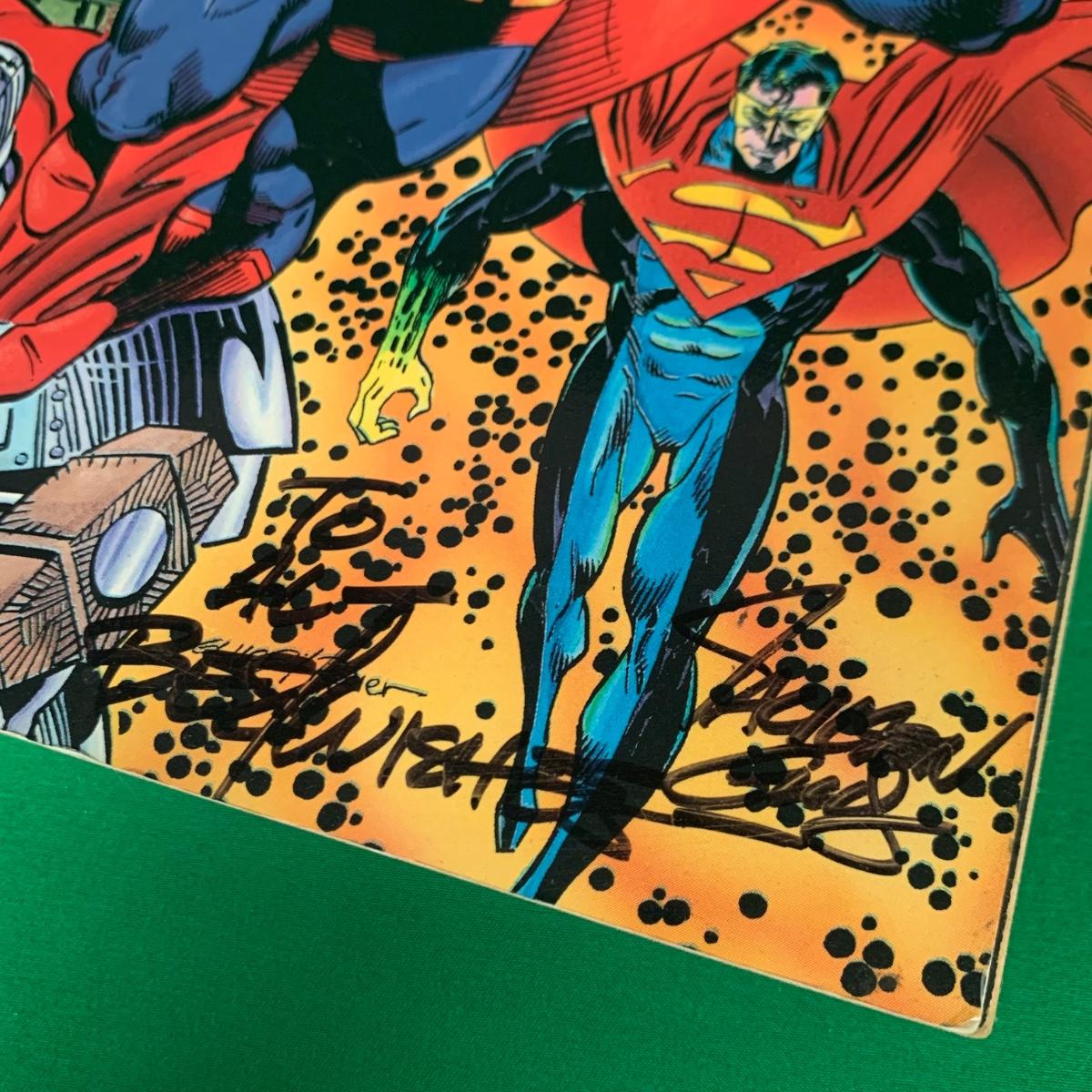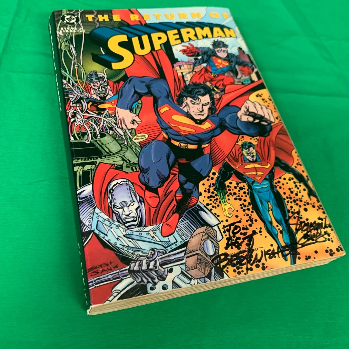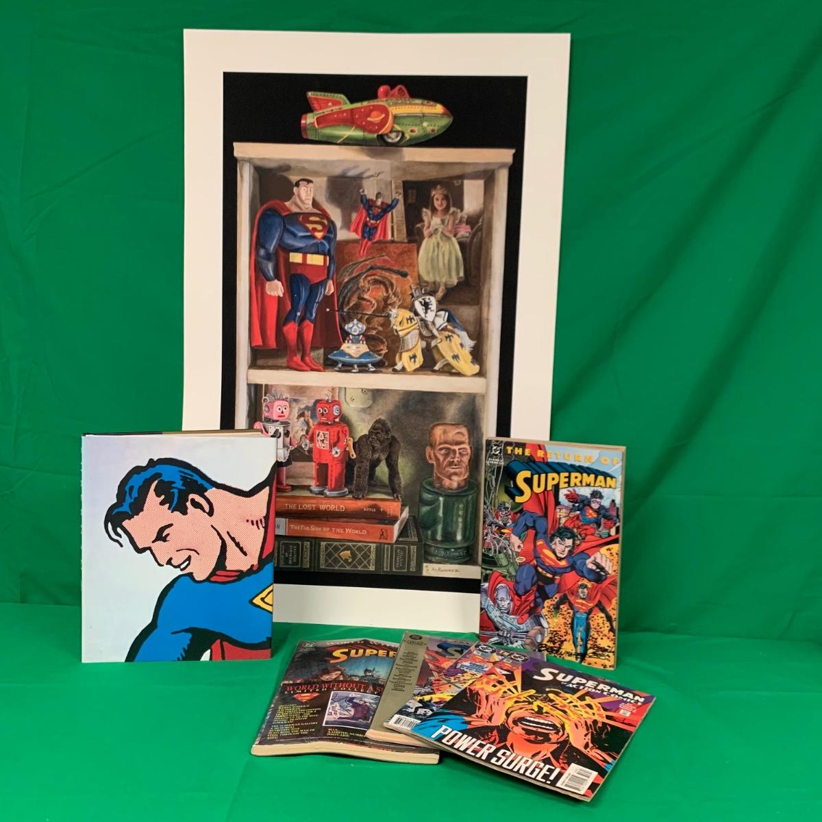 Superman themed lot including hardcover book “Superman: The Complete History”, with five other Superman books and comics, plus a large giclee fine art print of art done by Al Ramirez. Print is 19” x 30”H and has original signature. There are some small blemishes on the white border around the art. “The Return of Superman” is autographed on the front cover. It appears to be the signature of Jackson “Butch” Guice.