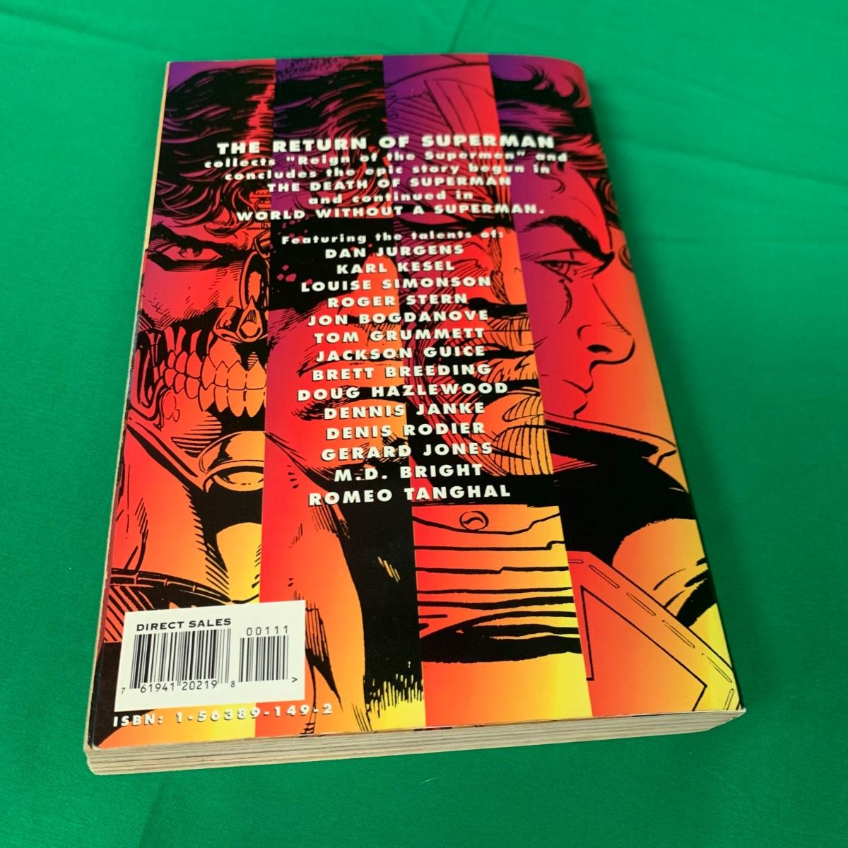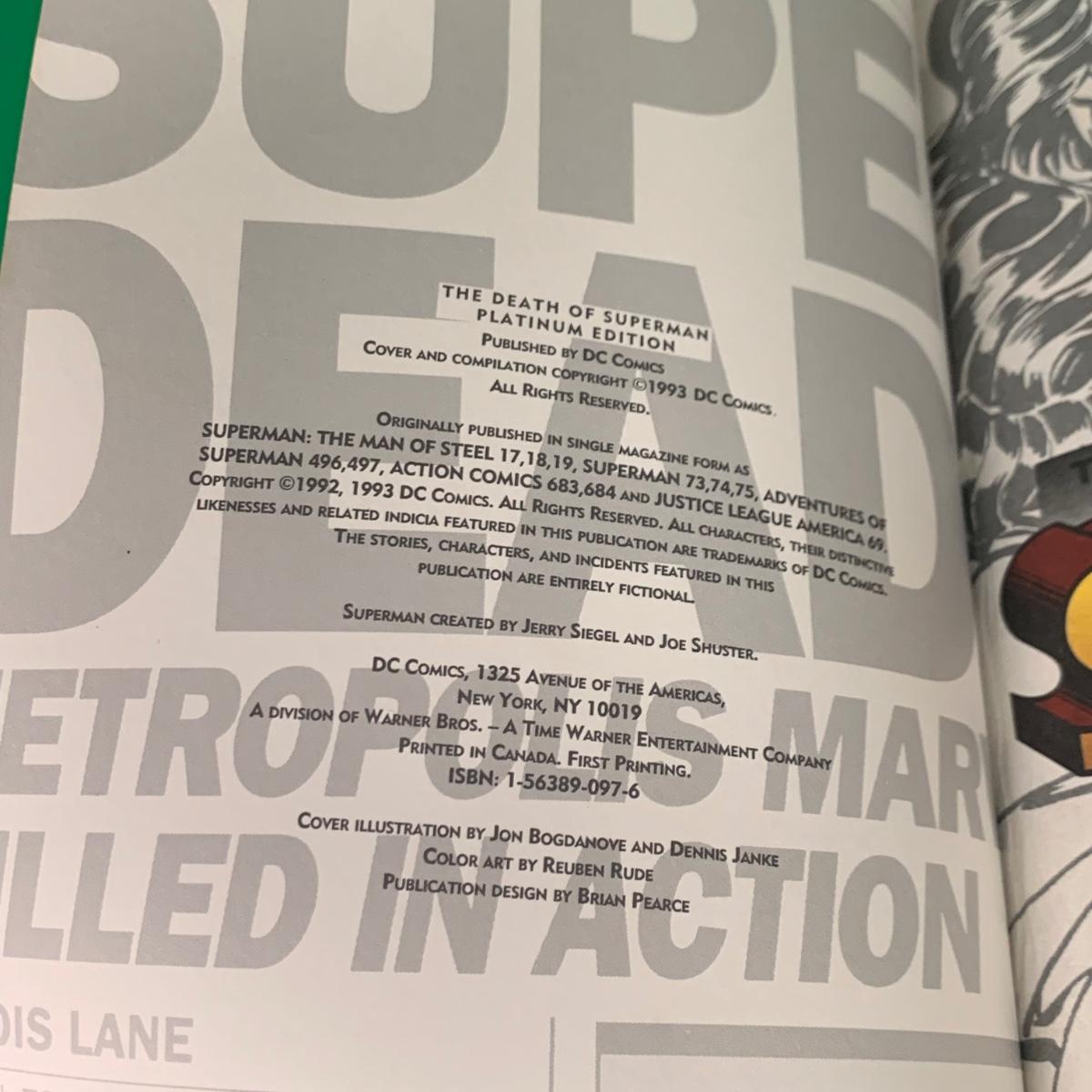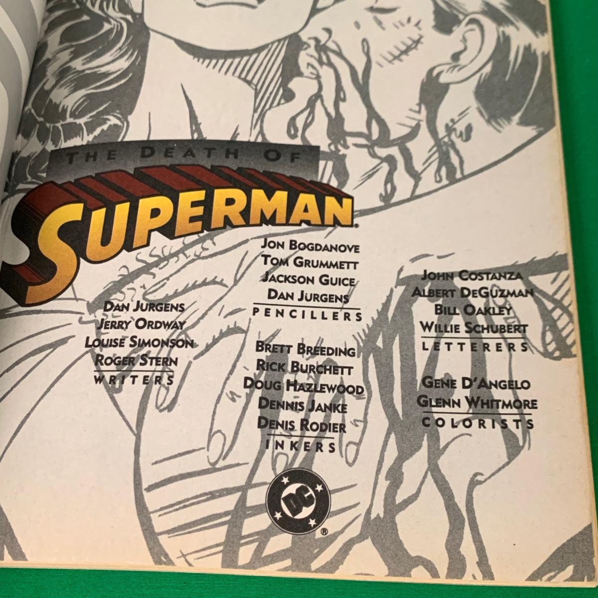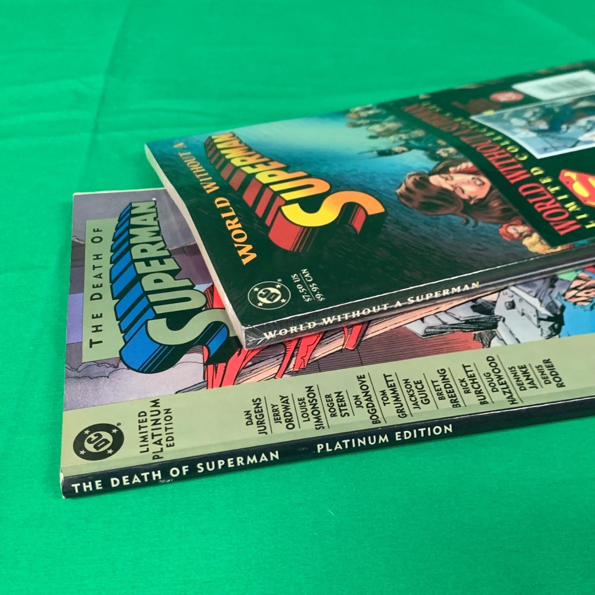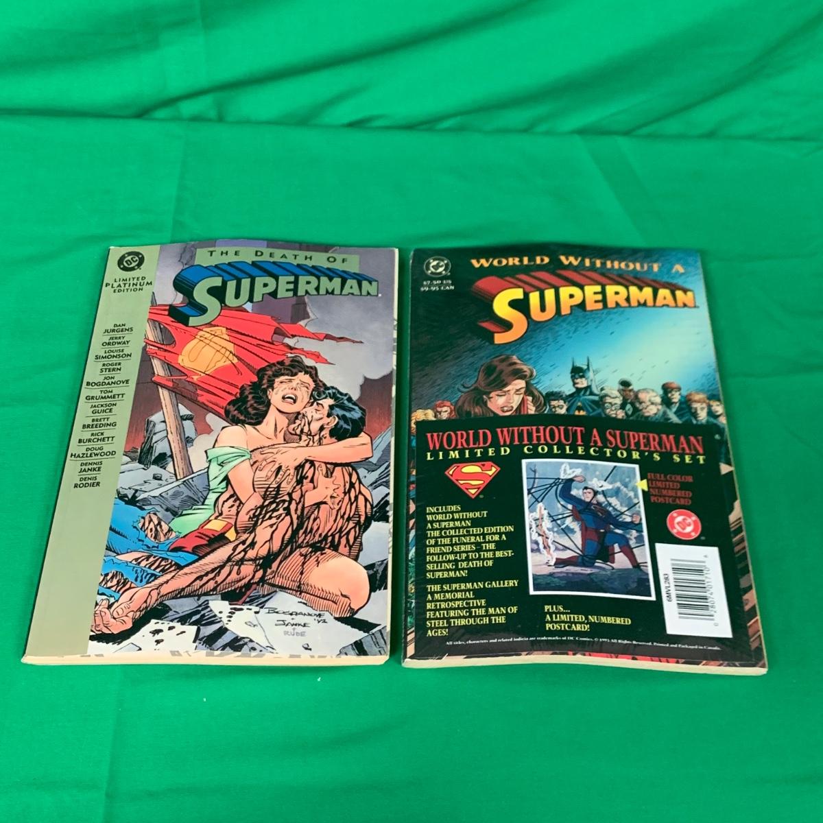 Superman themed lot including hardcover book “Superman: The Complete History”, with five other Superman books and comics, plus a large giclee fine art print of art done by Al Ramirez. Print is 19” x 30”H and has original signature. There are some small blemishes on the white border around the art. “The Return of Superman” is autographed on the front cover. It appears to be the signature of Jackson “Butch” Guice.
