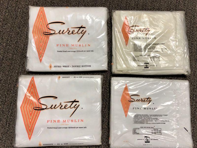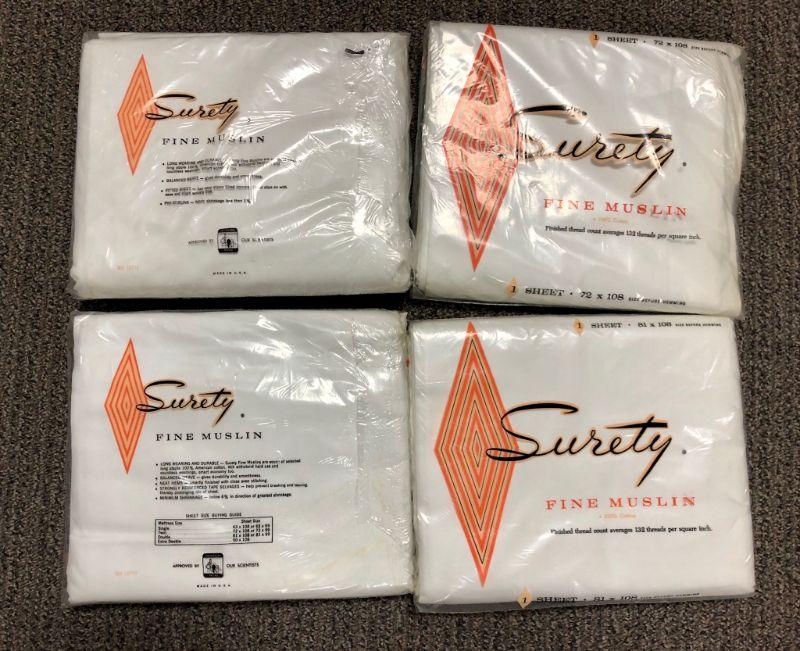 Surety Fine Muslin Sheets. 1 fitted and 3 flat sheets. In original packages. Looks like they are for full size beds except one flat may be for a twin.