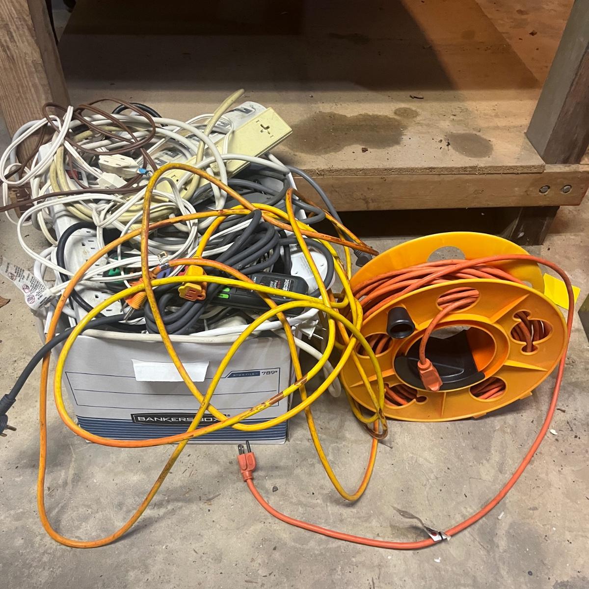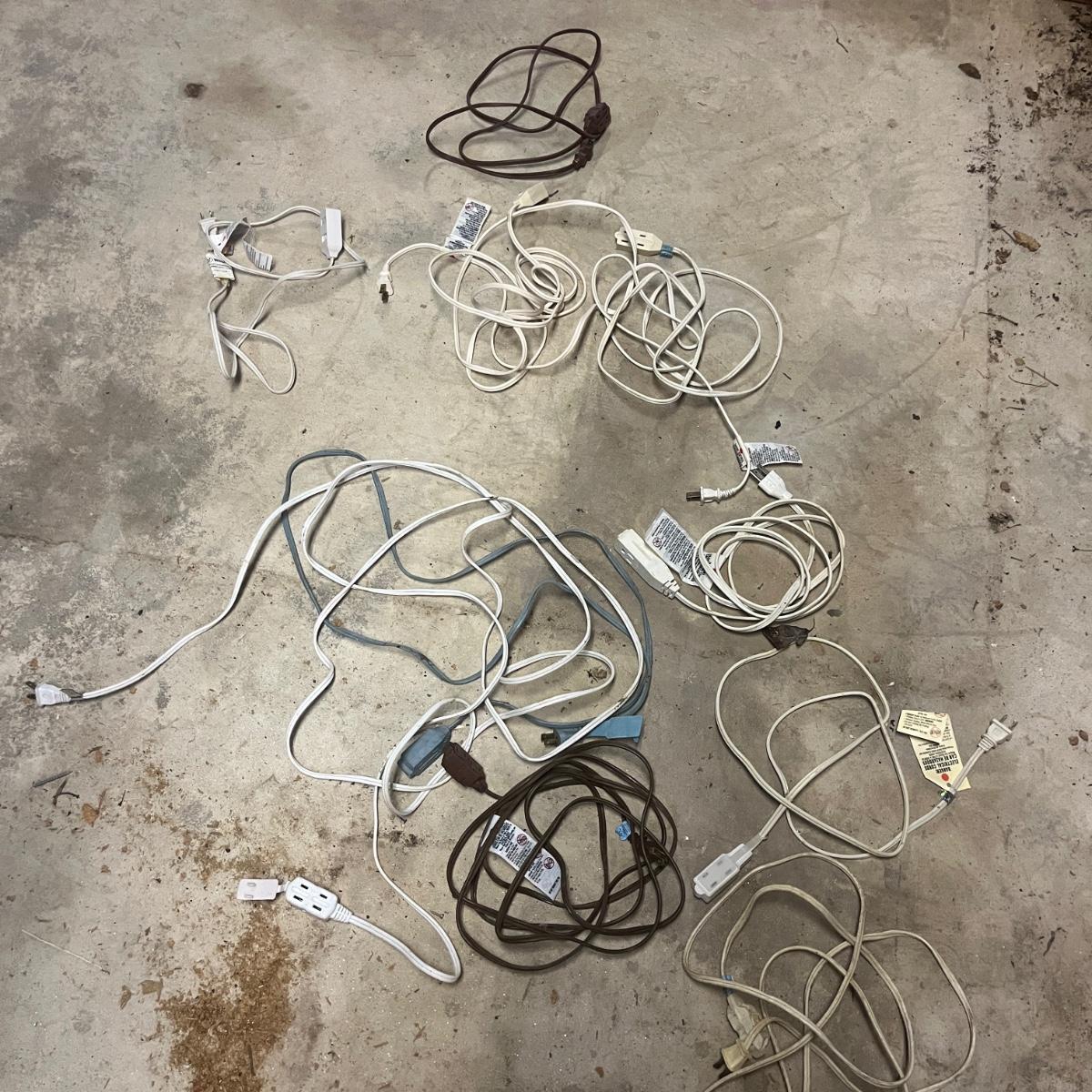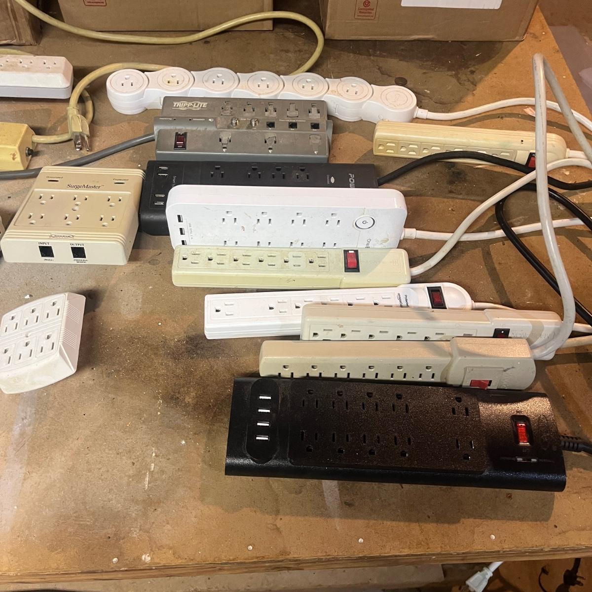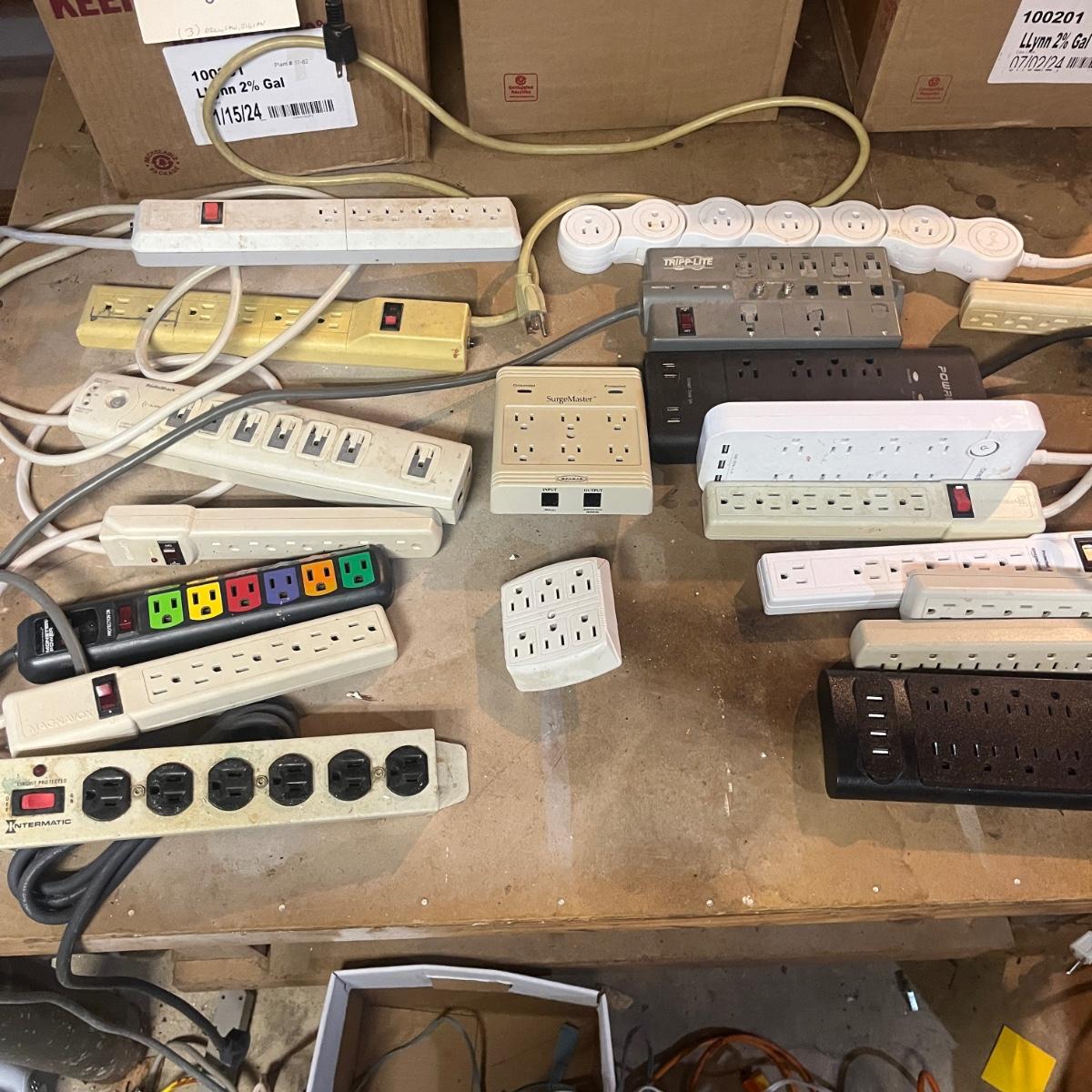 Lot includes over 15 power strips, ten indoor extension cords and three outdoor extension cords.