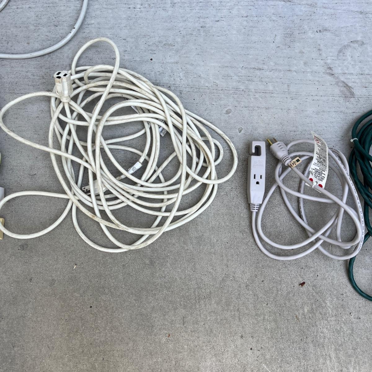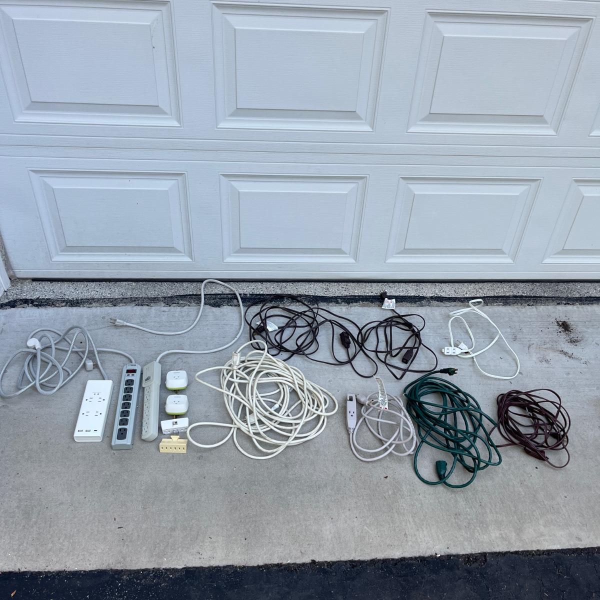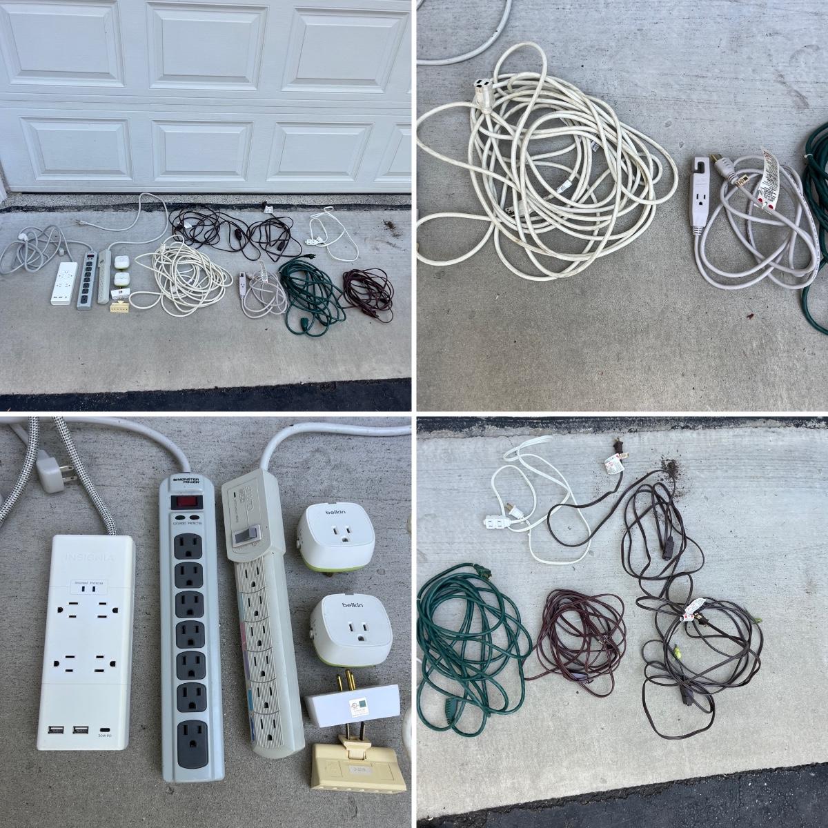 Lot includes three surge protectors, three outdoor extension cords, four indoor extension cords and more.