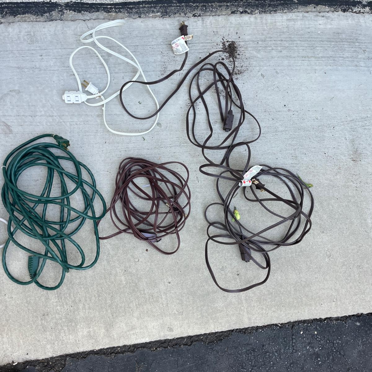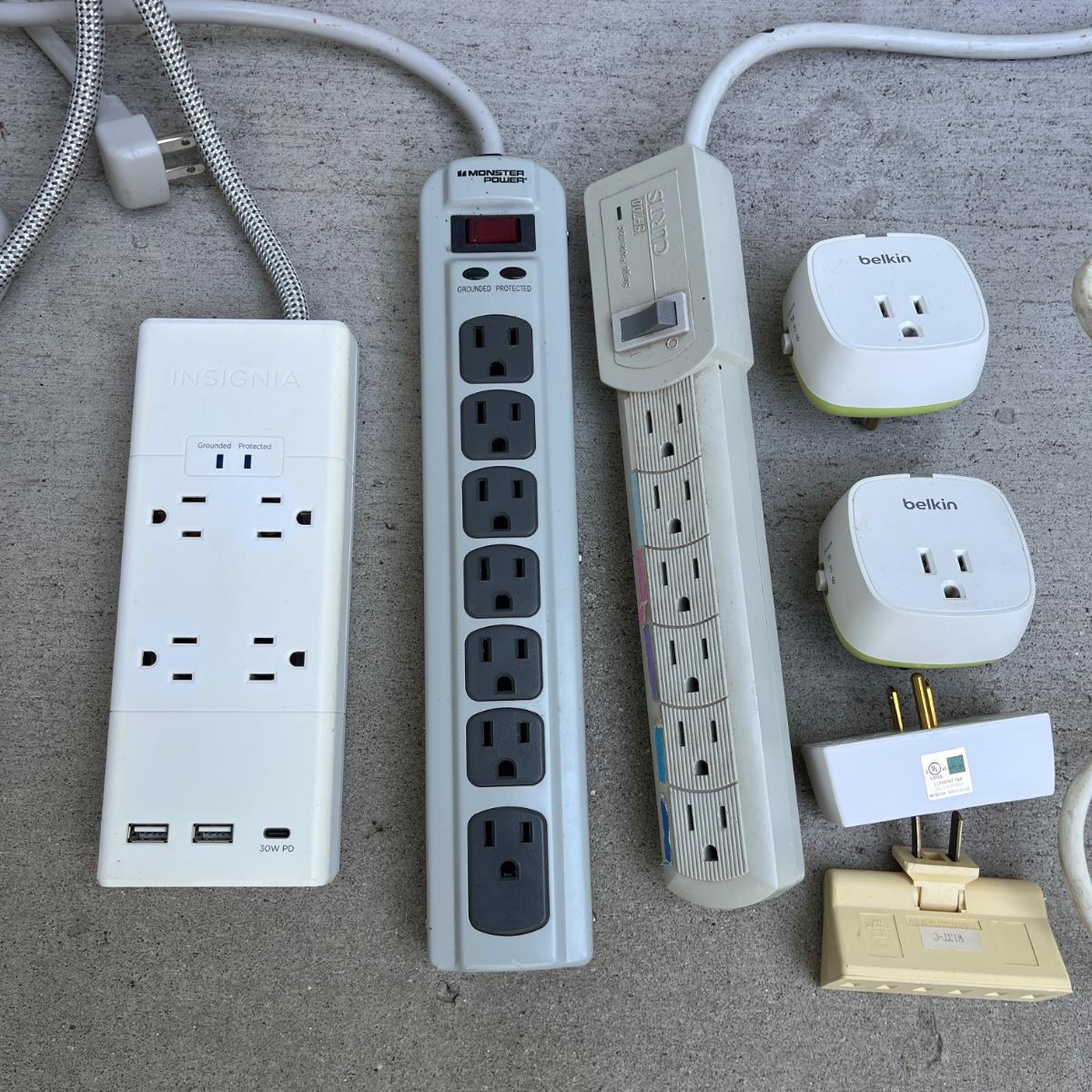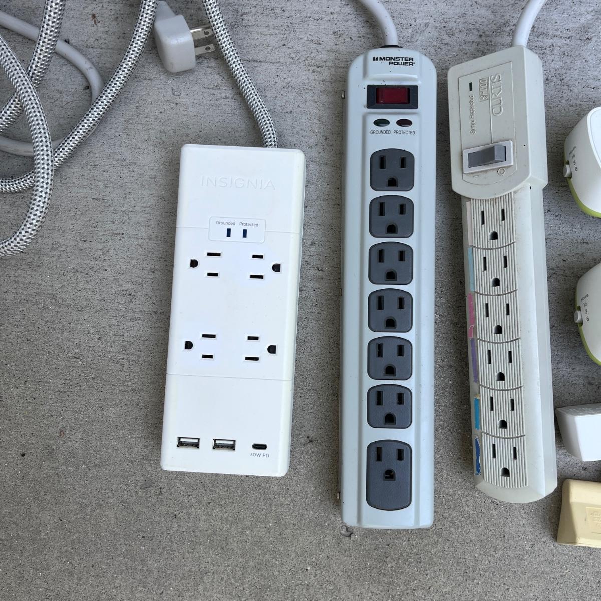 Lot includes three surge protectors, three outdoor extension cords, four indoor extension cords and more.