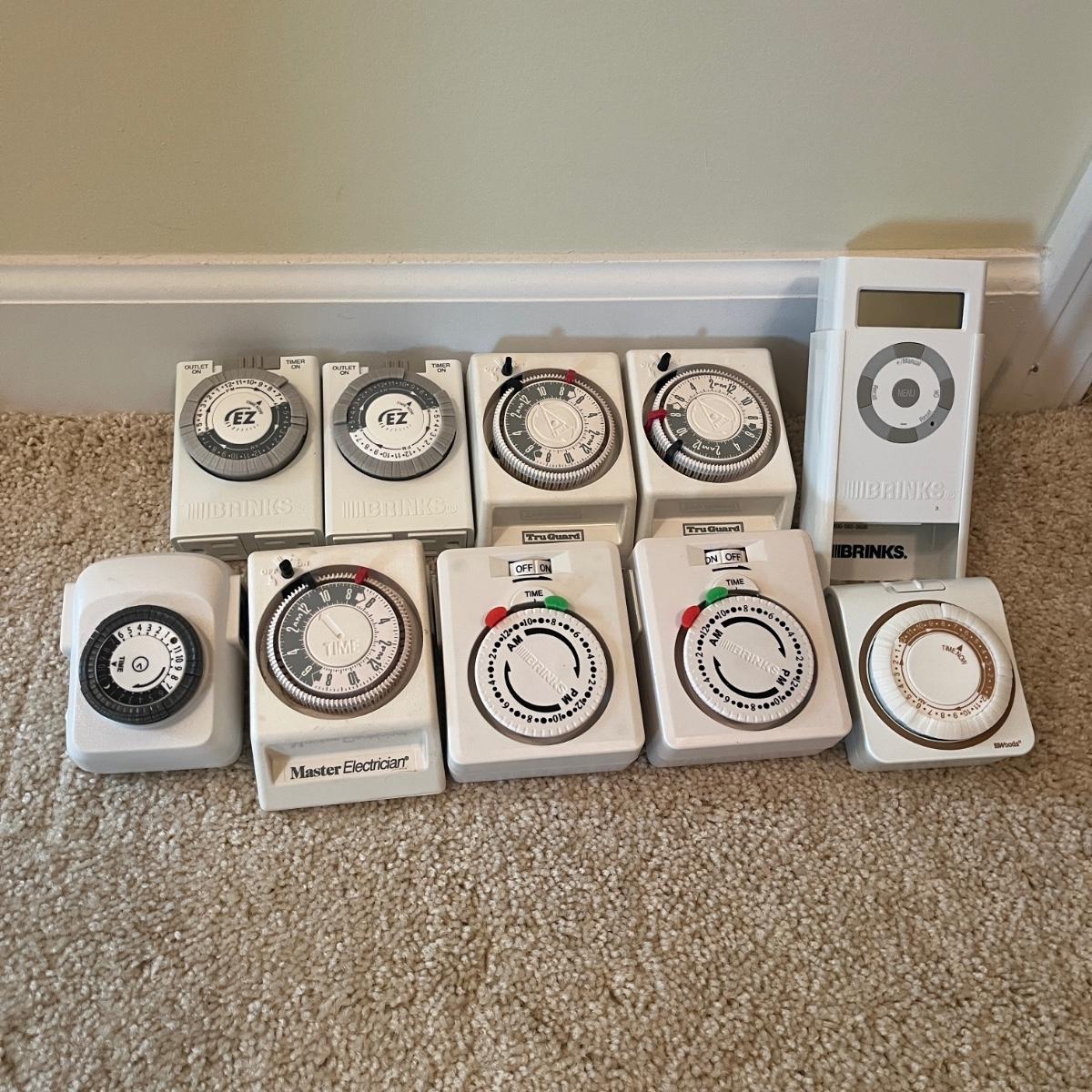 Lot includes a Monster and Belkin surge protector, eleven timers, power strip in its original packaging, and two nightlights.
