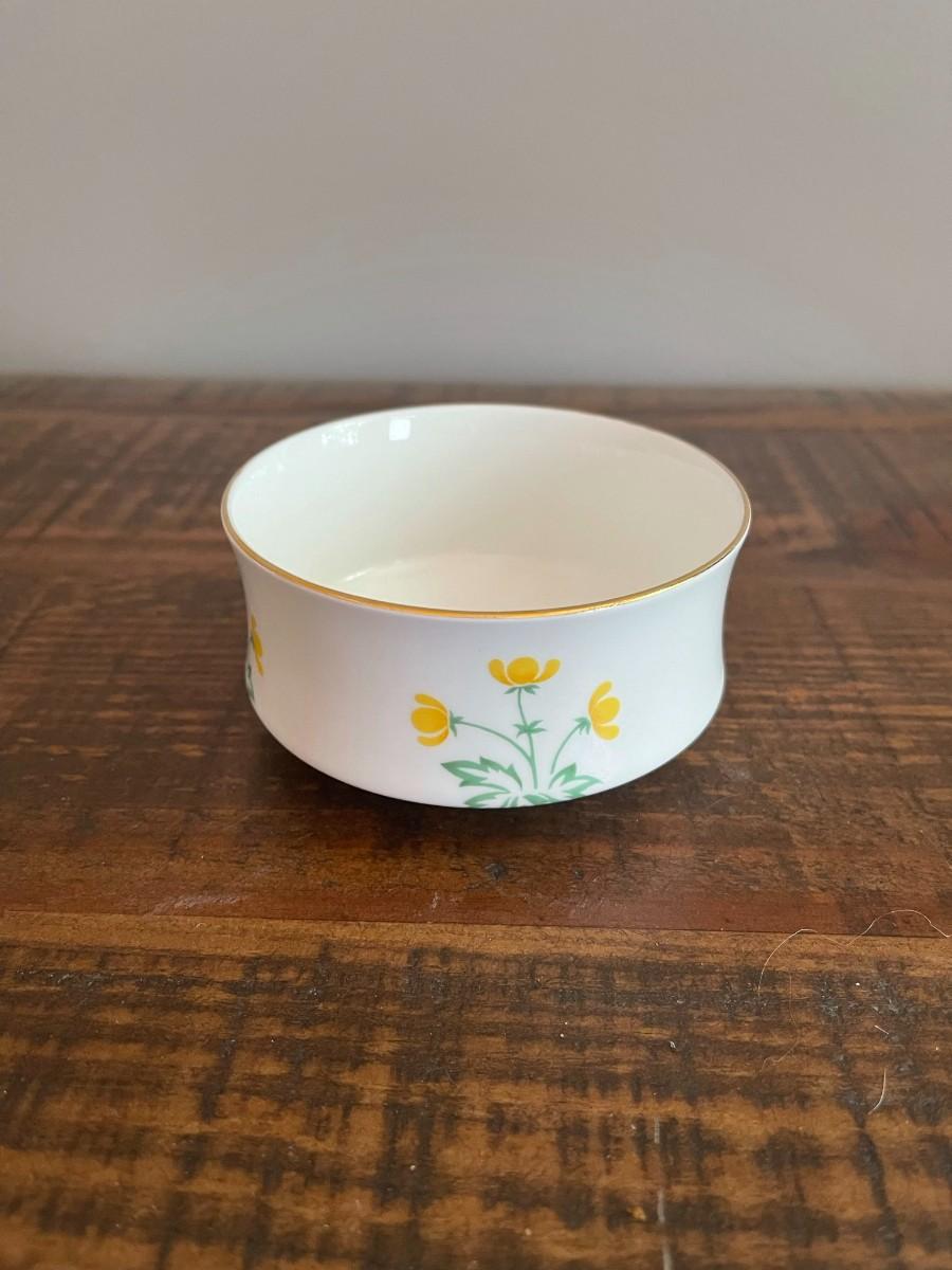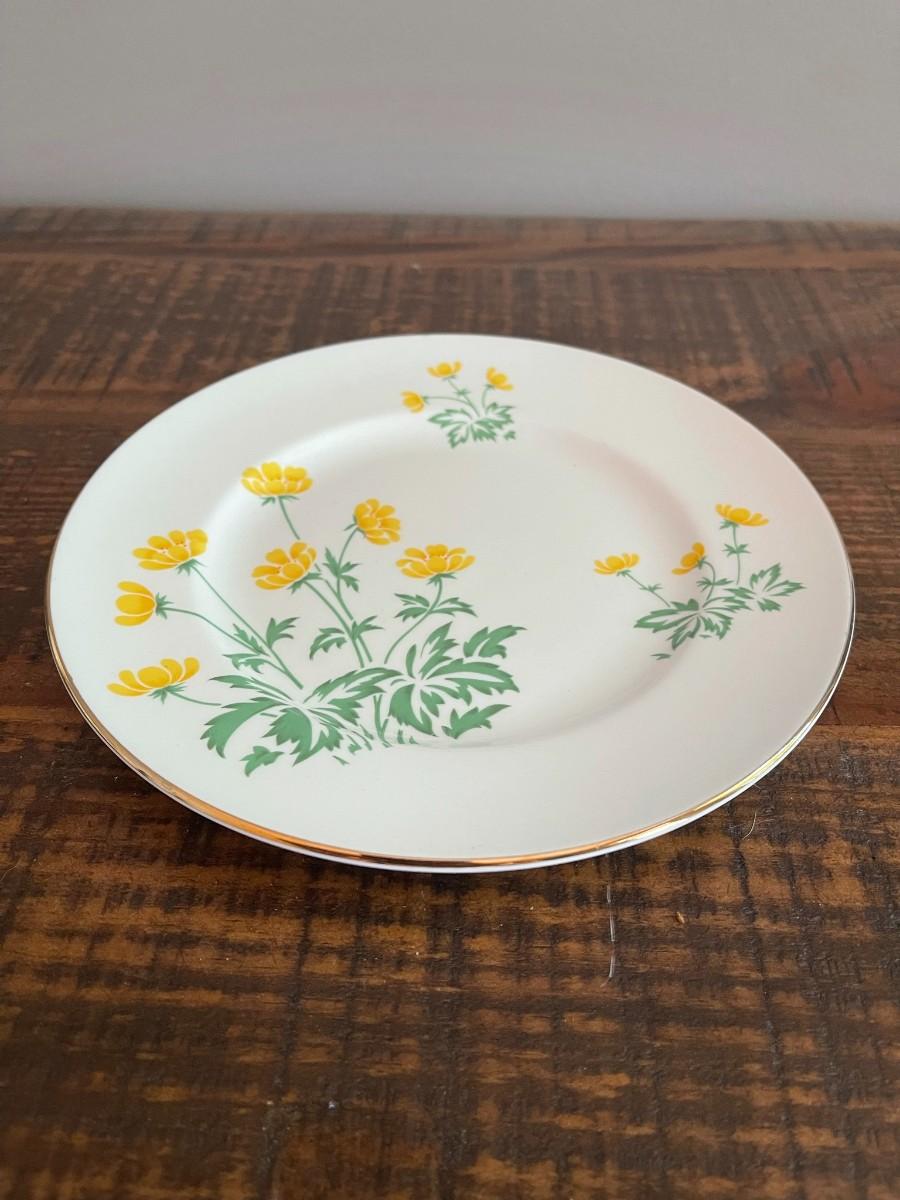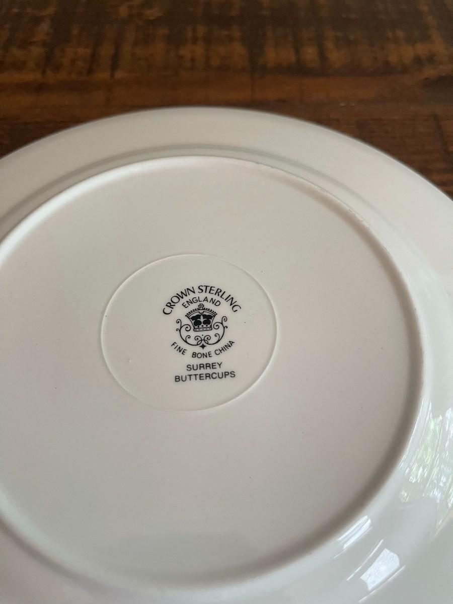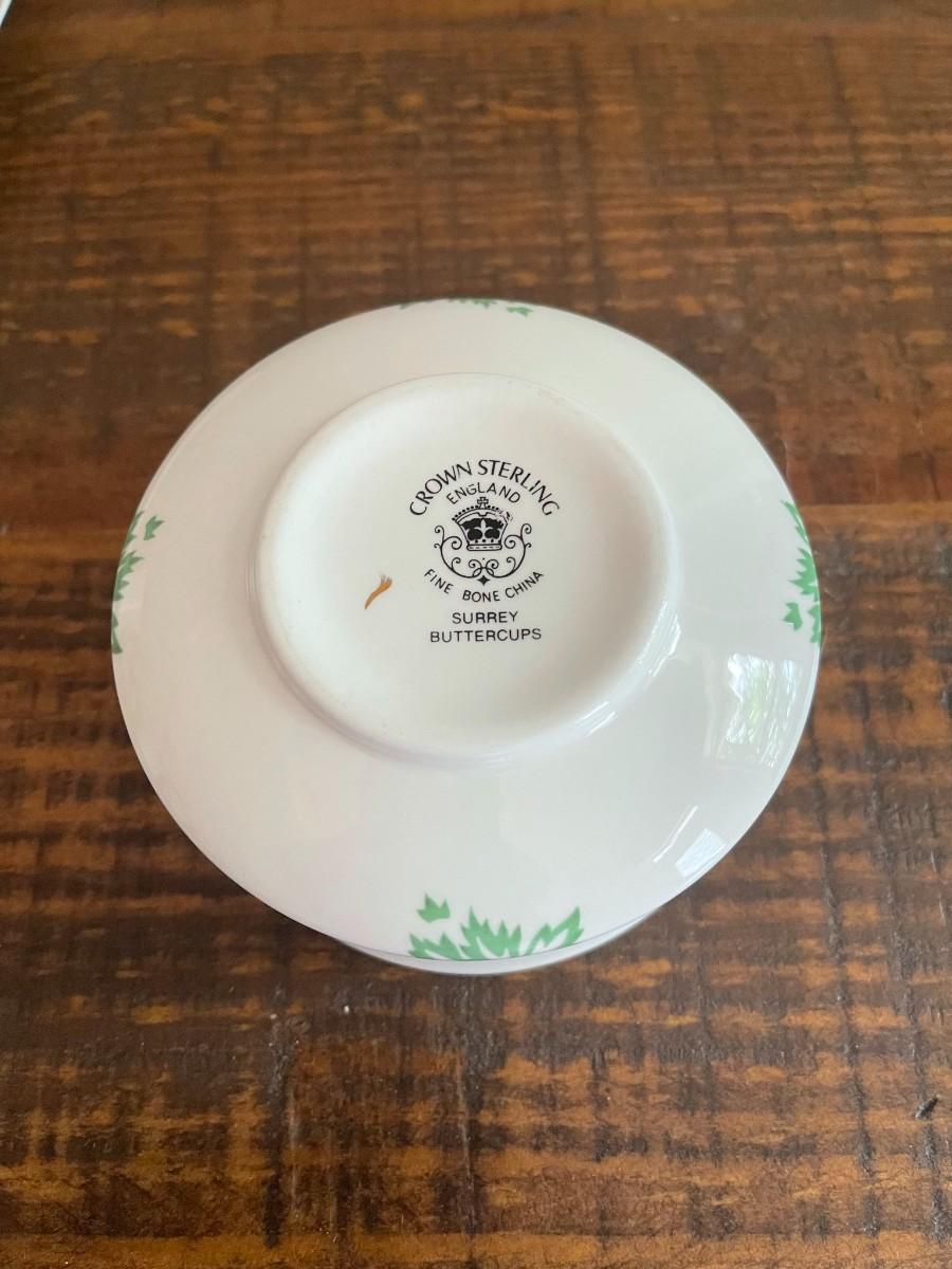 Beautiful set of Surrey Buttercups, Crown Sterling England, Fine Bone China - white with green and yellow accent colors; gold rim