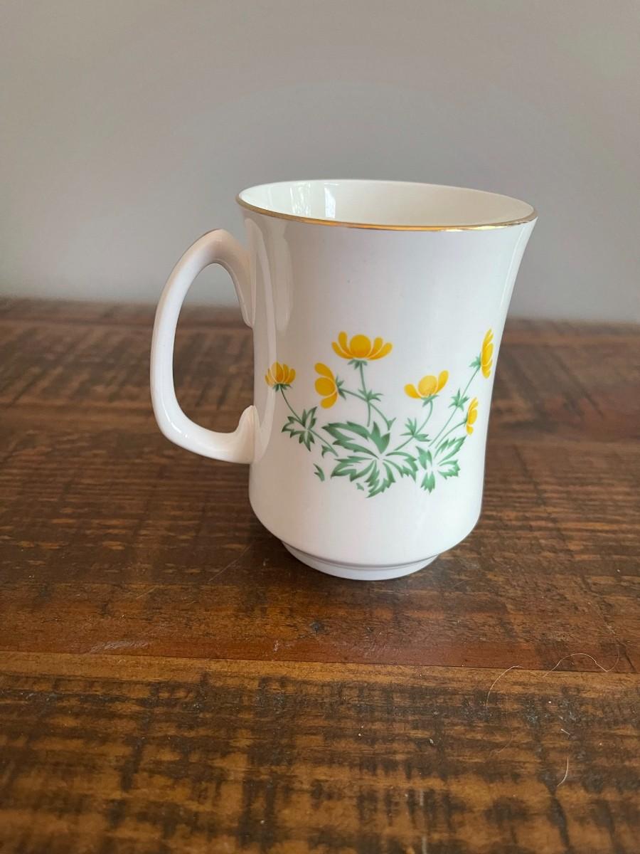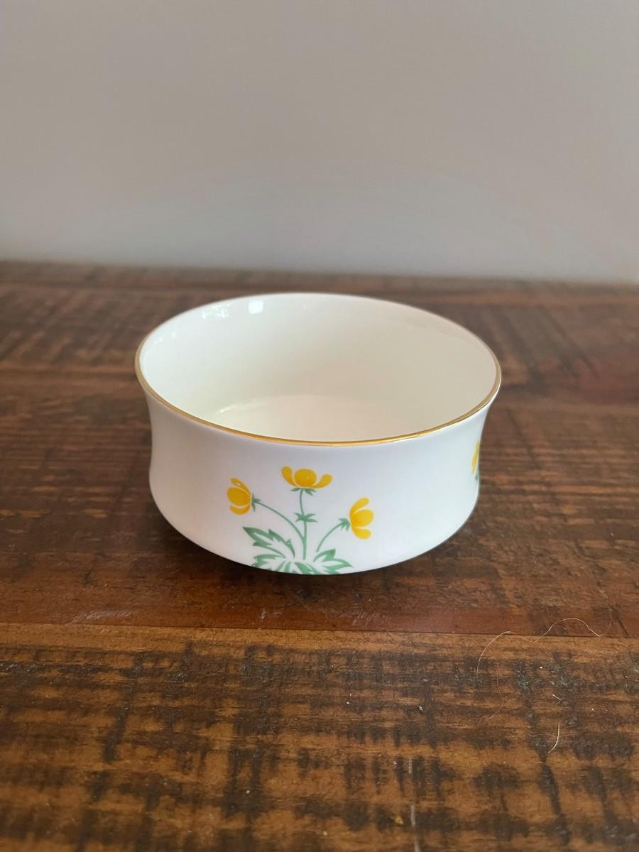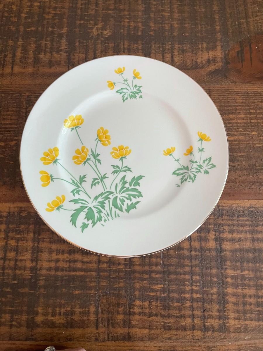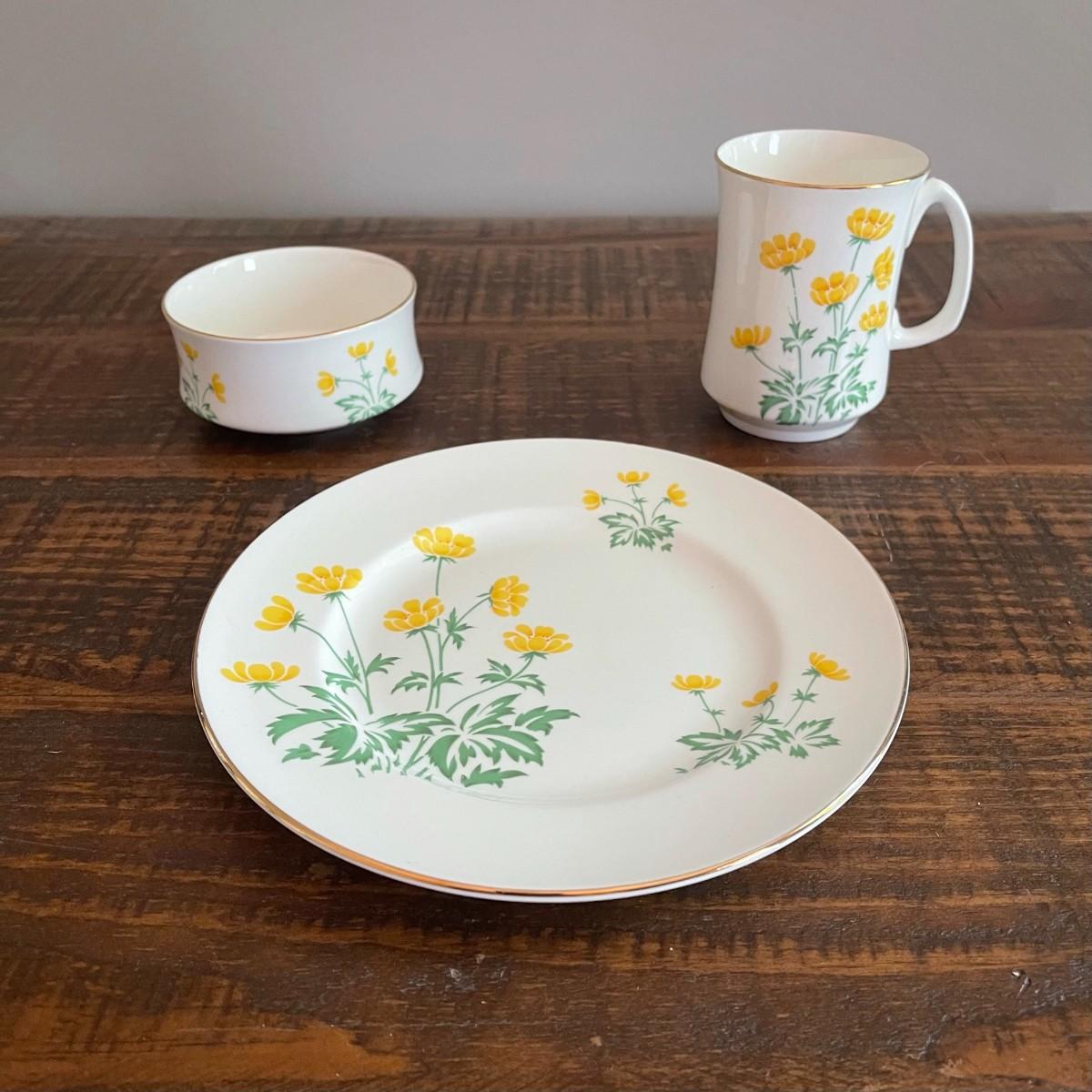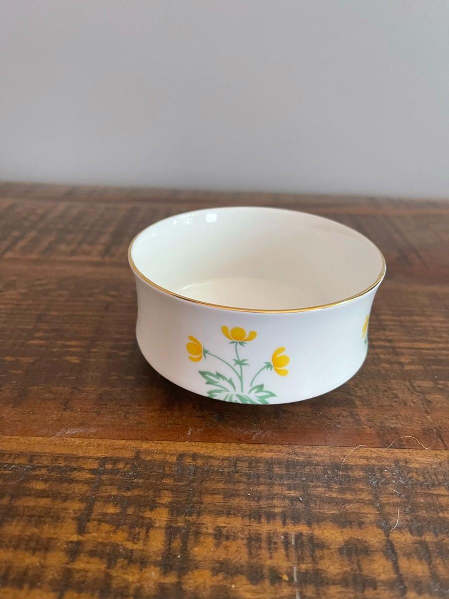 Beautiful set of Surrey Buttercups, Crown Sterling England, Fine Bone China - white with green and yellow accent colors; gold rim