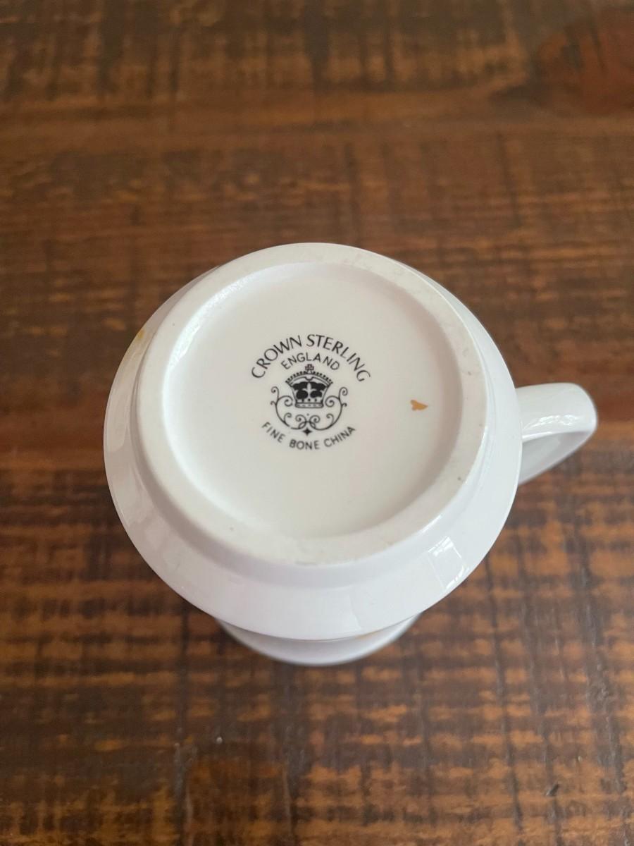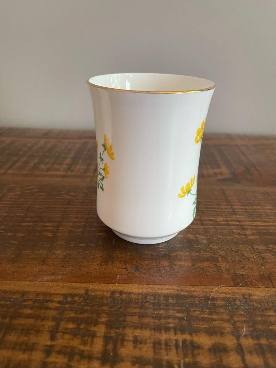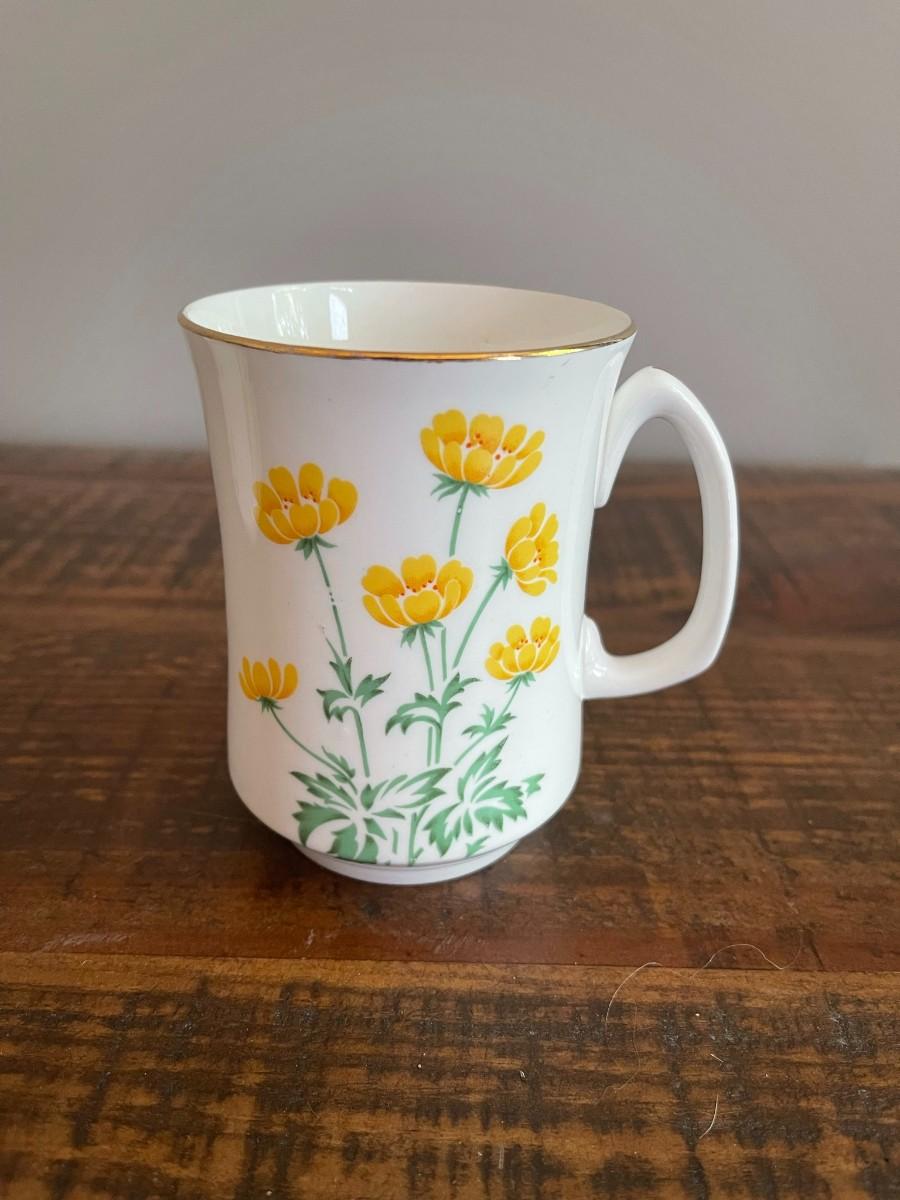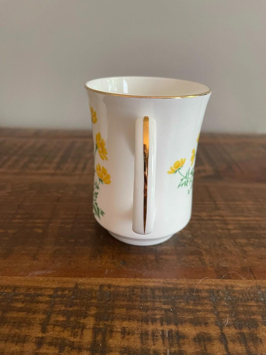 Beautiful set of Surrey Buttercups, Crown Sterling England, Fine Bone China - white with green and yellow accent colors; gold rim