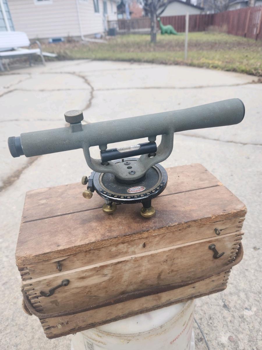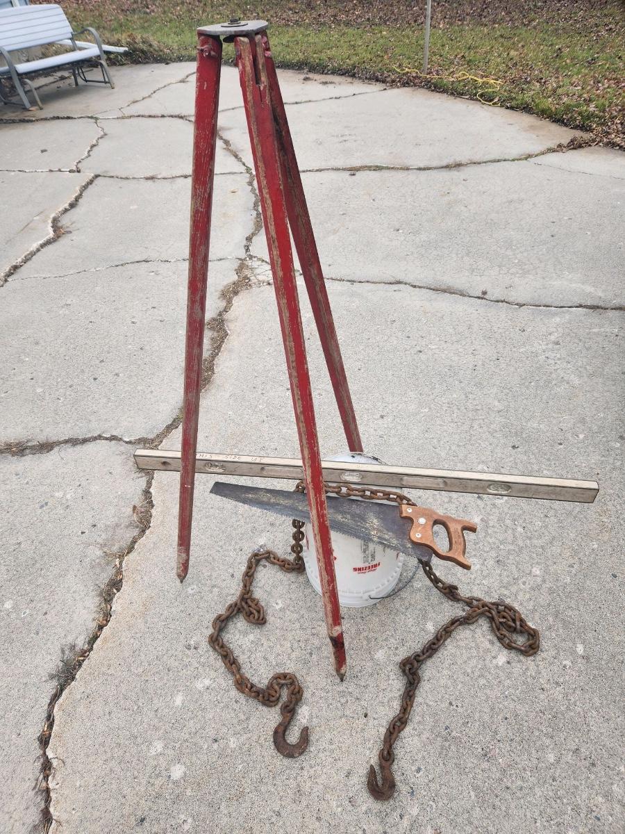 Vintage Craftsman survey level in case. Tripod, level, hand saw, and heavy chain.