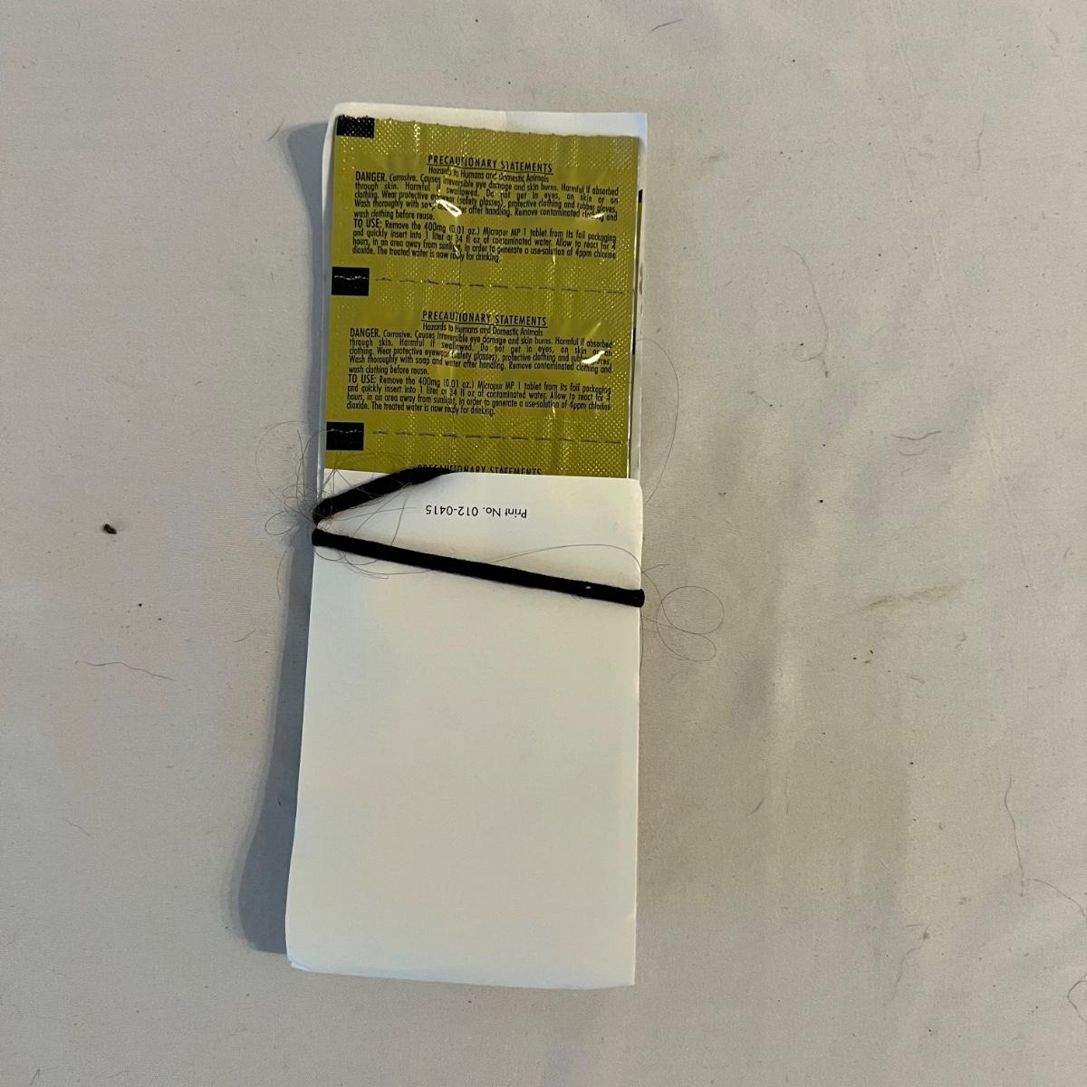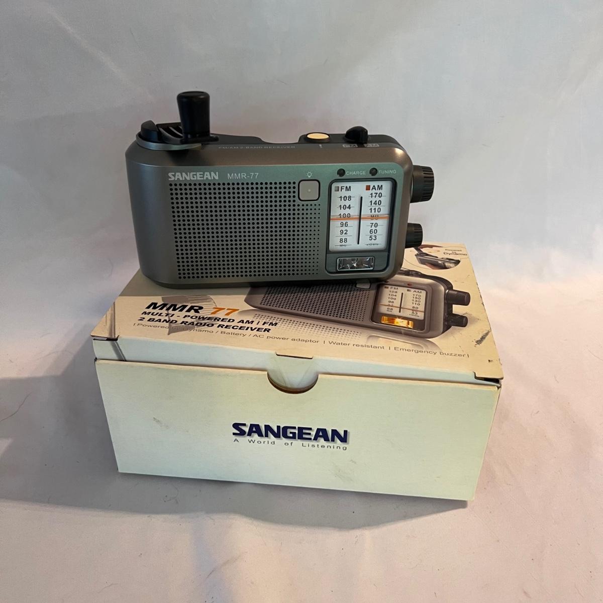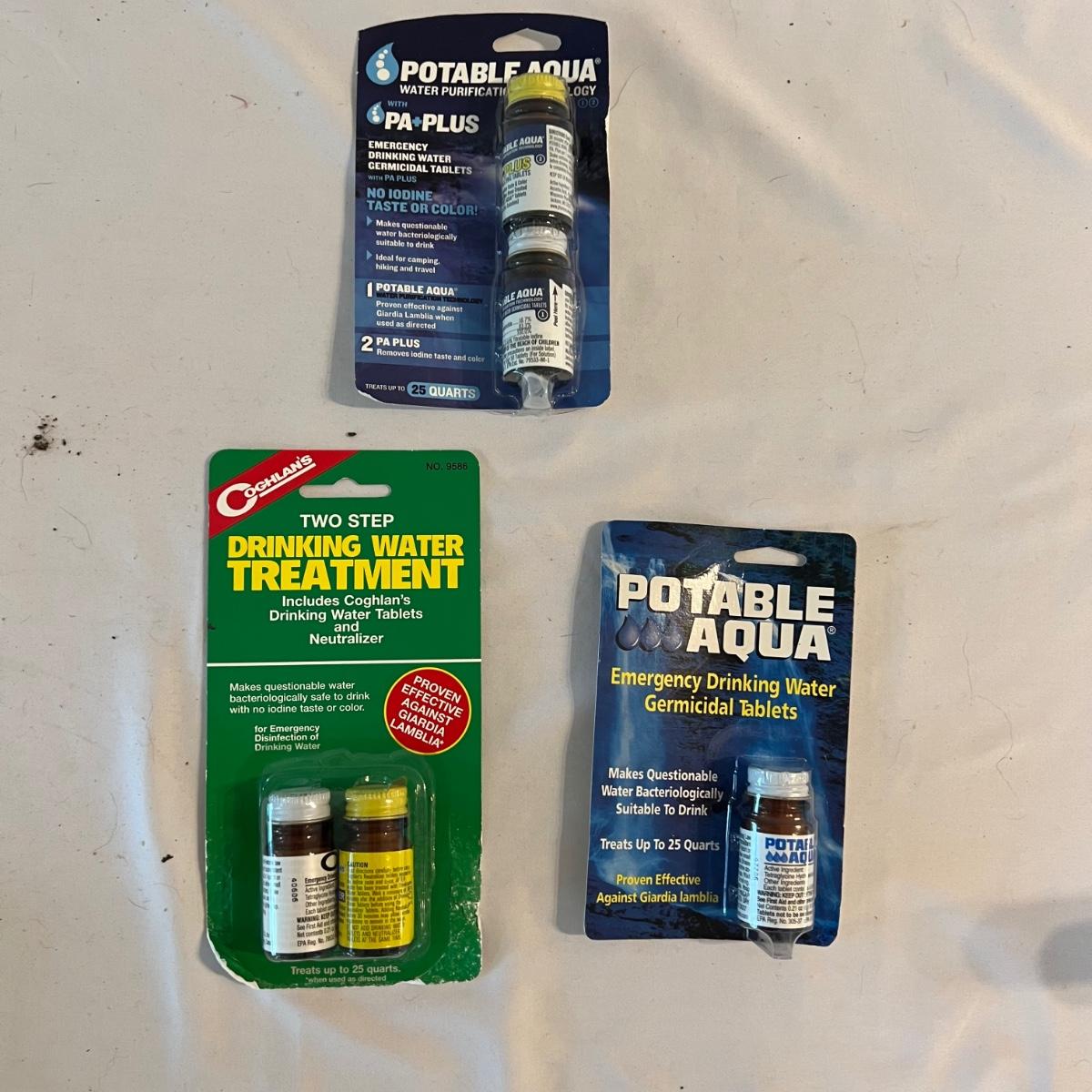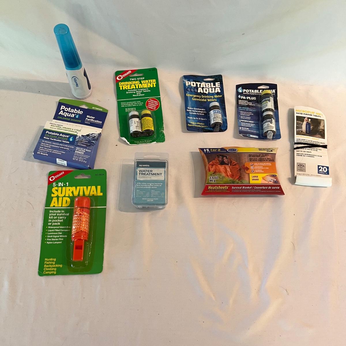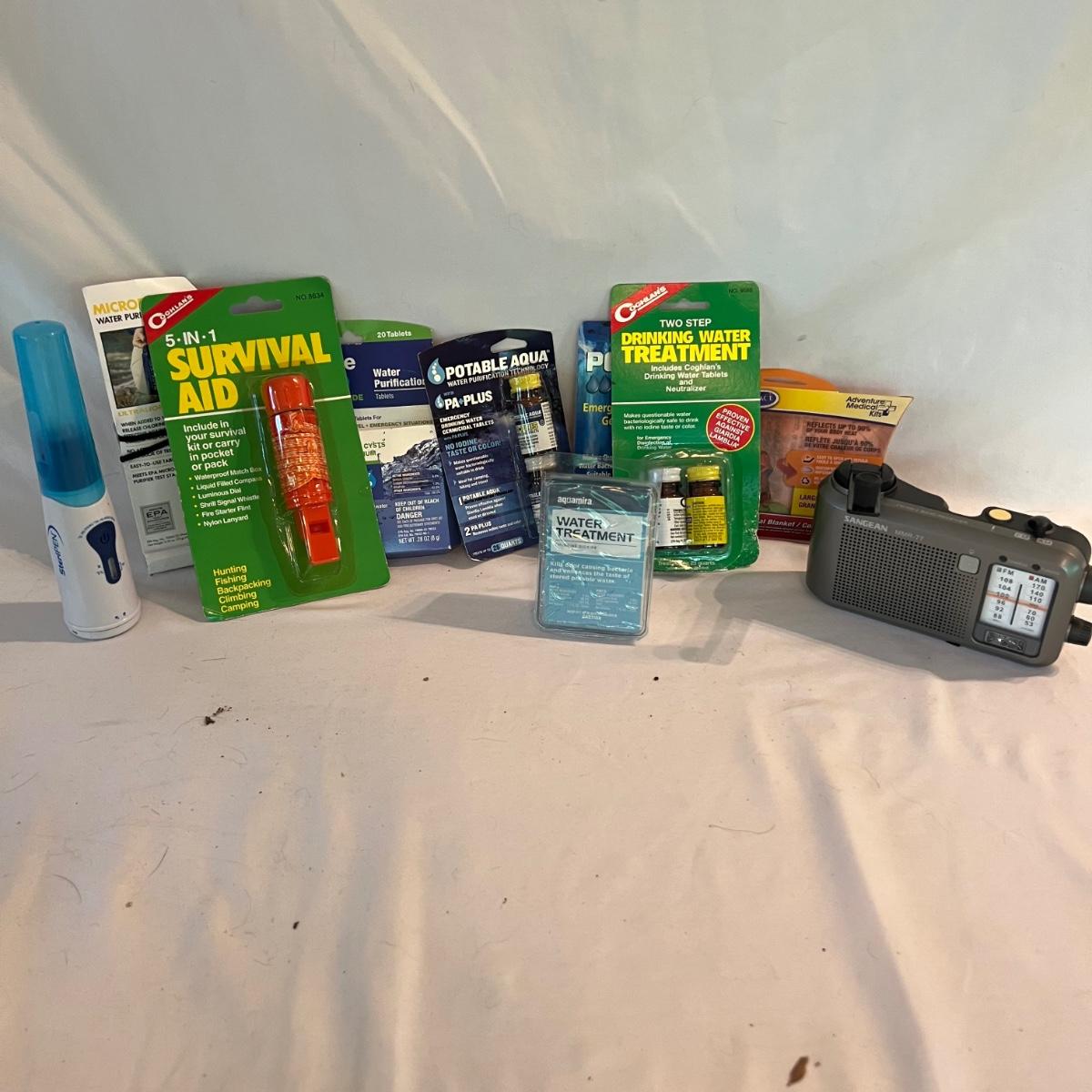 A collection of water, treatment, wet weather, and basic survival equipment. Includes Sangean MMR 77 multi-powered AM/FM, two band radio receiver which powers on when cranked. Also includes a SteriPEN UV water purifier, germicidal tablets, a 5-in-1 survival aid and a survival blanket.
