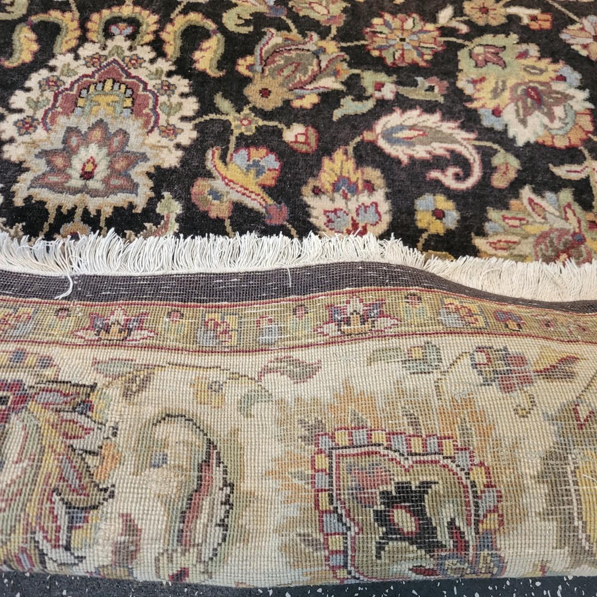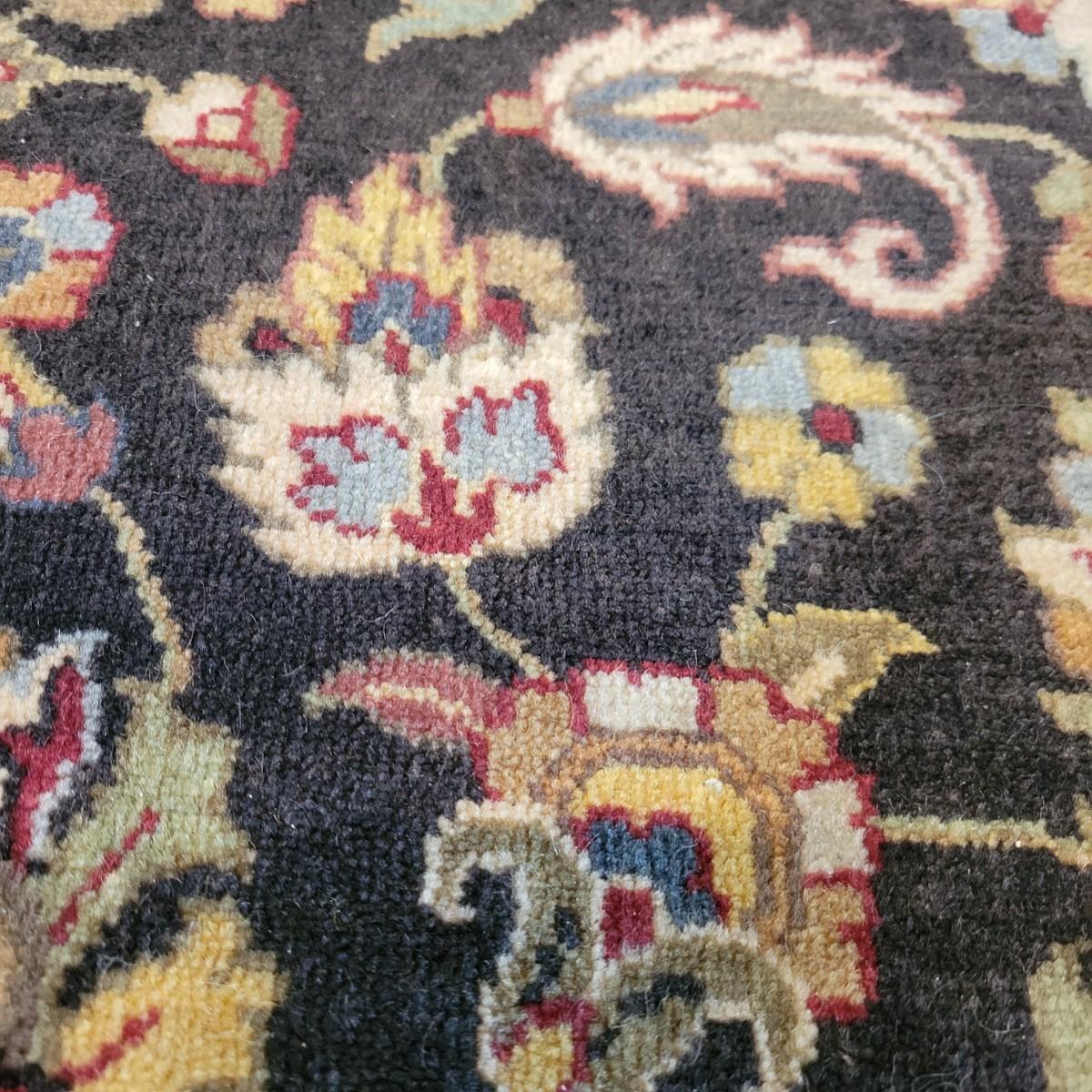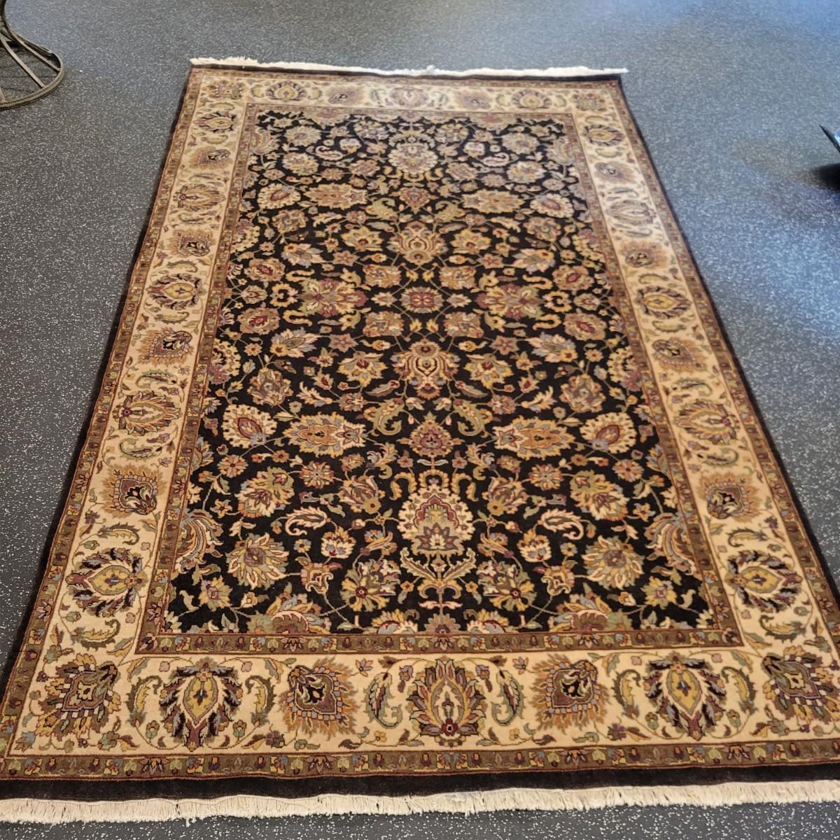 An area rug that the estate owner stated is a wool pile Surya Heirloom rug HLM-6001. It has a black background with an assortment of vivid accent colors. It measures approximately 8'8" x 5'5". This rug matches another larger rug in this auction. Local pickup only. Winning bidder must bring assistance to help move and load this item due to its weight and/or size.