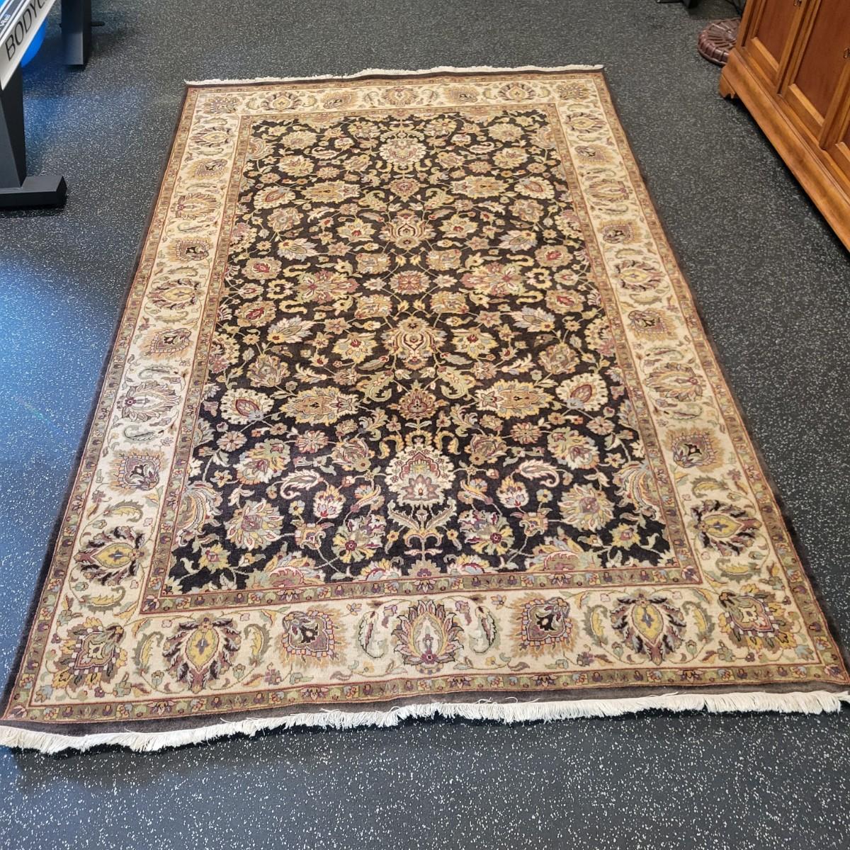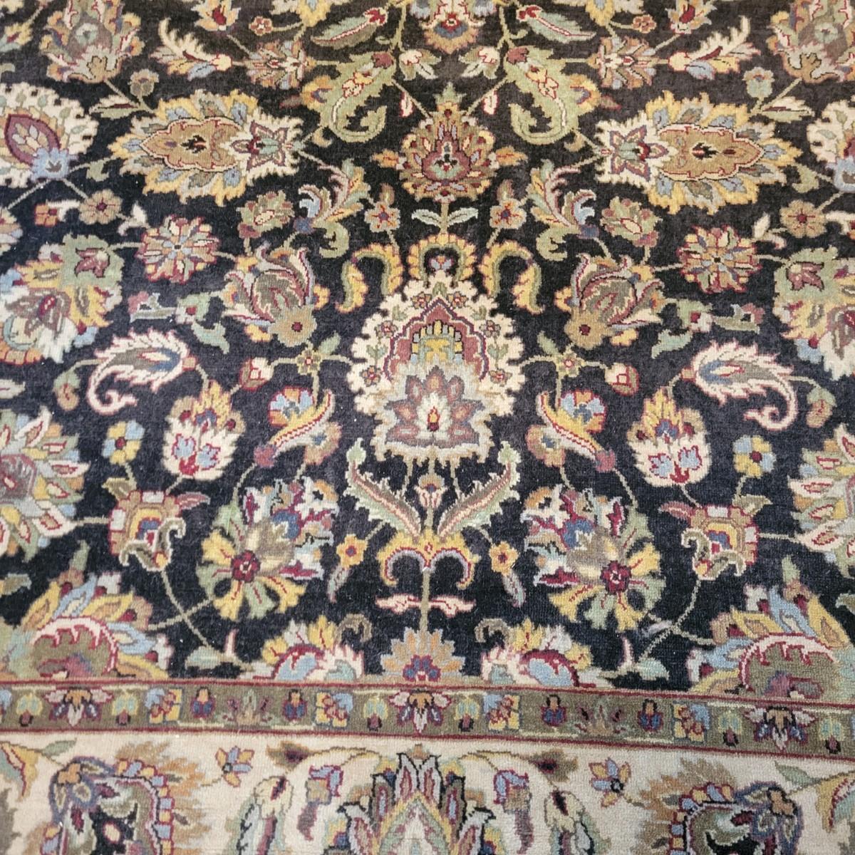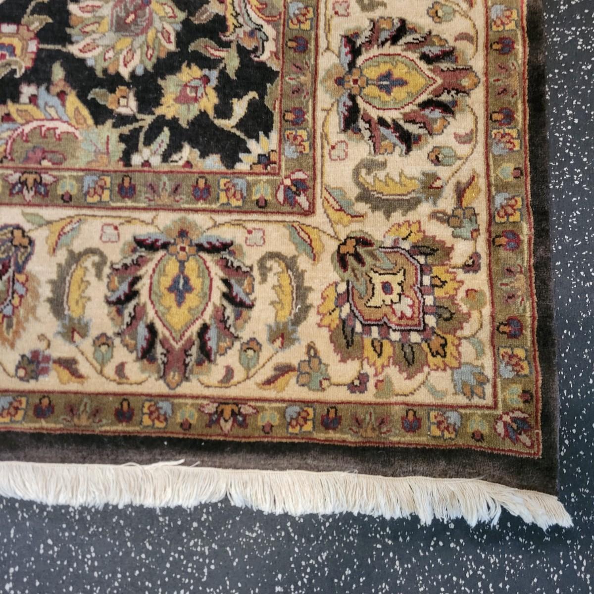 An area rug that the estate owner stated is a wool pile Surya Heirloom rug HLM-6001. It has a black background with an assortment of vivid accent colors. It measures approximately 8'8" x 5'5". This rug matches another larger rug in this auction. Local pickup only. Winning bidder must bring assistance to help move and load this item due to its weight and/or size.