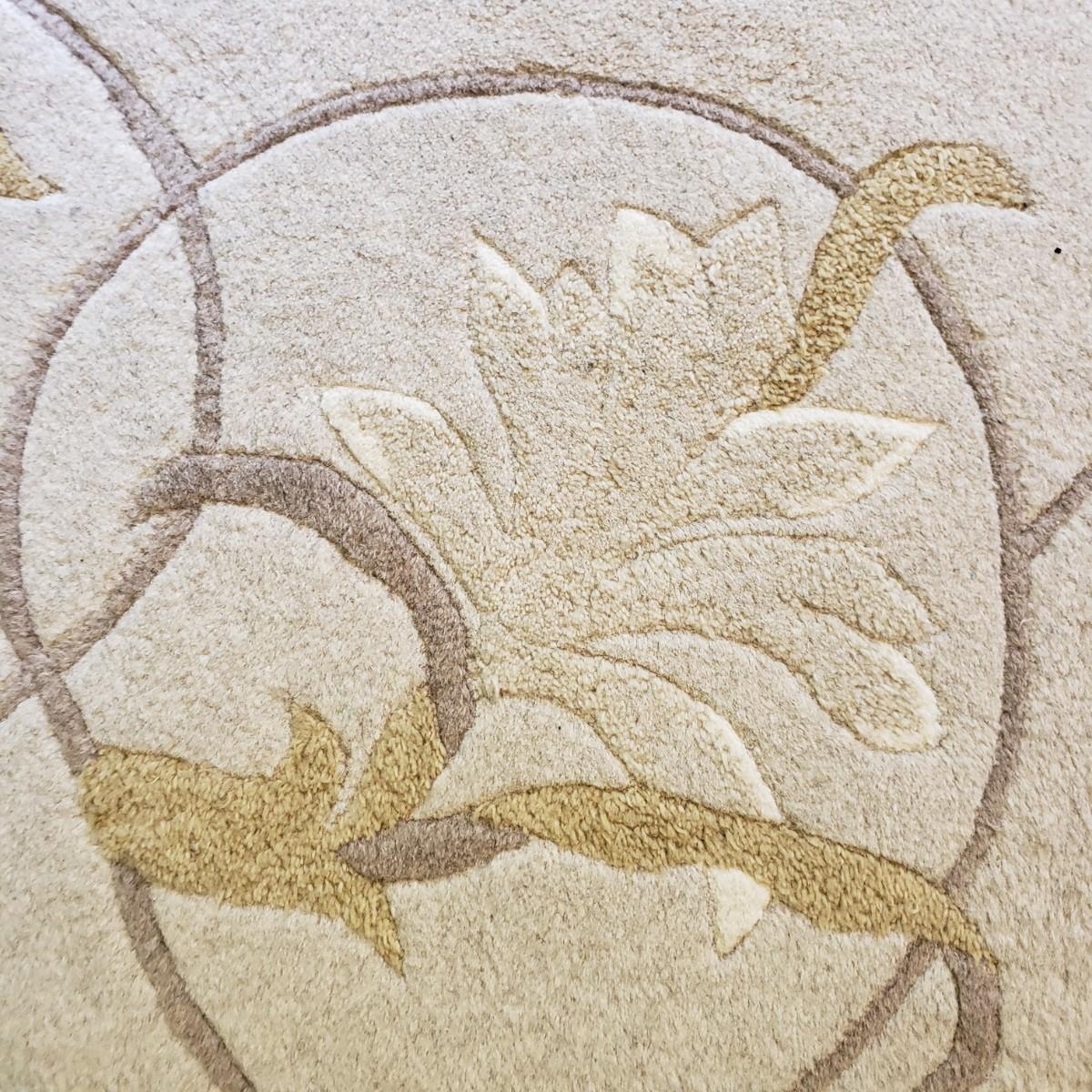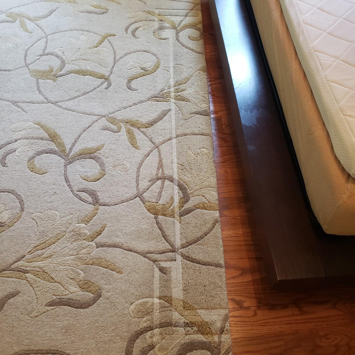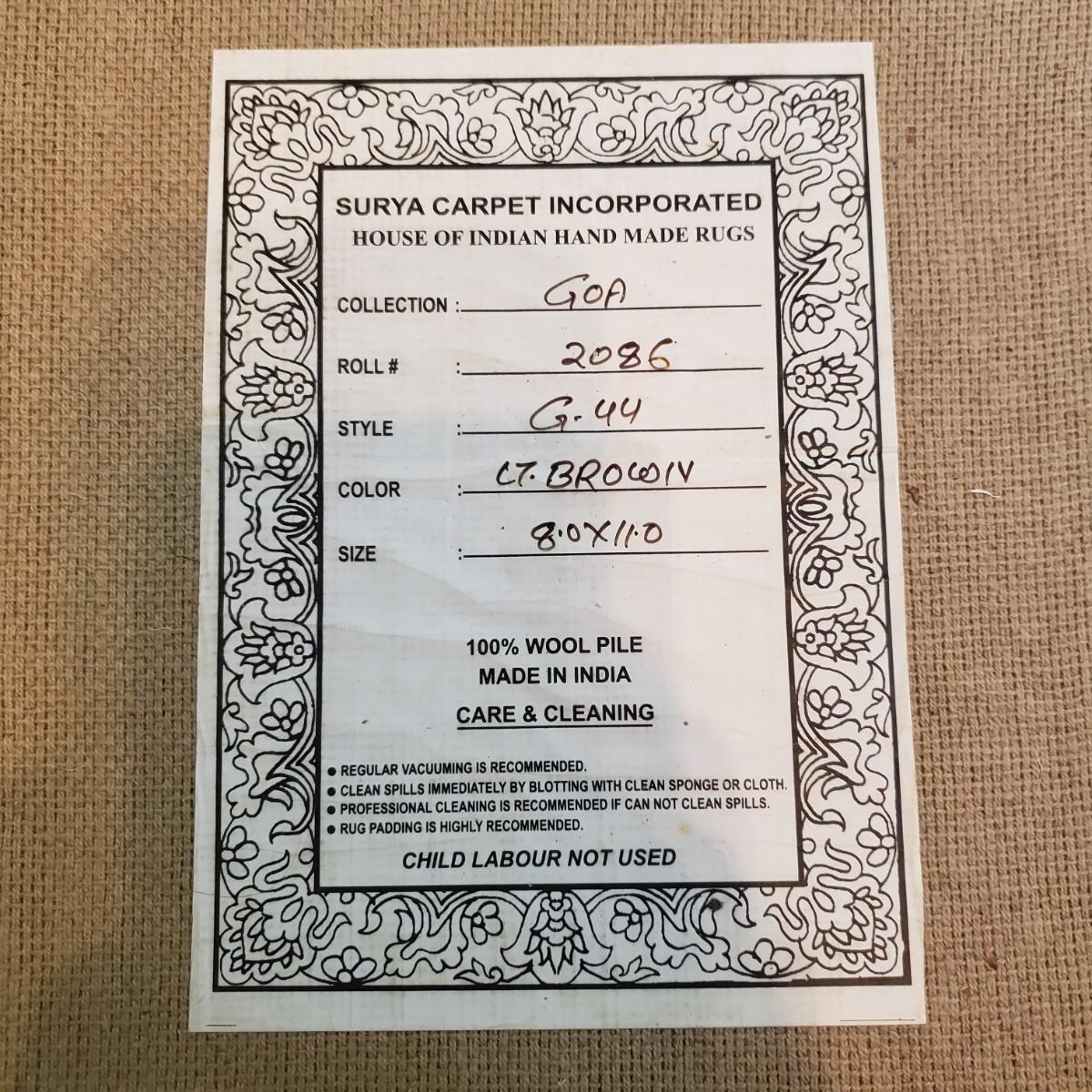 This is an 8' x 11' wool rug by Surya Carpet Incorporated. The rug is light brown, with darker brown swirls and golden swirls. The carpet does have indentation due to the bed frame, see picture.