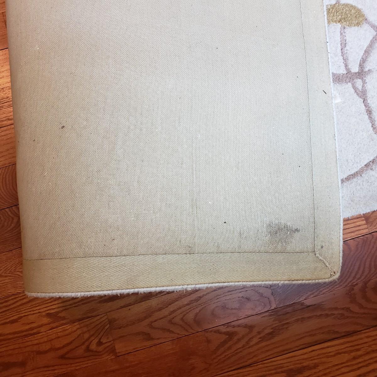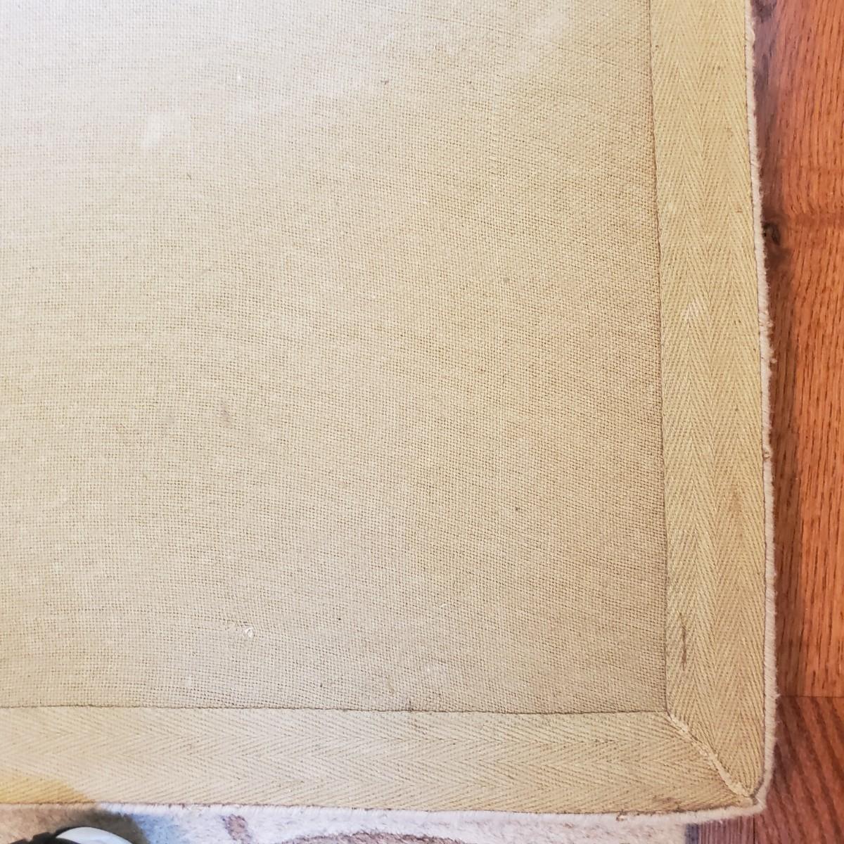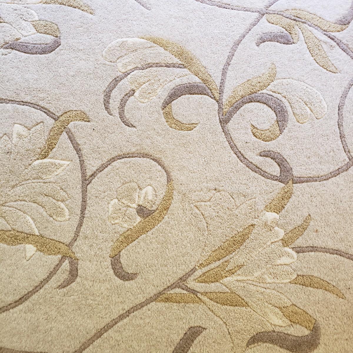 This is an 8' x 11' wool rug by Surya Carpet Incorporated. The rug is light brown, with darker brown swirls and golden swirls. The carpet does have indentation due to the bed frame, see picture.