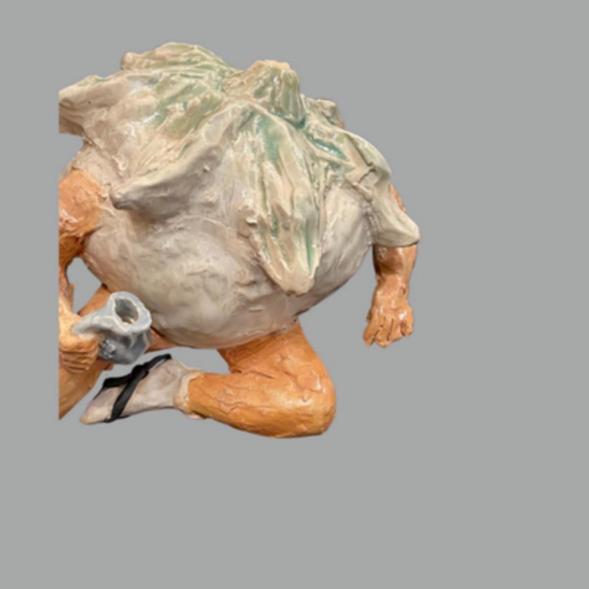 Susan Bergman earned her Master’s degree in American Literature from Tulane, but all she really wanted to do was make things out of clay. Her work can be seen and purchased in NOMA museum shop. This particular collection mixes vegetables with animals and humans. All one of a kind pieces. Her materials are Sgraffito, colored slips, transfers, and paper resist patterns create depth and texture on handbuilt surfaces. Stoneware and mid-range terra cotta primarily built with slabs or coils.