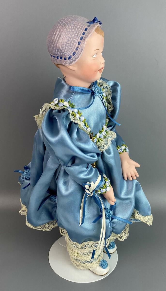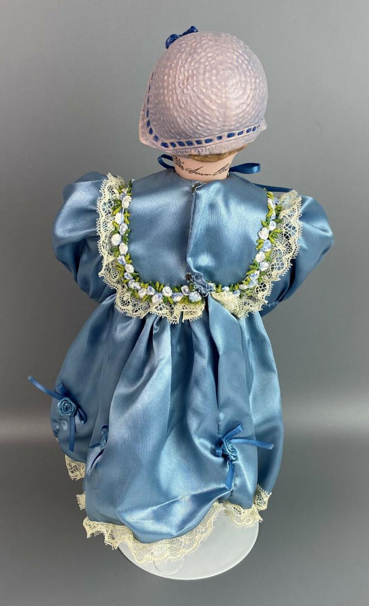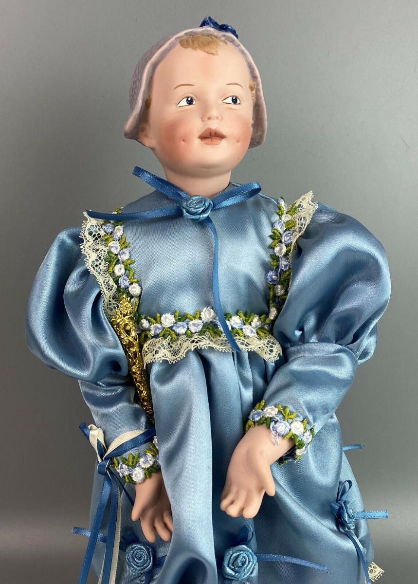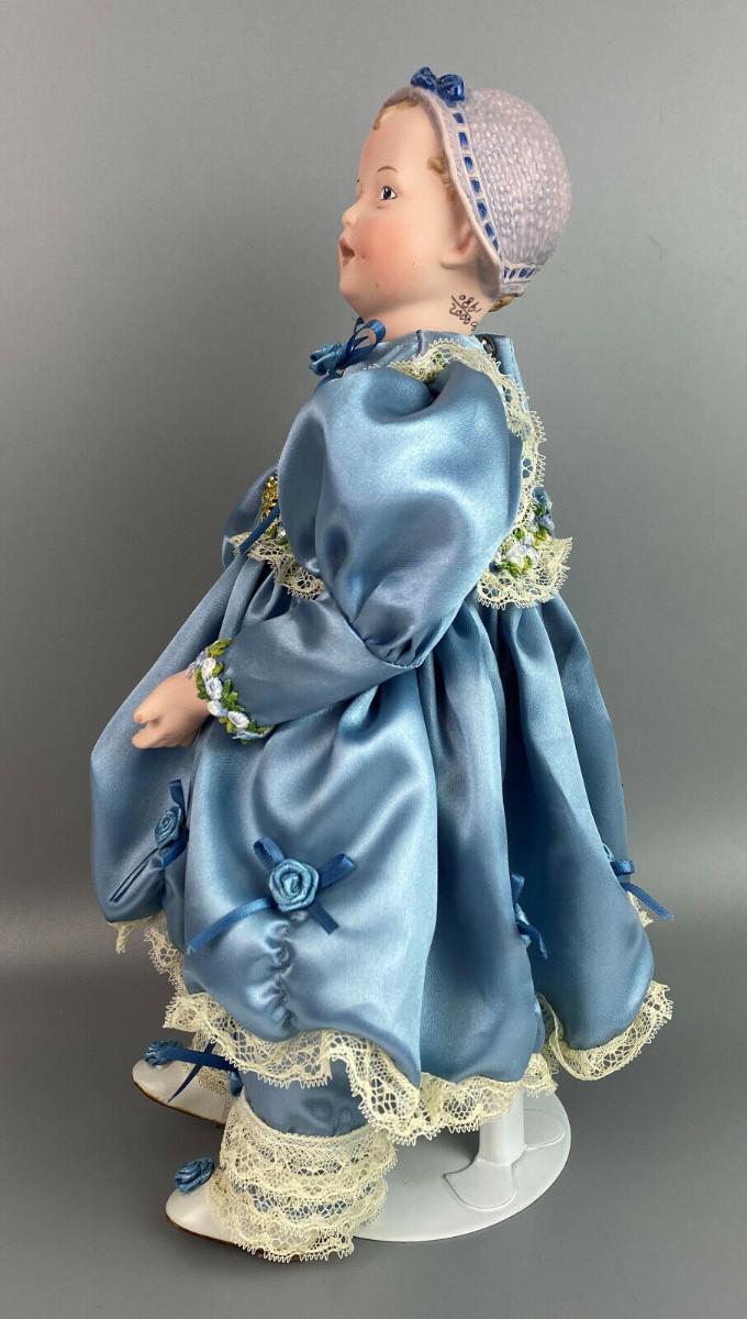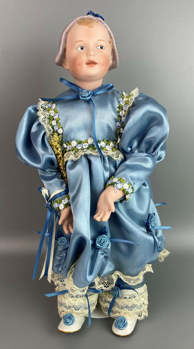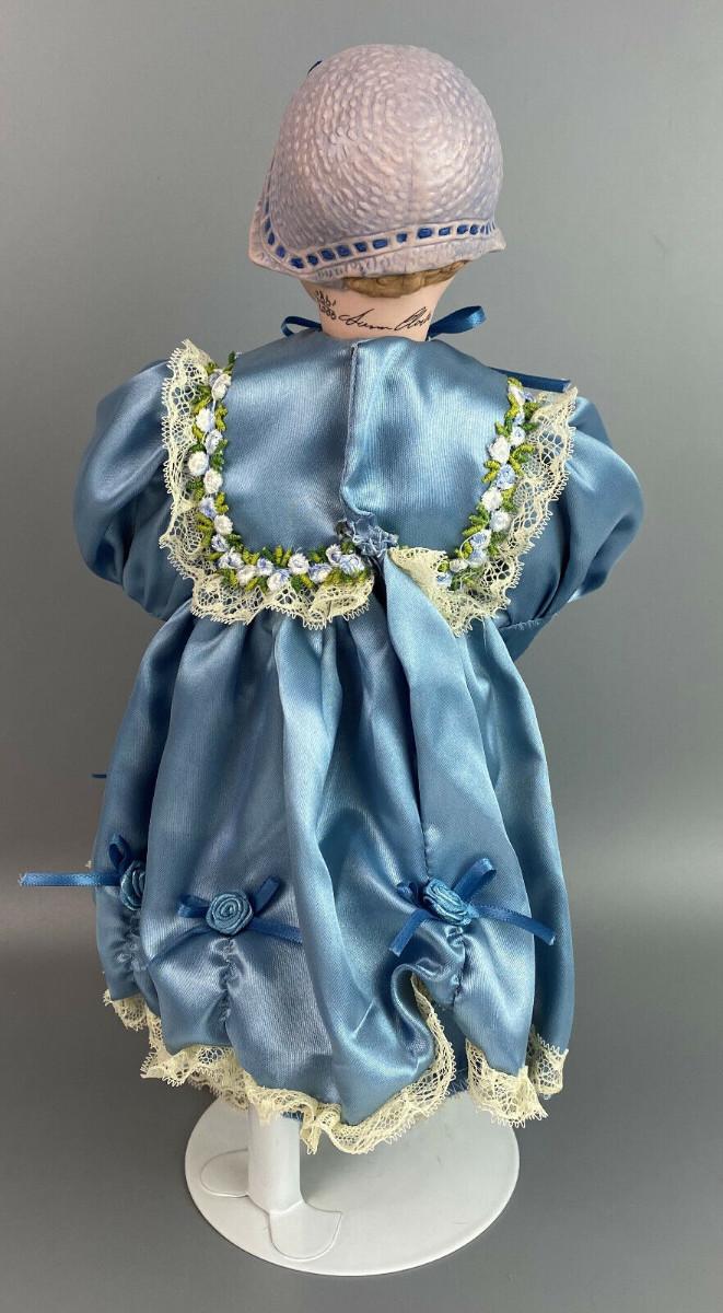 This collector doll by artist Susan Clarke measures 14" tall, the porcelain toddler is clothed in a Victorian blue satin dress trimmed with lace and flowers and matching blue pantaloons..handpainted molded porcelain head...Limited edition #861/2000...Excellent condition...From a collector's estate...Stand included.