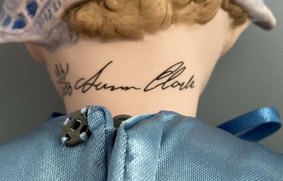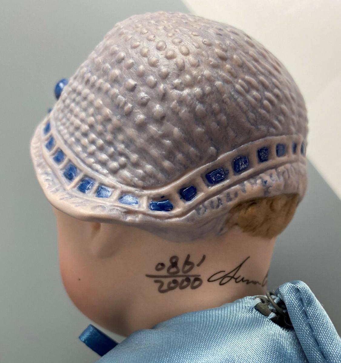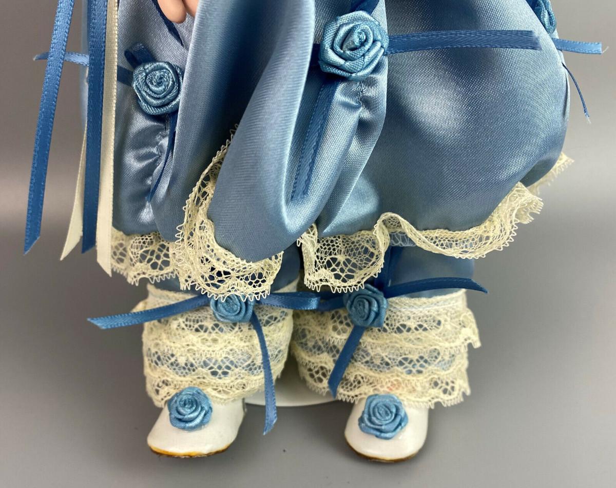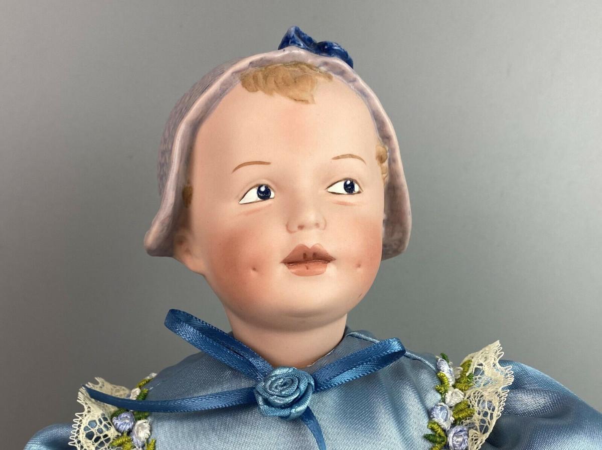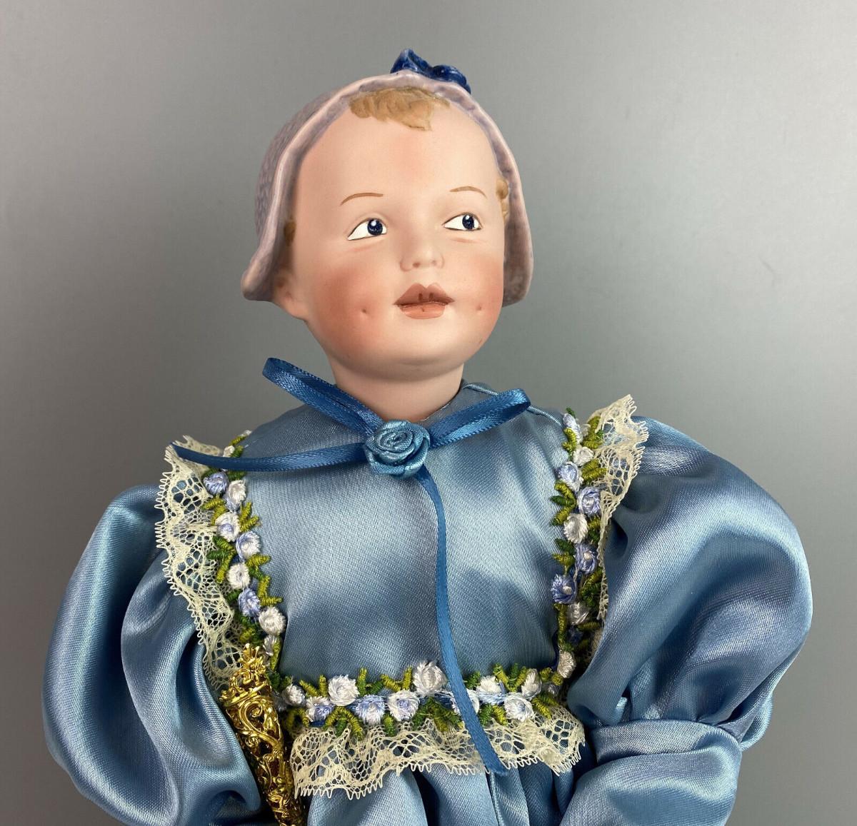 This collector doll by artist Susan Clarke measures 14" tall, the porcelain toddler is clothed in a Victorian blue satin dress trimmed with lace and flowers and matching blue pantaloons..handpainted molded porcelain head...Limited edition #861/2000...Excellent condition...From a collector's estate...Stand included.