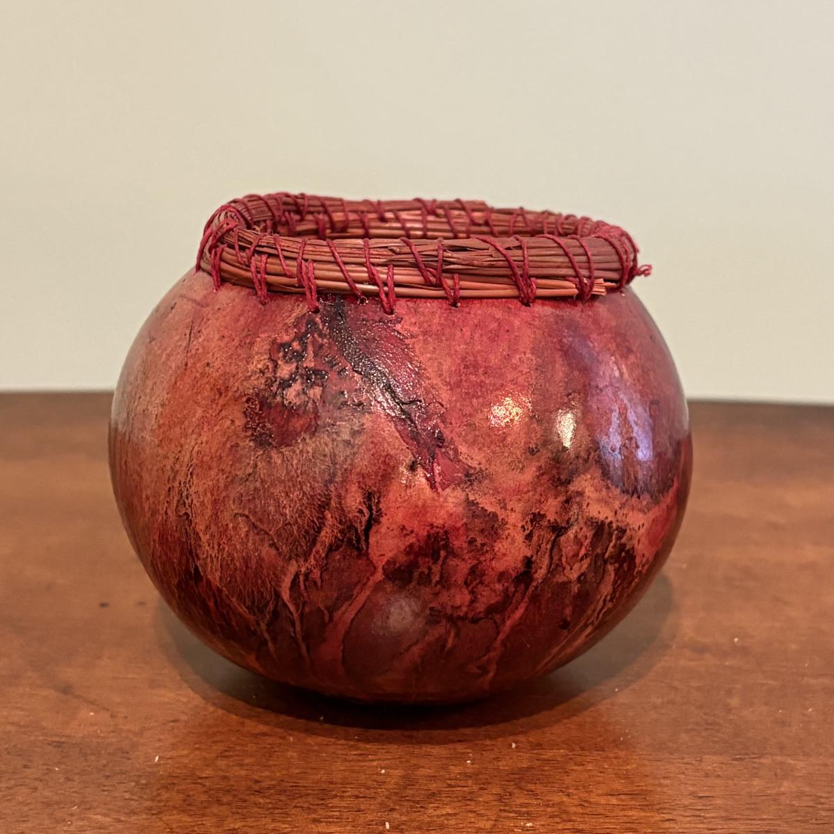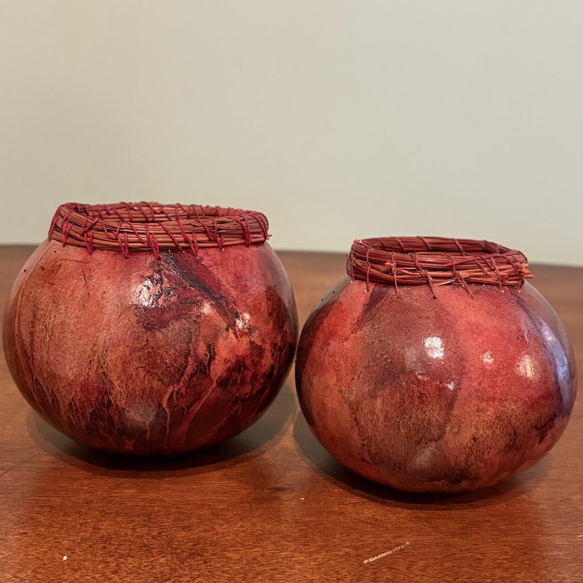 This set of two decorative gourds were made by local artist Susan Davis from Sylva, NC. The measurements of the bigger one are approximately 3"D x 4"H and of the smaller one are 2"D x 3.5"H.