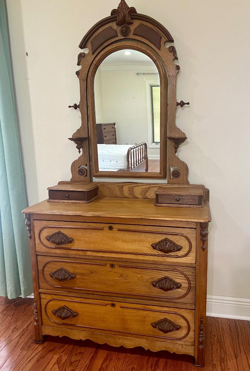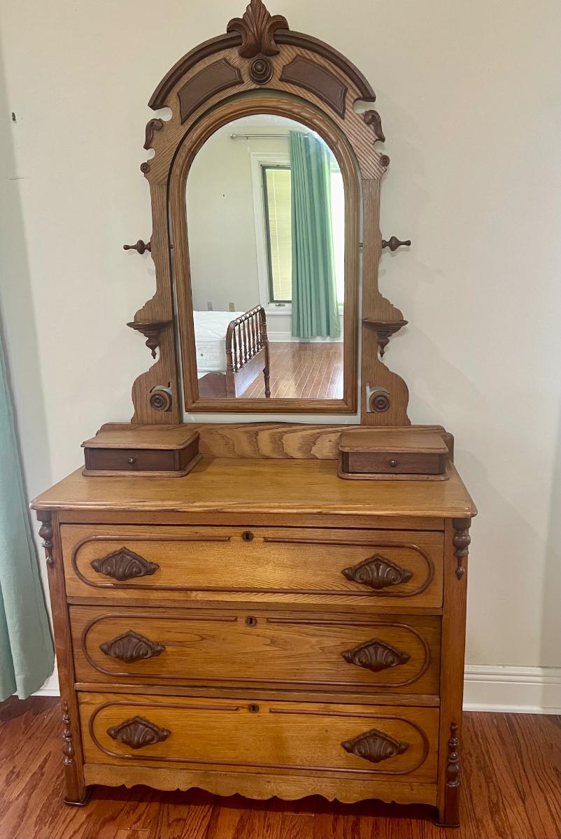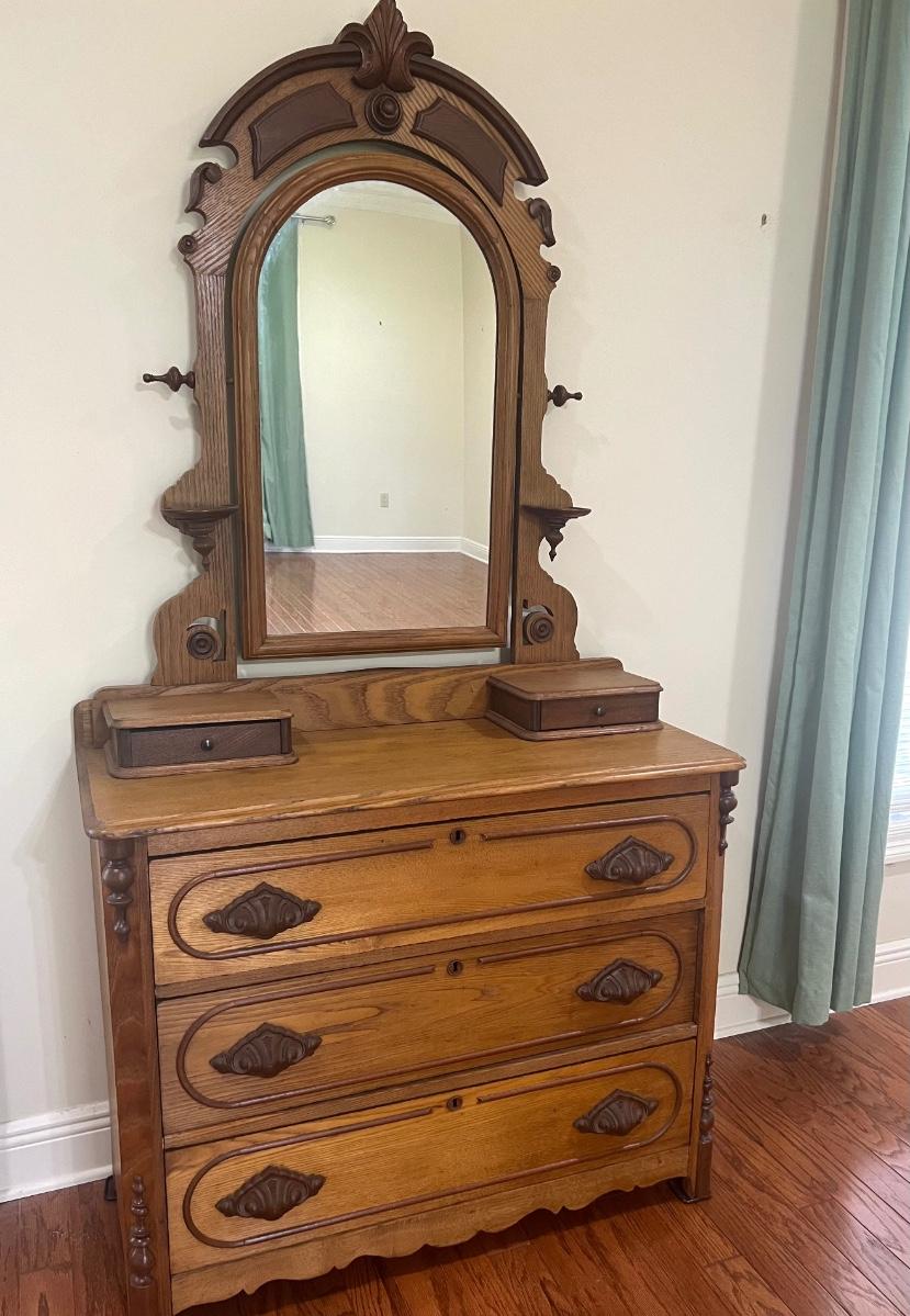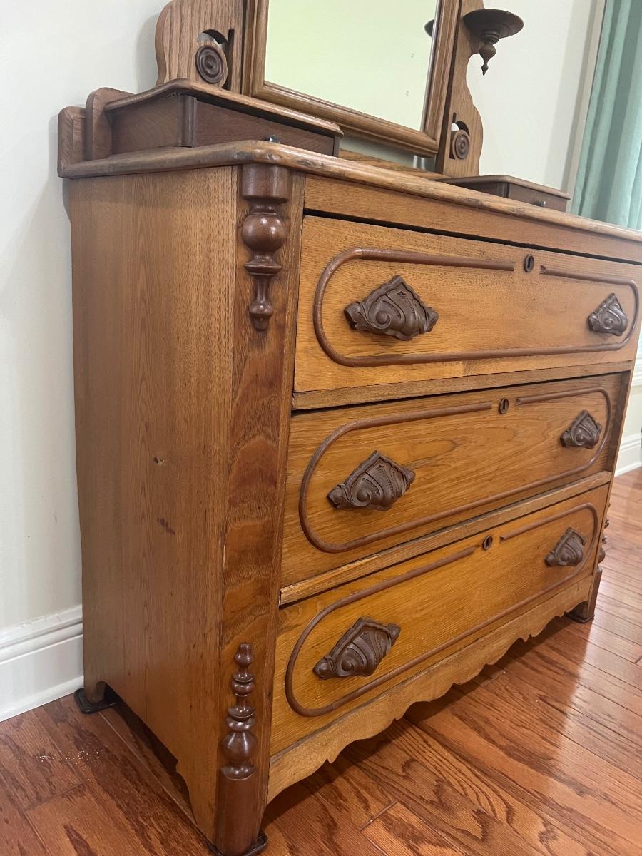 Antique dresser with three drawers and adjustable mirror. This piece is solid wood and believed to be made out of maple wood, The top portion with the mirror is a separate piece, so moving will be easier. Measures 75 inches tall, 39 inches wide and 17 inches deep.