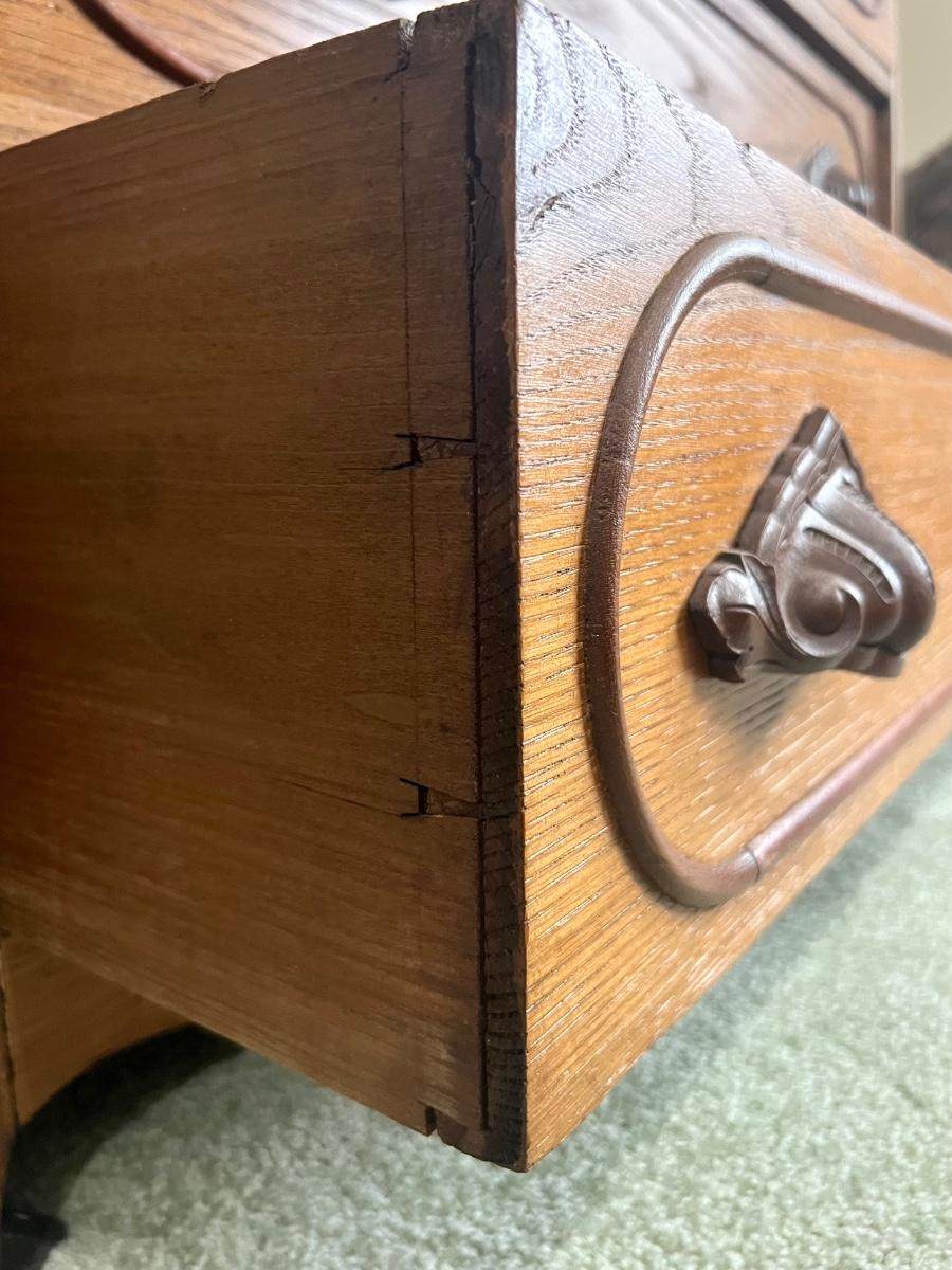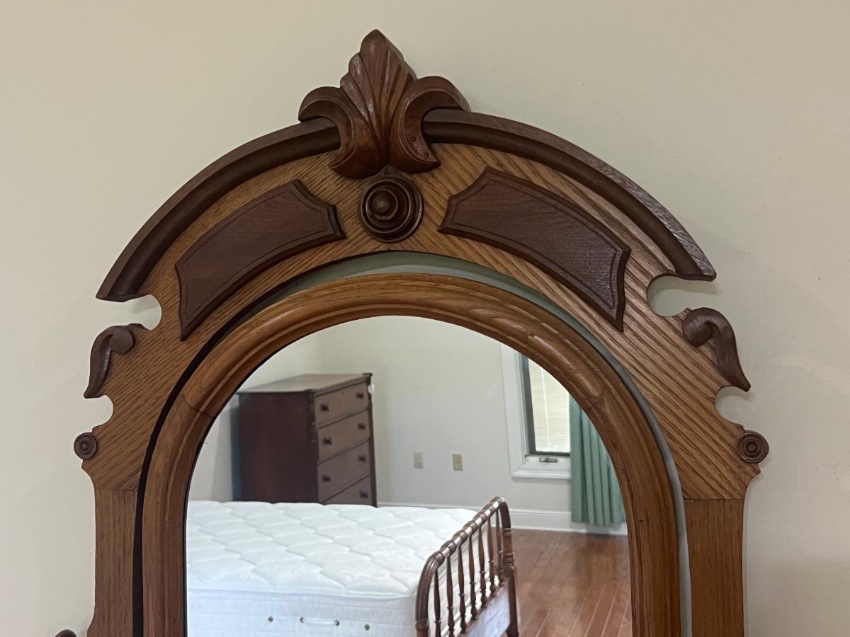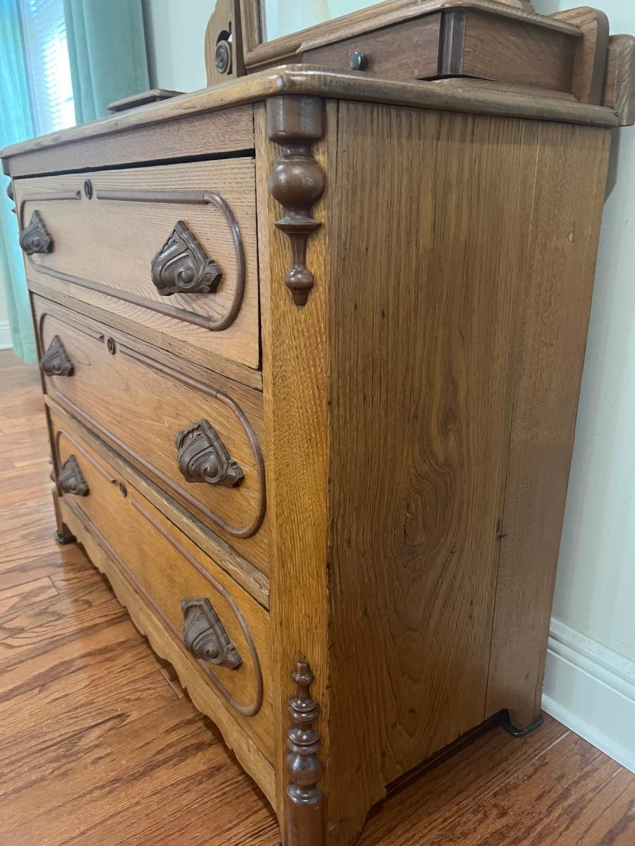 Antique dresser with three drawers and adjustable mirror. This piece is solid wood and believed to be made out of maple wood, The top portion with the mirror is a separate piece, so moving will be easier. Measures 75 inches tall, 39 inches wide and 17 inches deep.