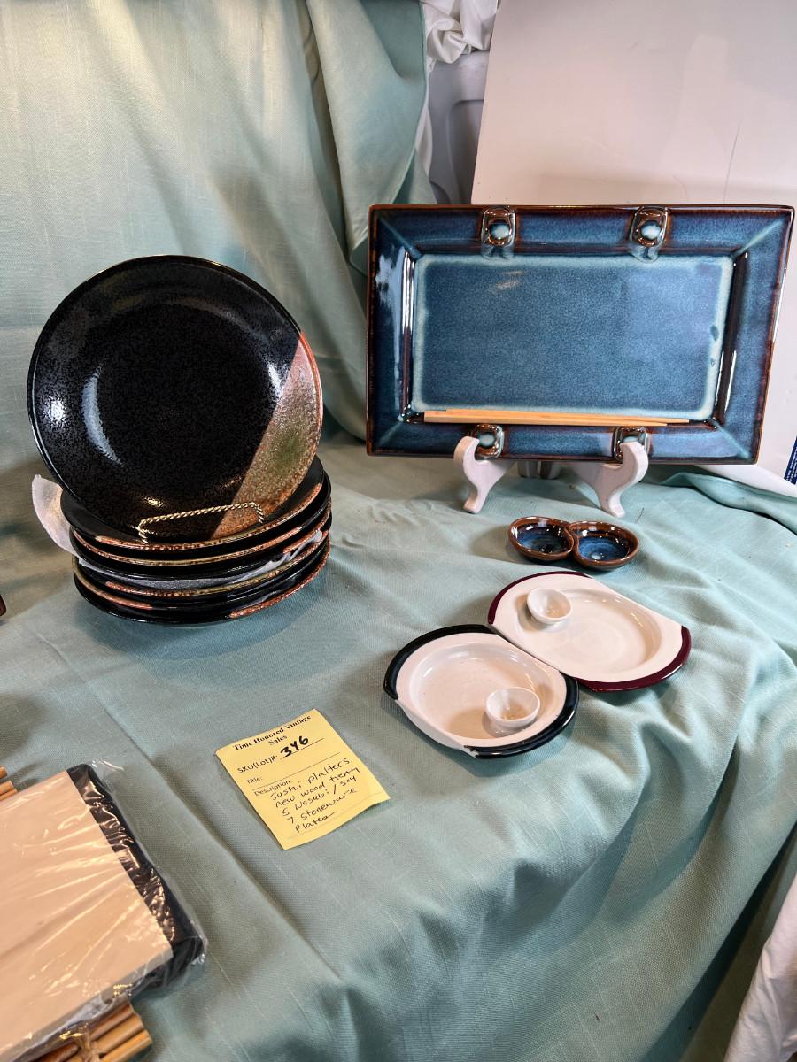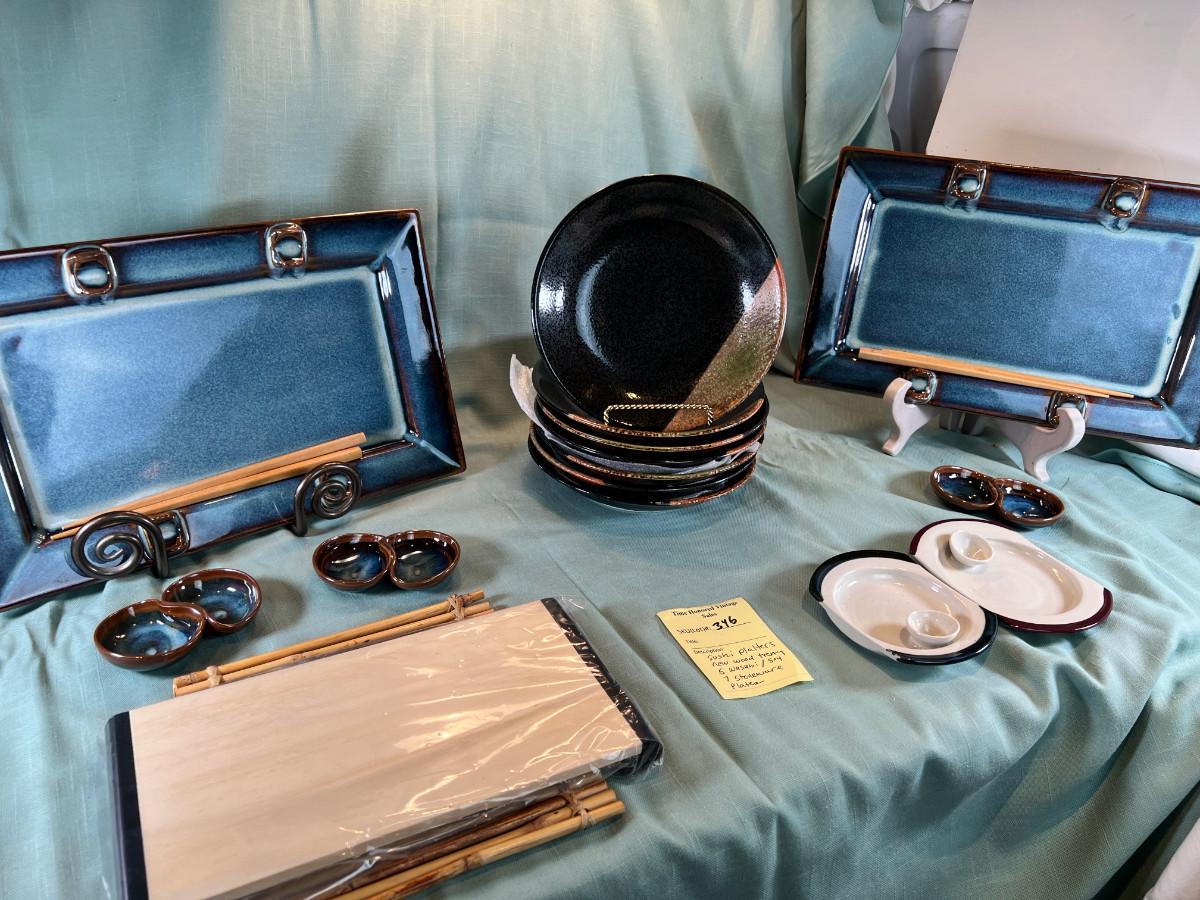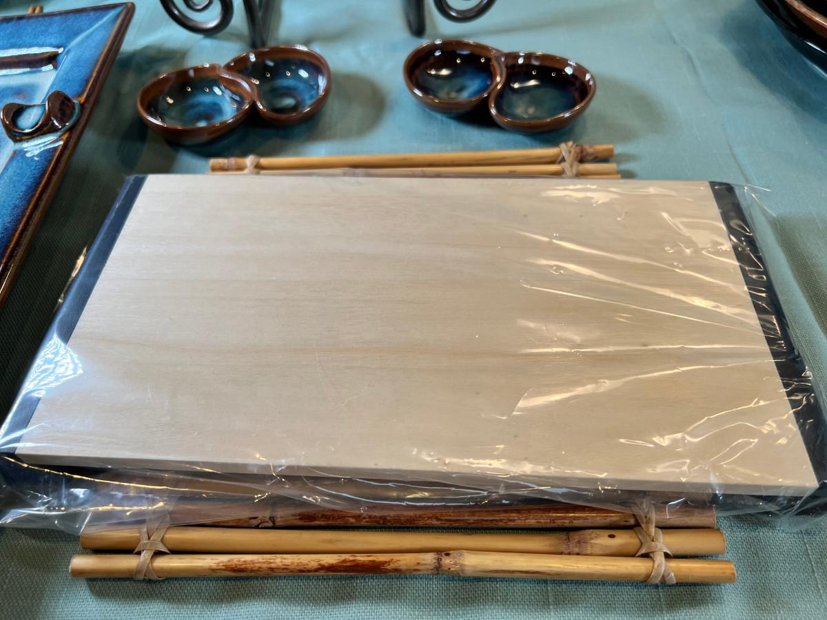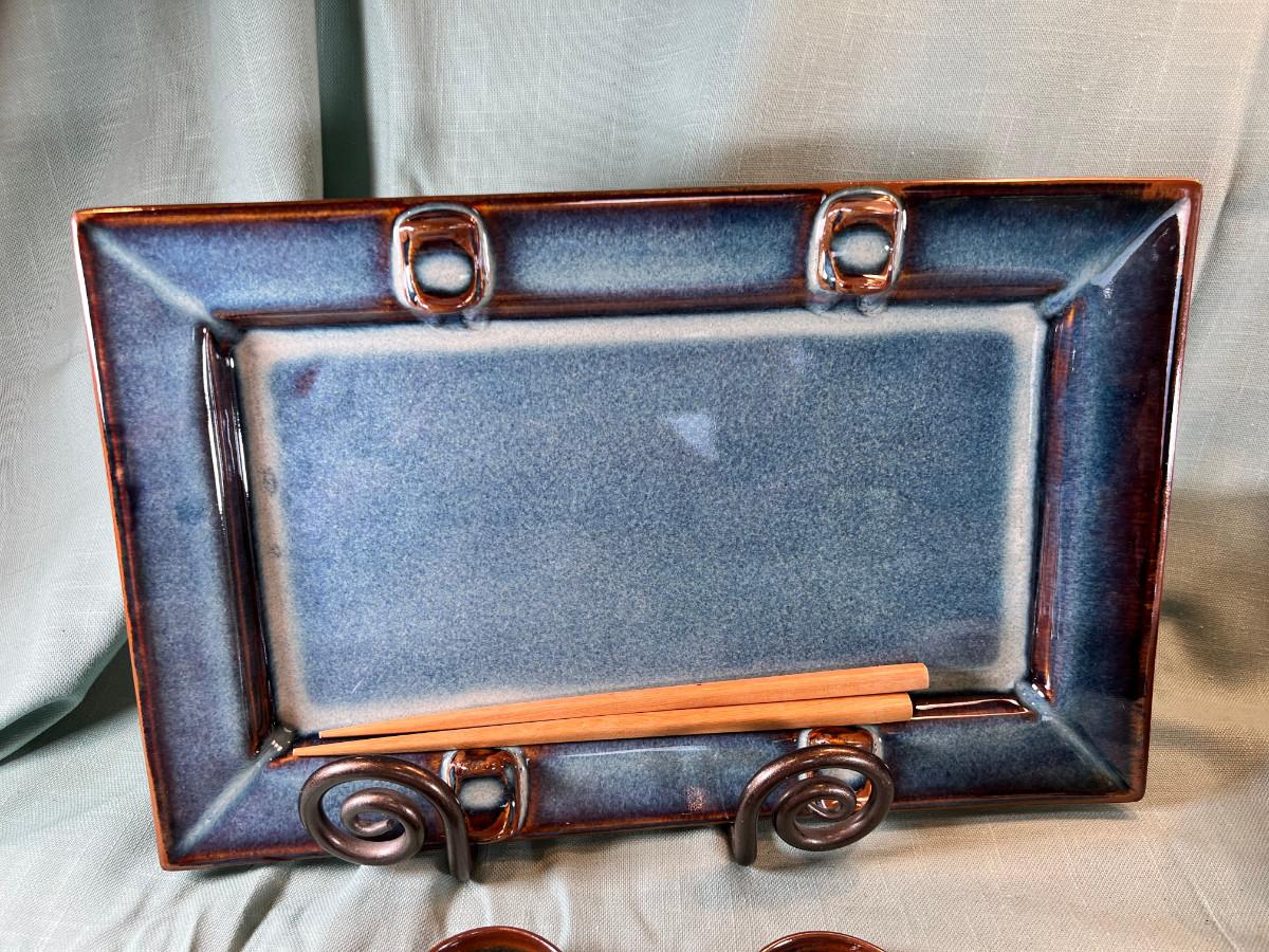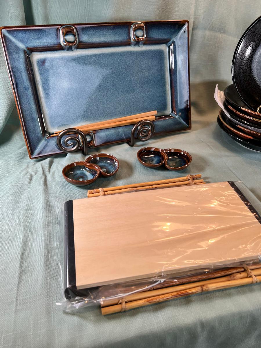 2 Ceramic stoneware handmade Sushi platters with chopsticks, 5 Wasabi say sauce trays, 7 stoneware plates. Wooden sushi platter, bamboo mat