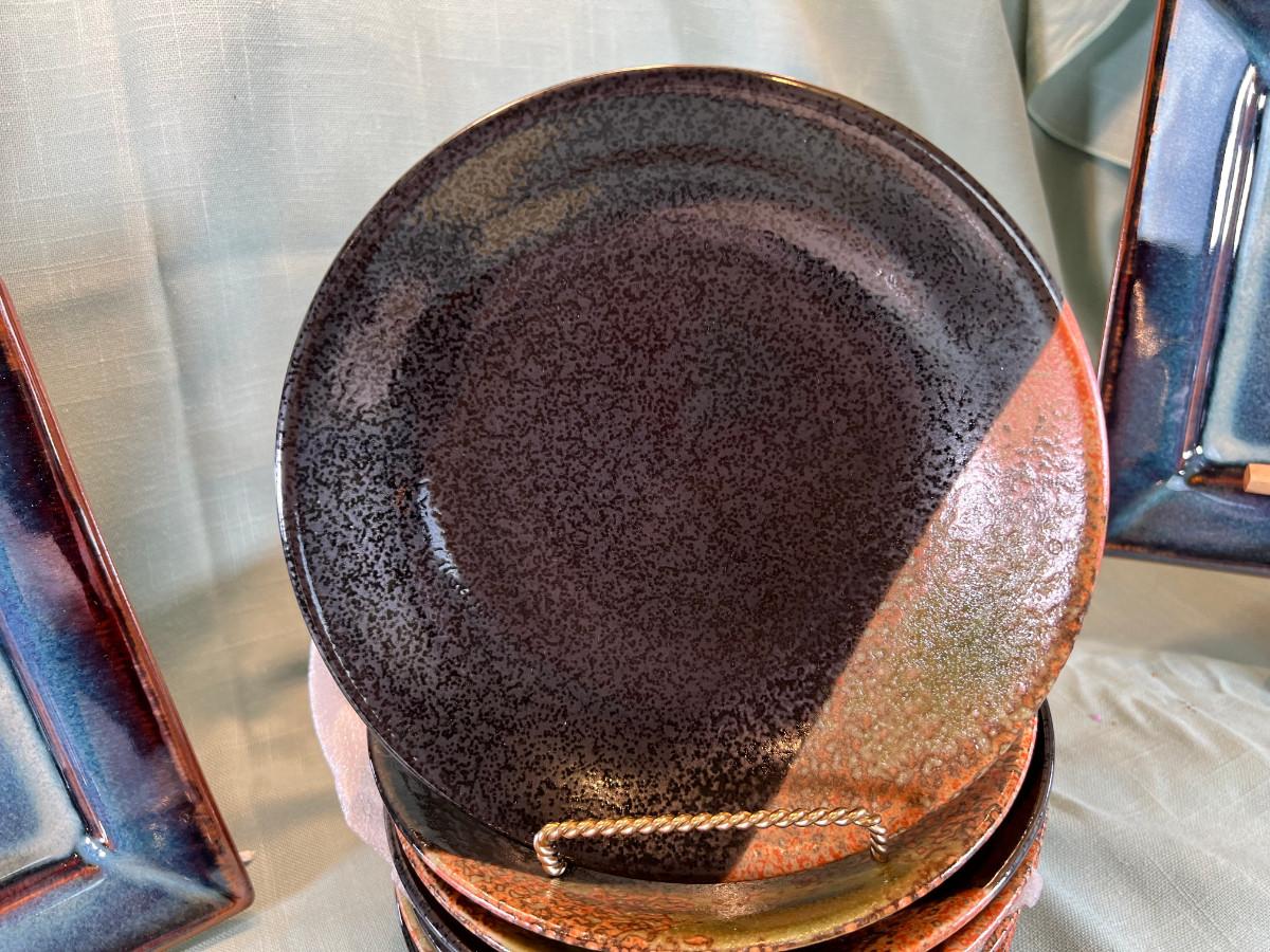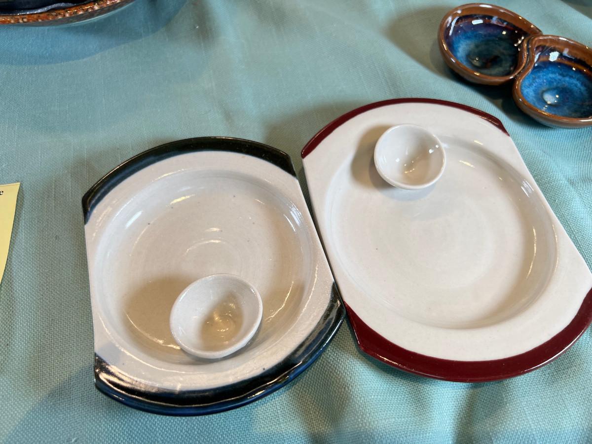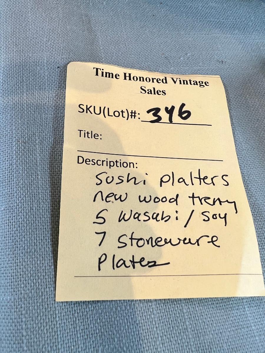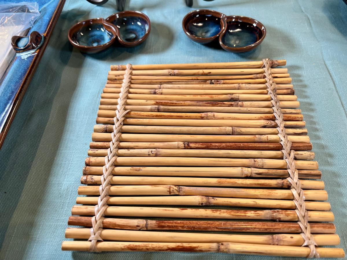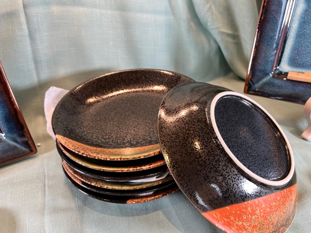 2 Ceramic stoneware handmade Sushi platters with chopsticks, 5 Wasabi say sauce trays, 7 stoneware plates. Wooden sushi platter, bamboo mat