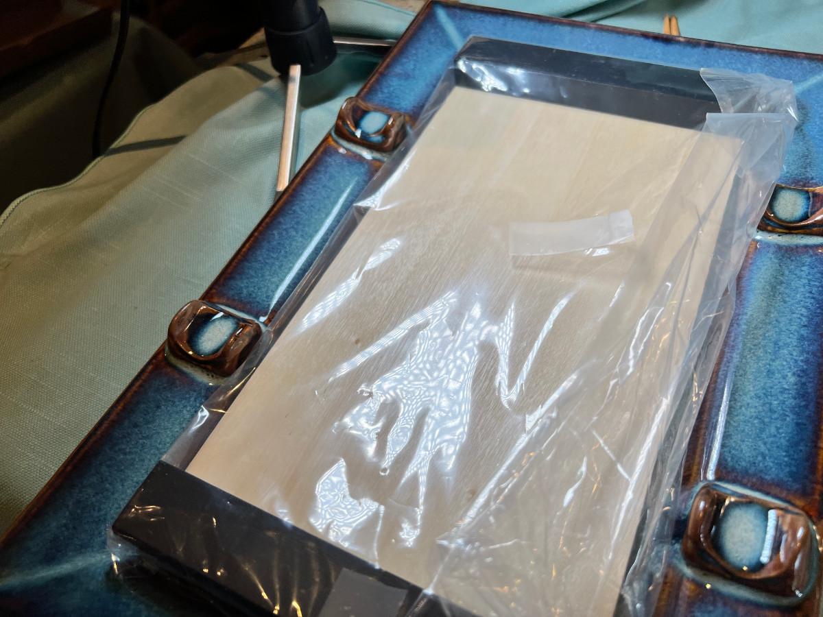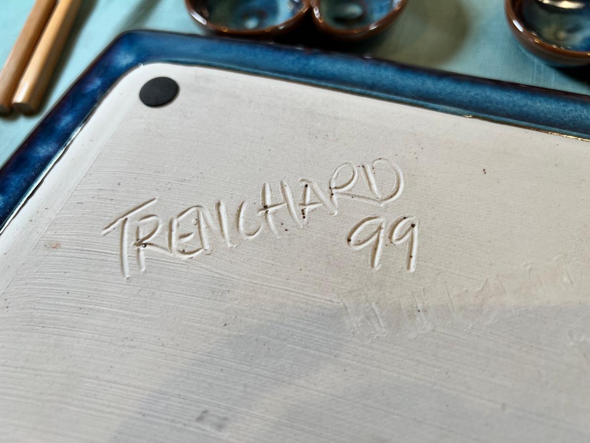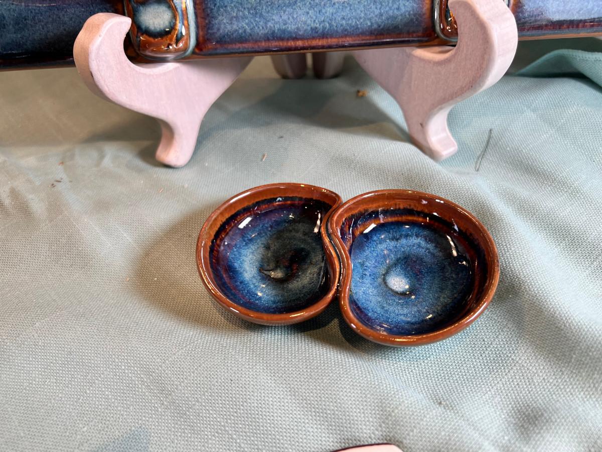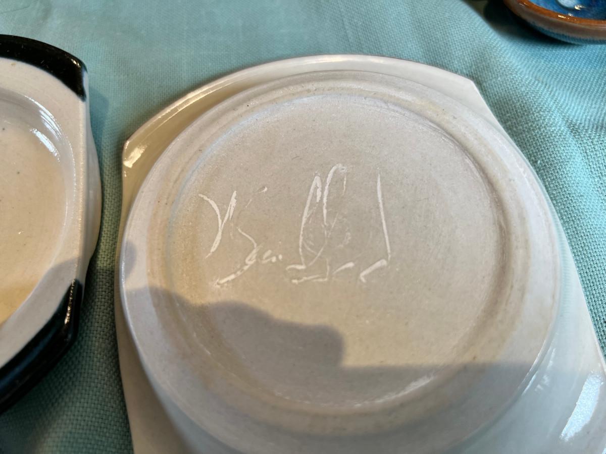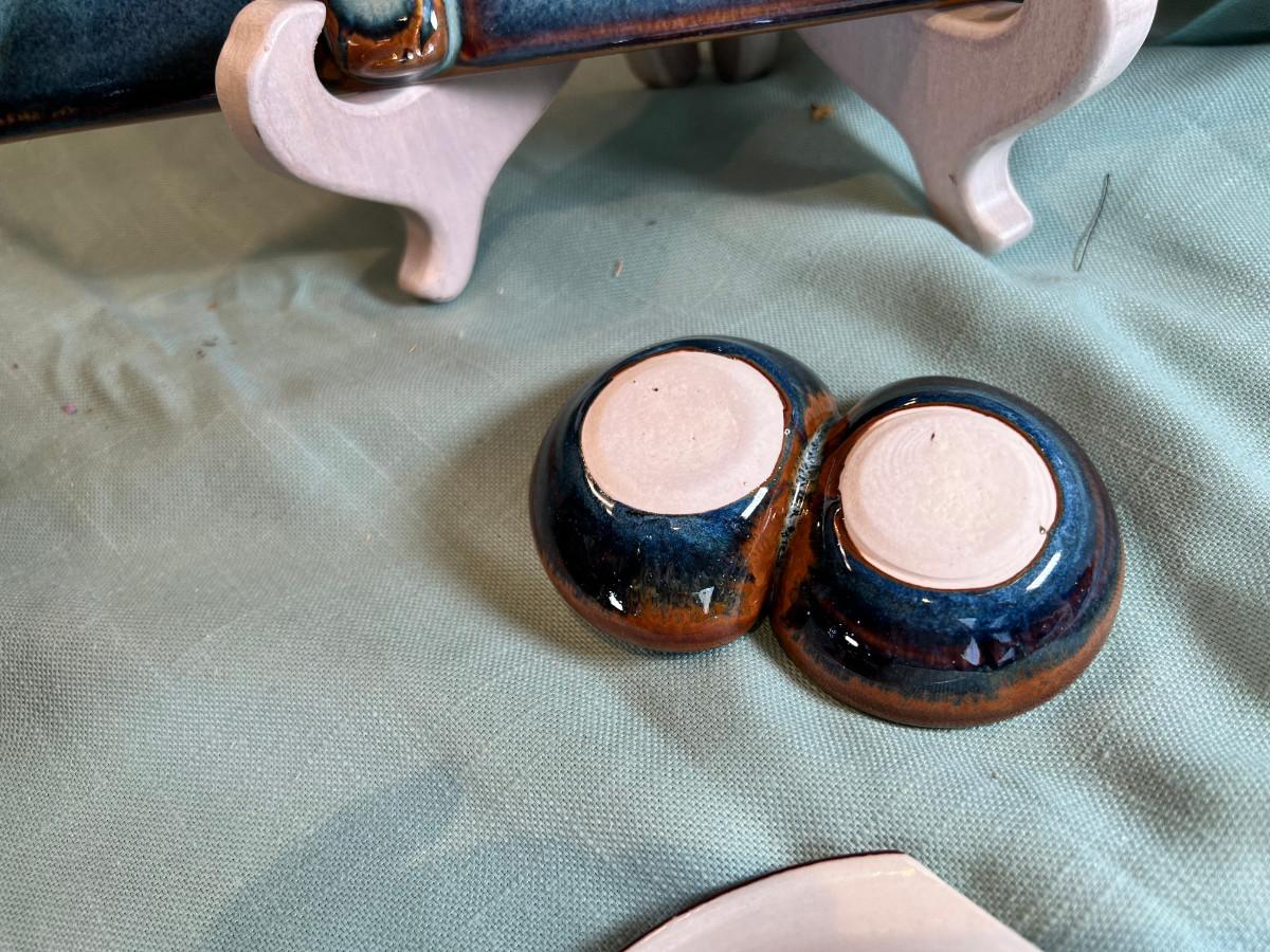 2 Ceramic stoneware handmade Sushi platters with chopsticks, 5 Wasabi say sauce trays, 7 stoneware plates. Wooden sushi platter, bamboo mat