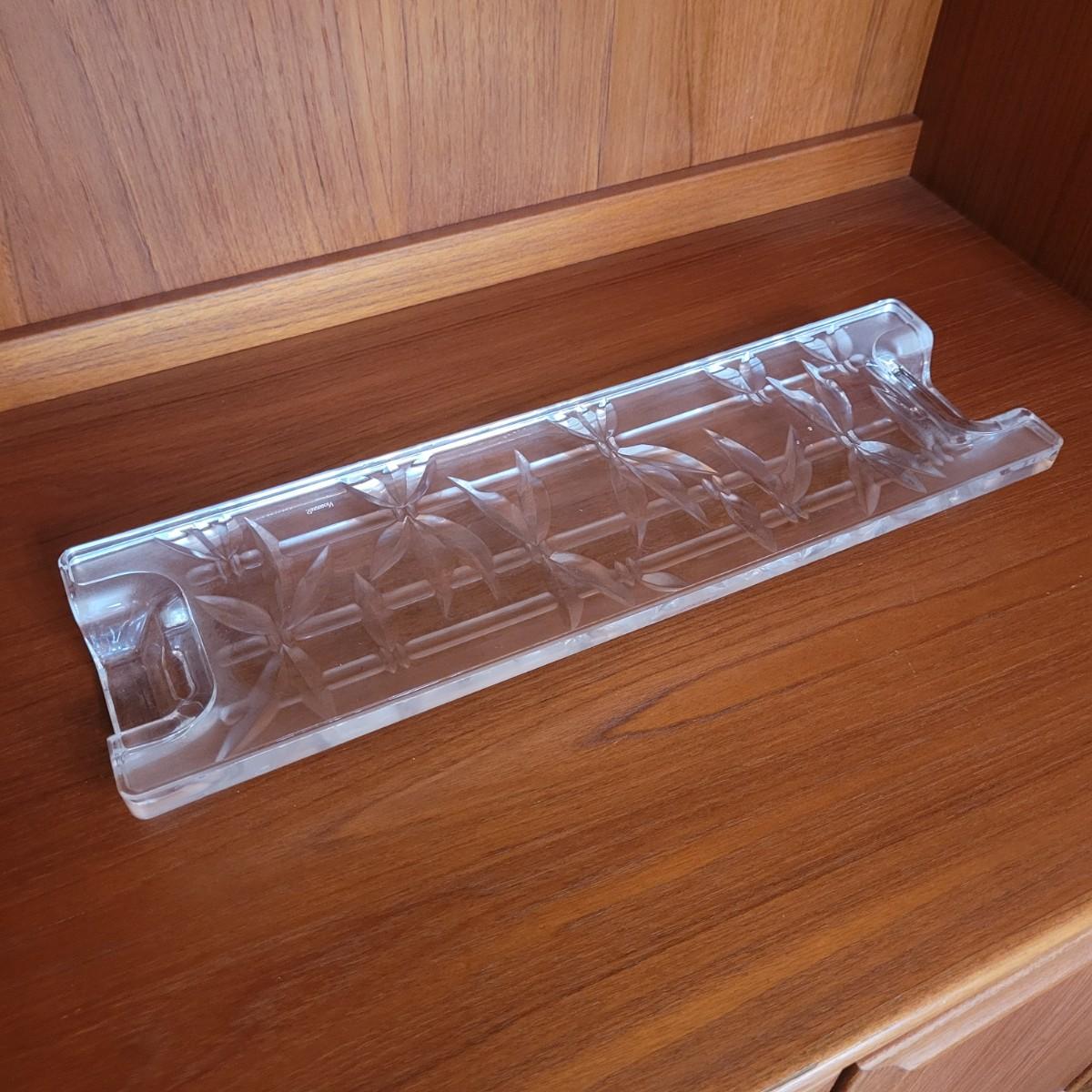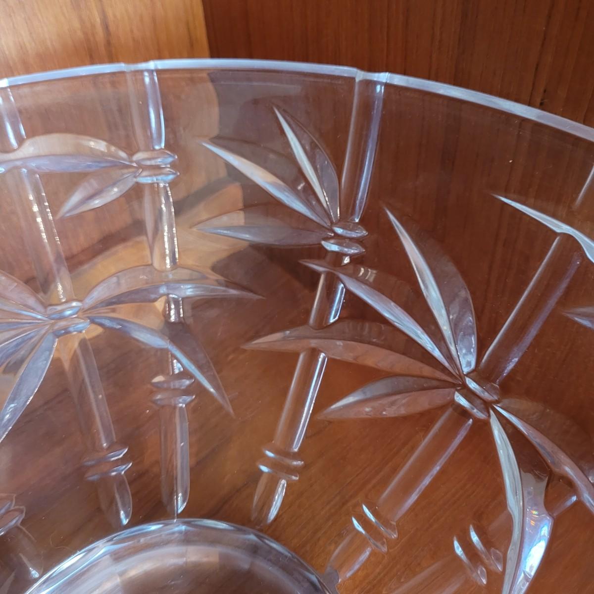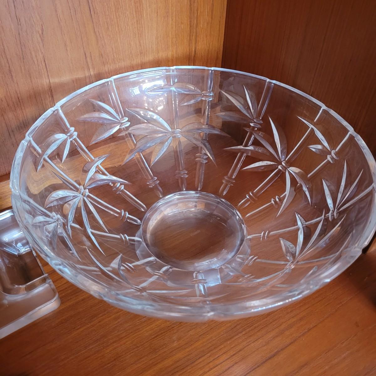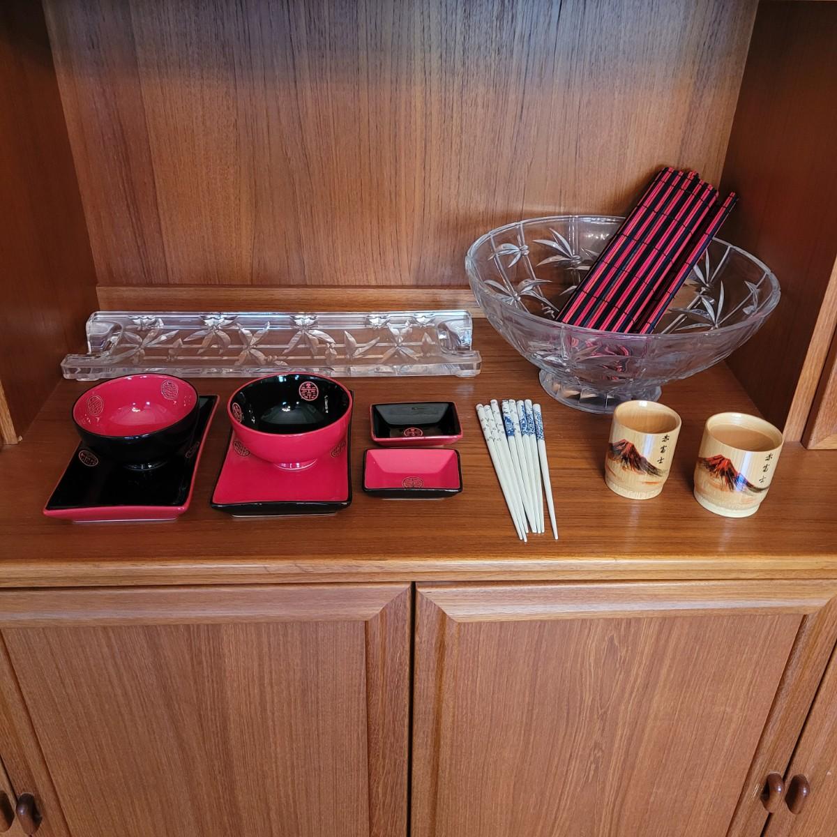 This sushi set includes an etched glass serving tray with a bamboo motif, two rolling mats, two sets of serveware with soup bowls, soy sauce dishes and plates, and four pairs of plastic chopsticks. Also included in this lot are two bamboo tea cups and a large etched glass serving bowl with a bamboo motif. Large bowl measures approximately 13.5”DIA x 6”H. Shipping available.