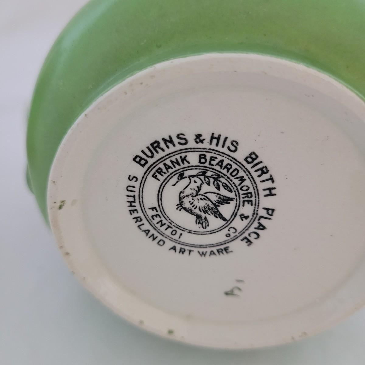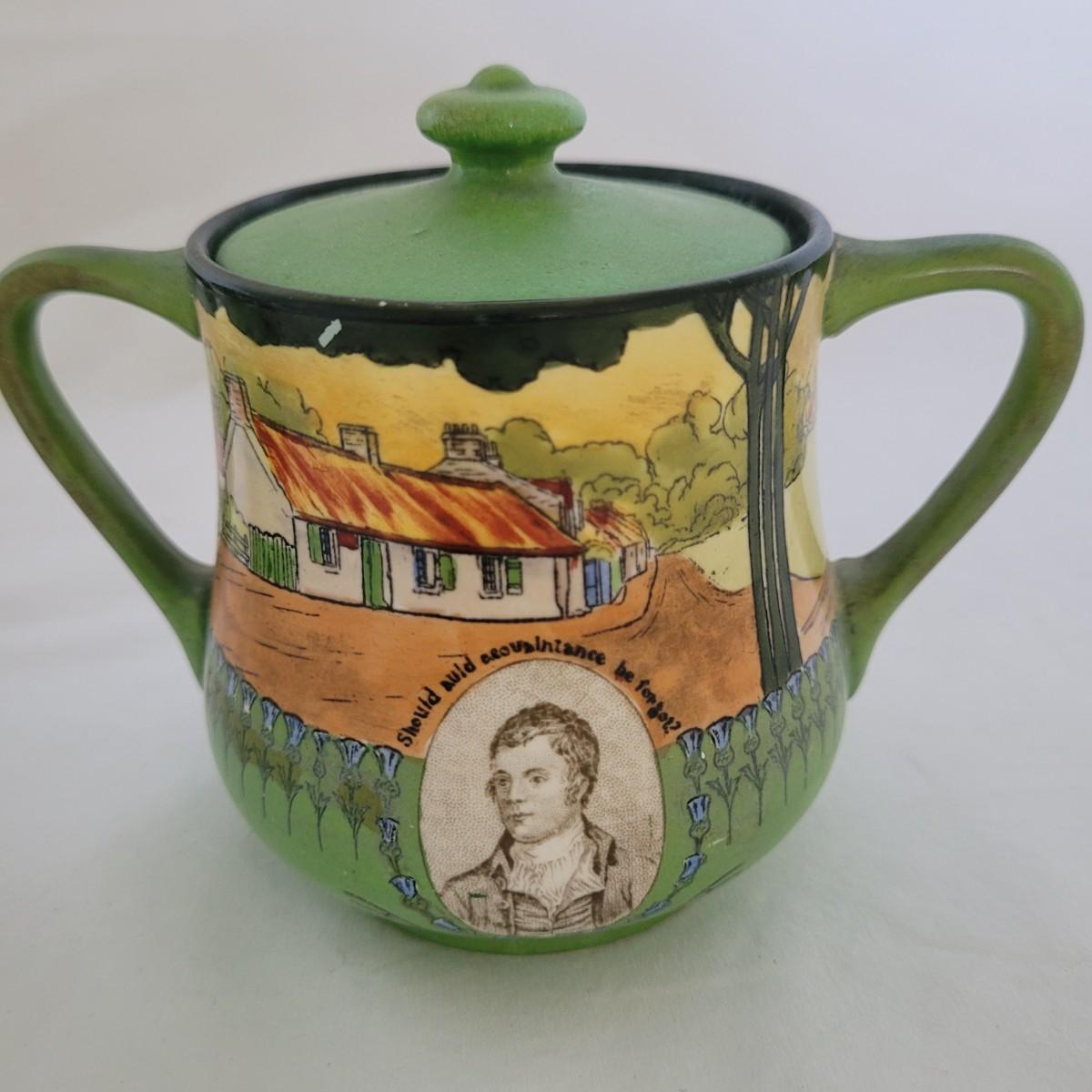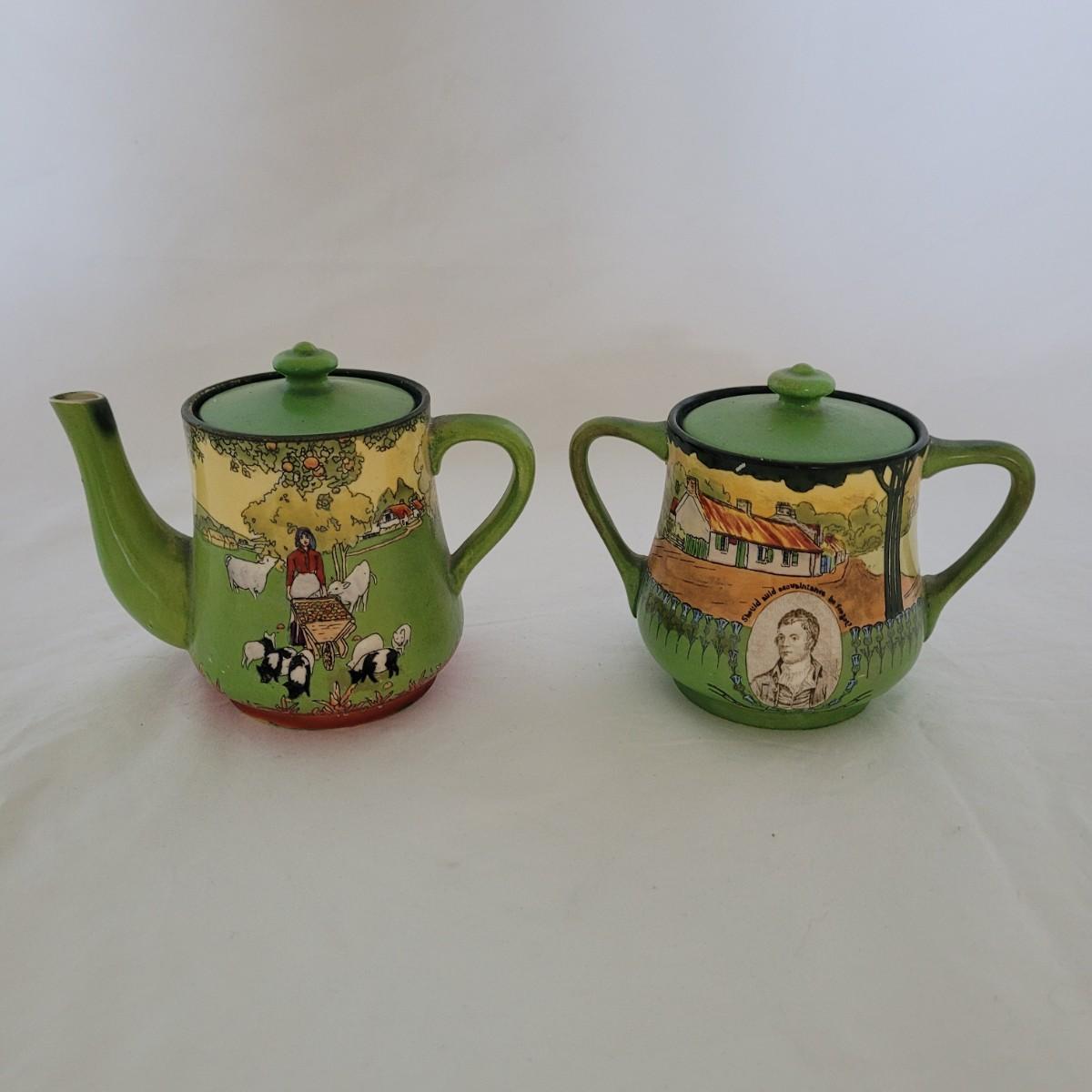Frank Beardmore & Co. Sutherland Art Ware sugar and creamer set. This set appears to be from the Burns and His Birth Place collection depicting Robert Burns, the writer of Auld Lang Syne. The creamer measures approximately 6” x 5”H. Please see photos for details. Shipping available.