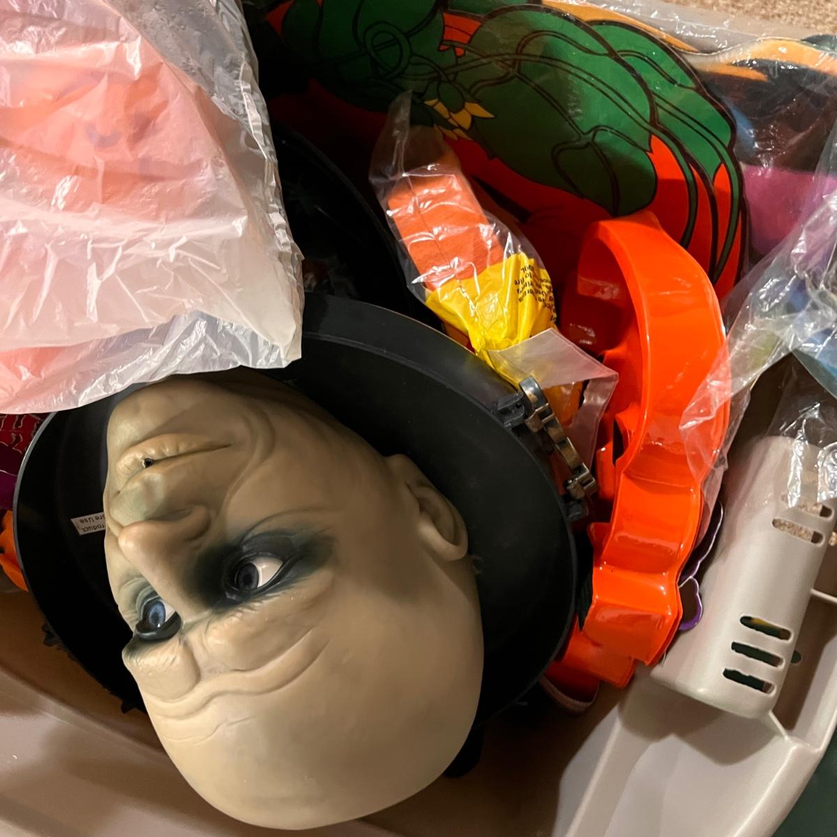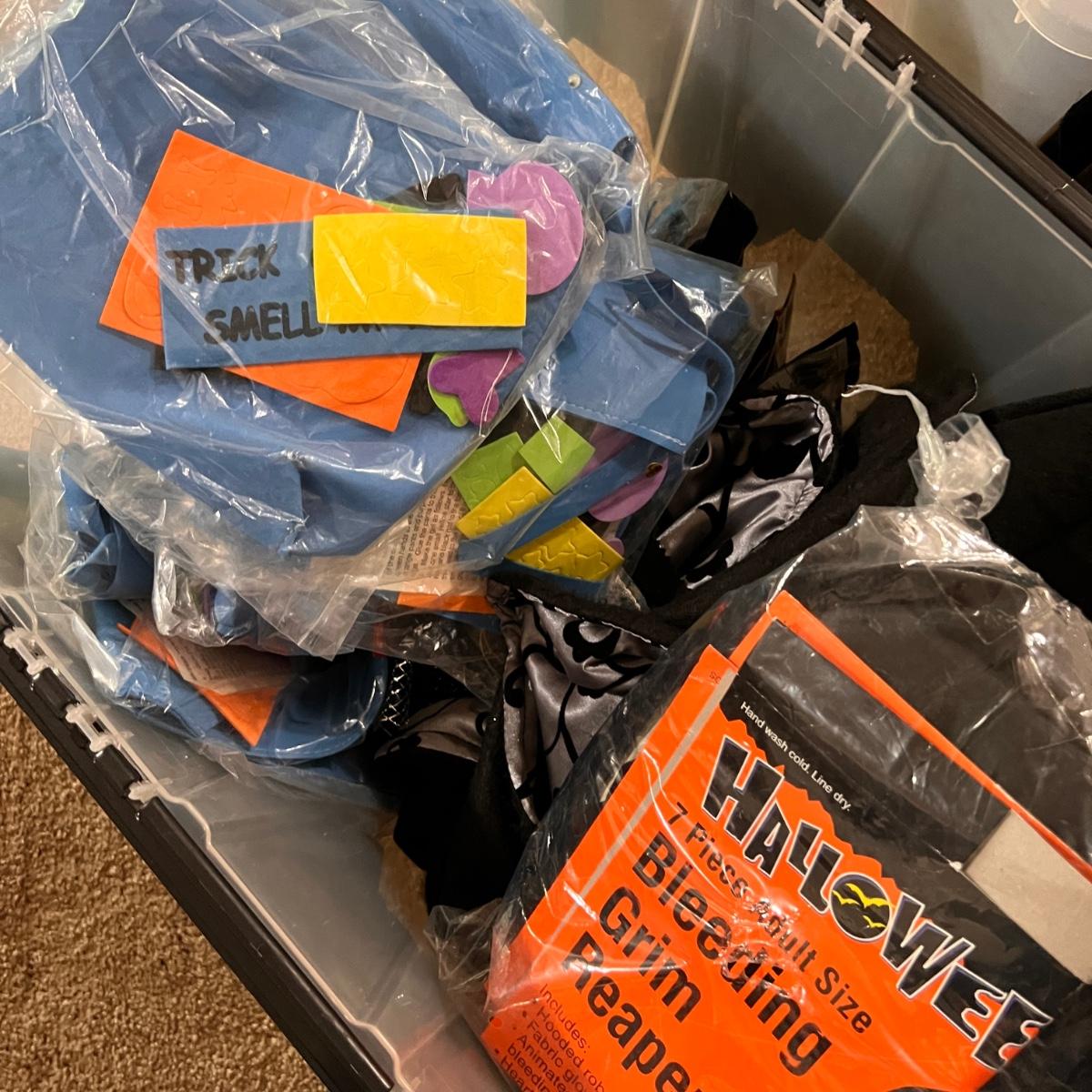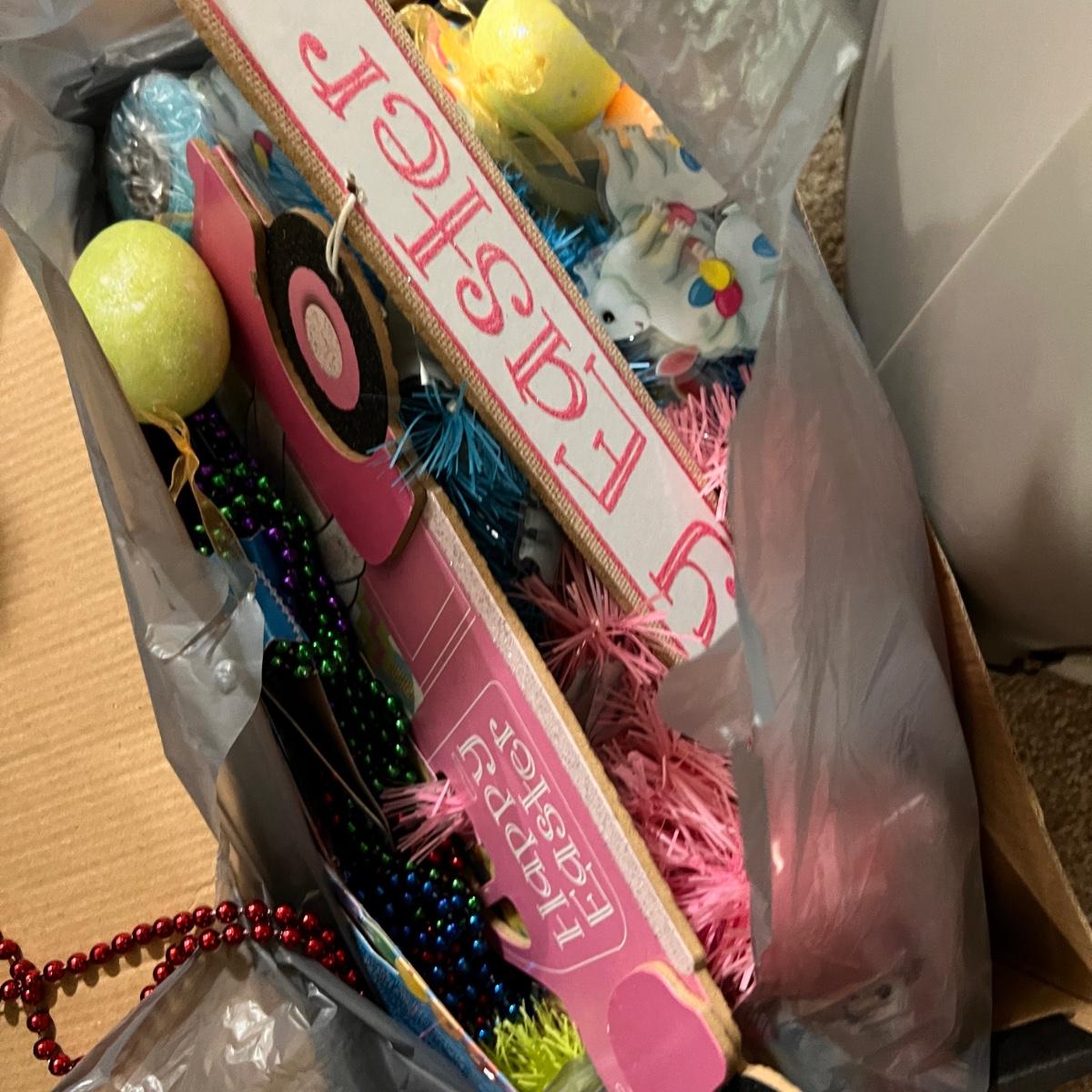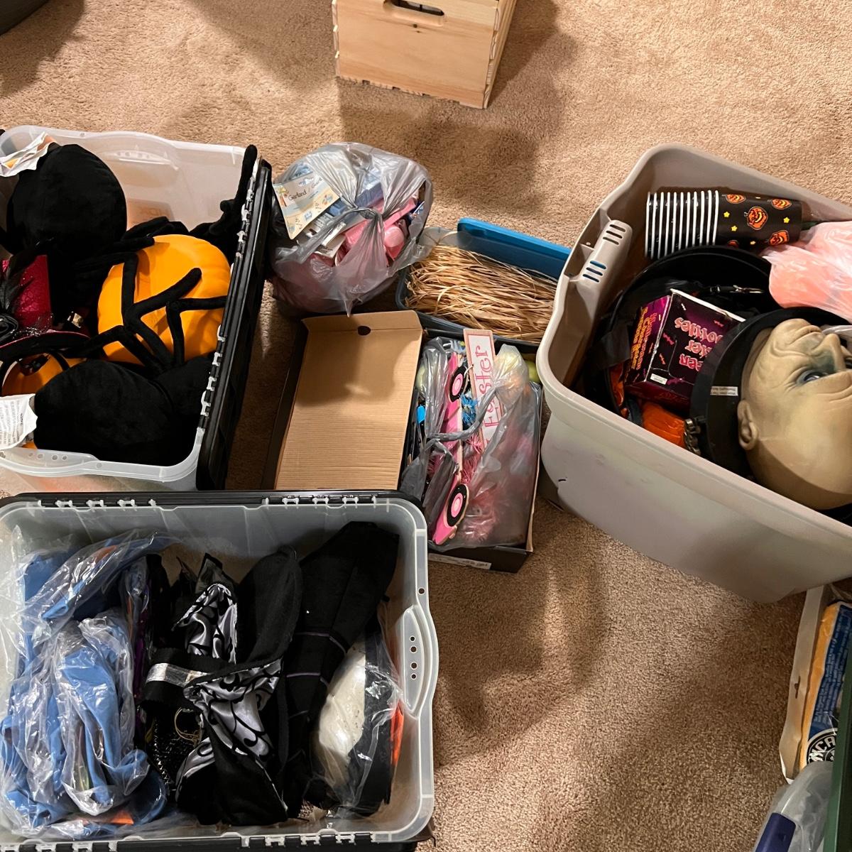 3 big plastic storage bins full of halloween, easter, Valentine’s Day decorations. 1 shopping bag of baby shower decorations. Storage bins included.