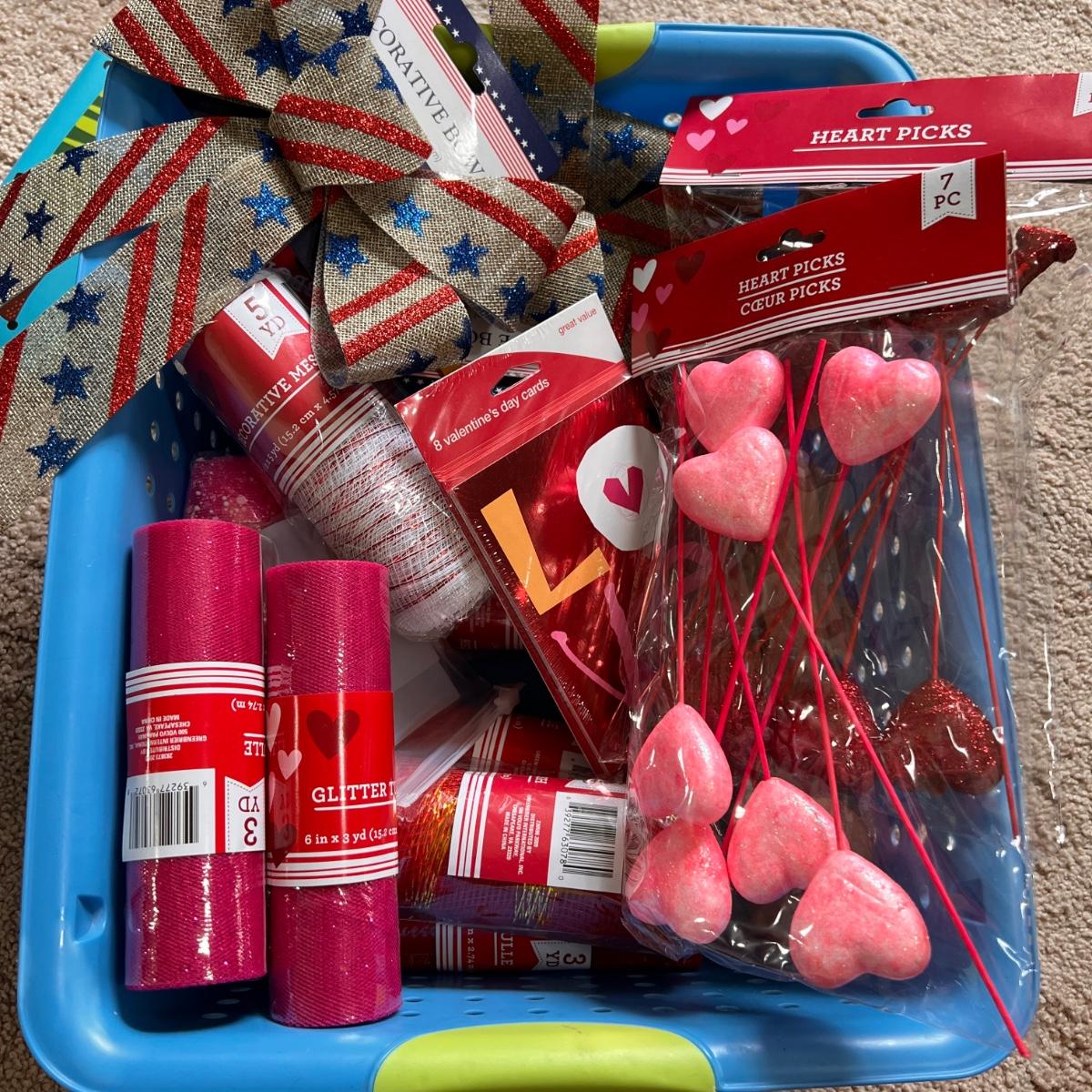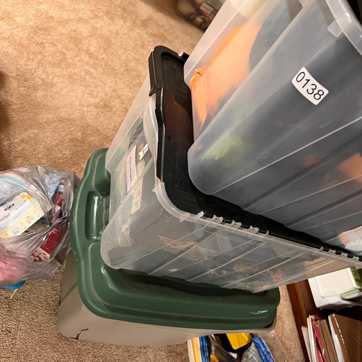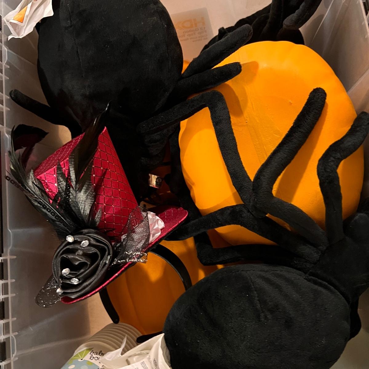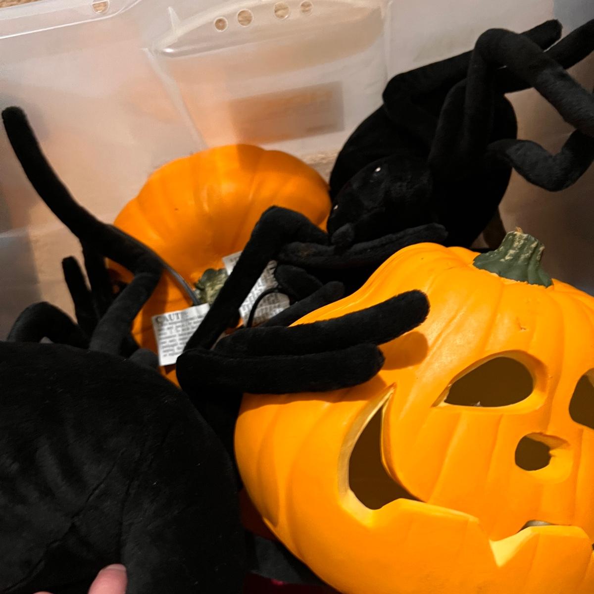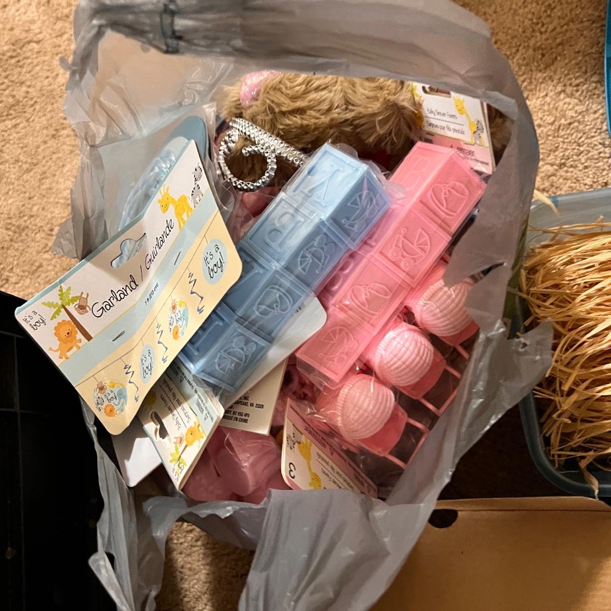 3 big plastic storage bins full of halloween, easter, Valentine’s Day decorations. 1 shopping bag of baby shower decorations. Storage bins included.
