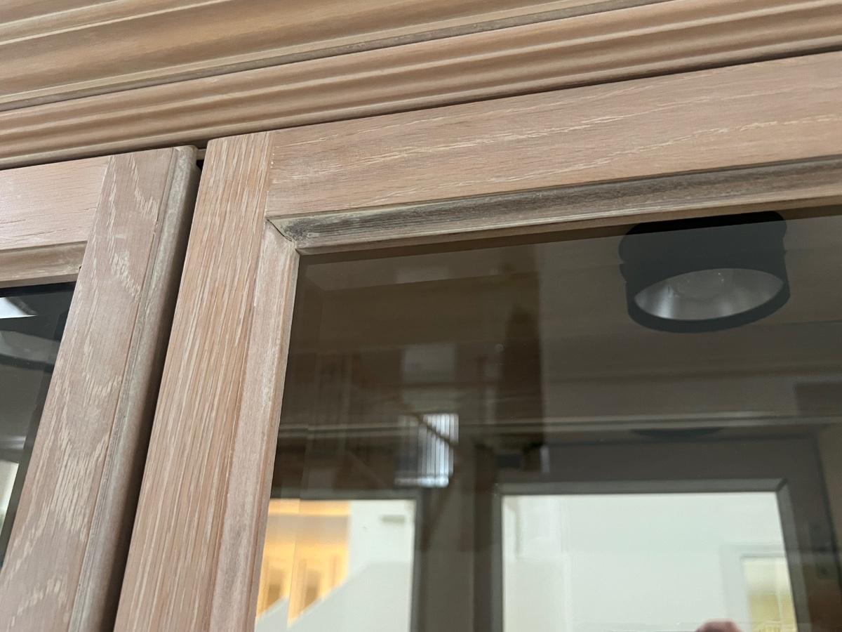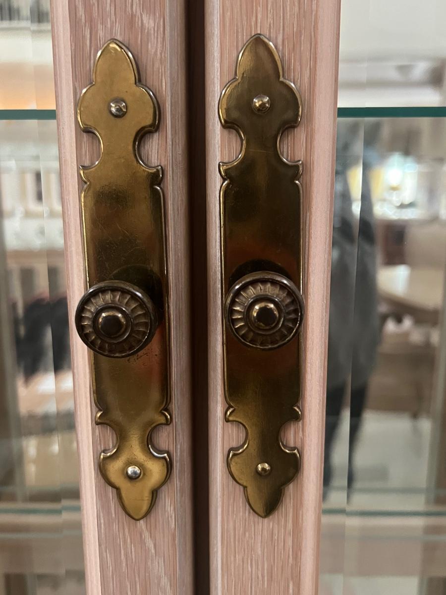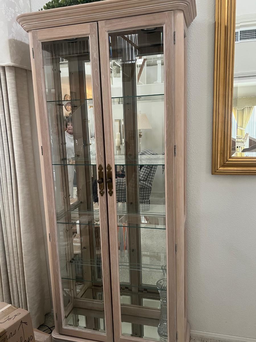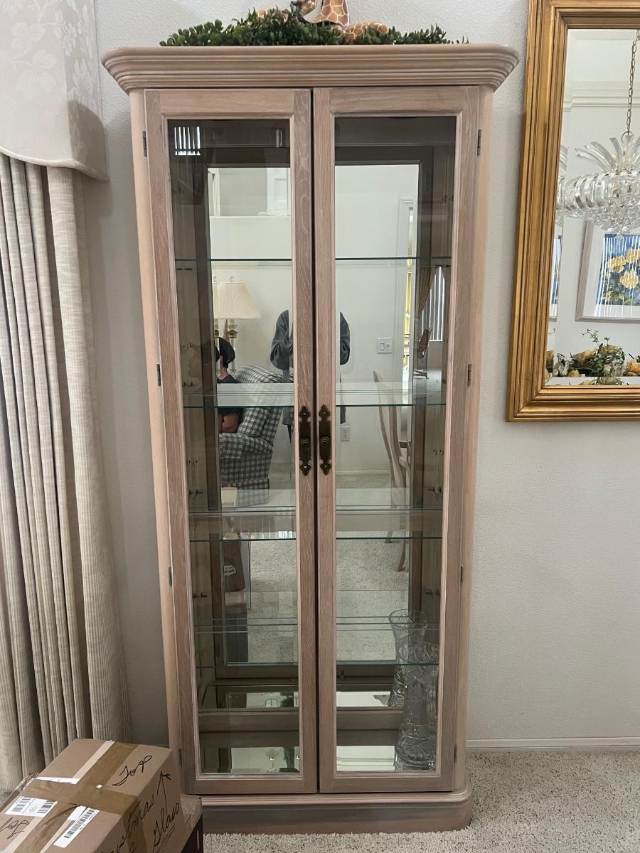 Light Oak Wood construction. Double door front. Measures 76" tall x 32" wide x 12" deep. 4 Glass shelves, lighted inside. Great condition. Pickup will be arranged from very local home in Brea.