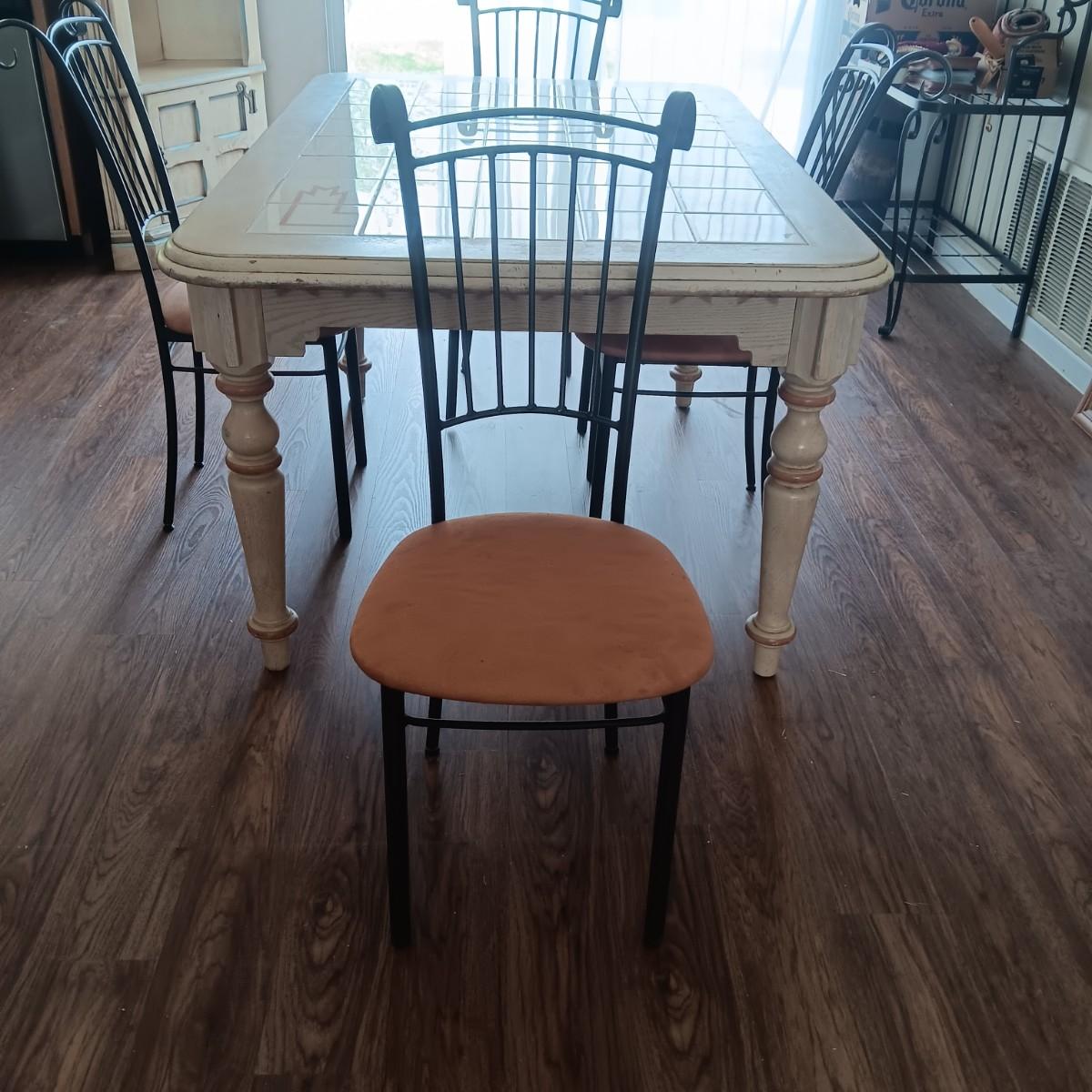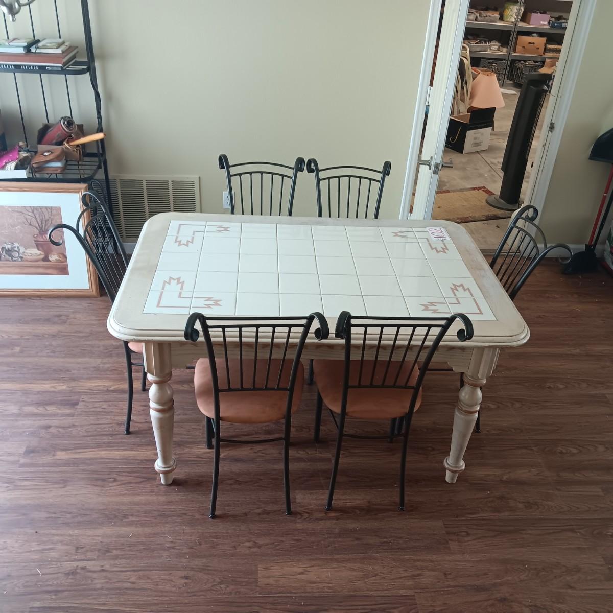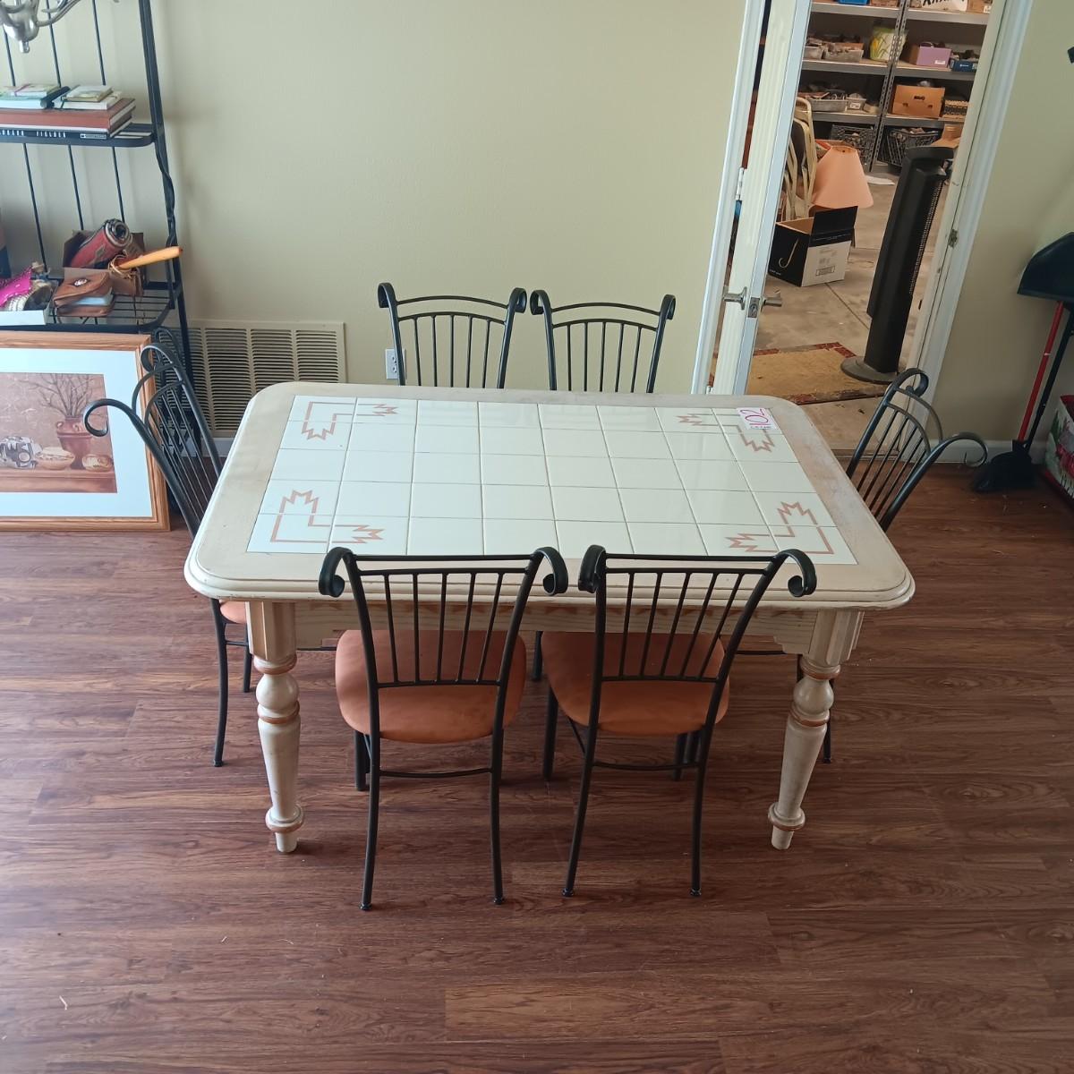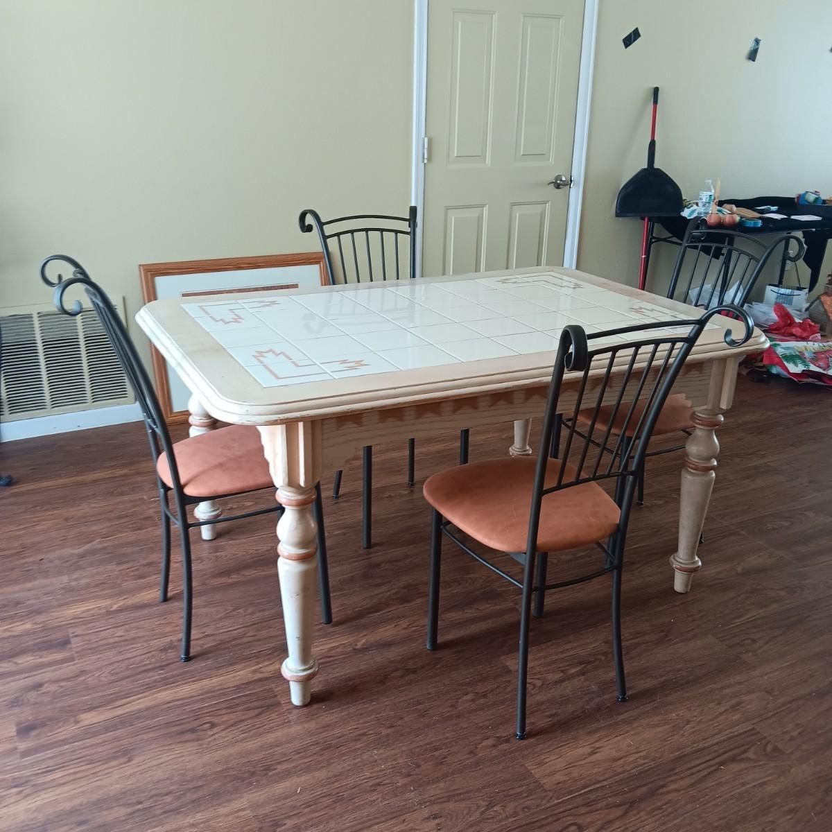 39 X 57 THERE ARE SOME HAIRLINE CRACKS IN SOME OF THE TILES, THE FOOT ON 1 CHAIR IS MISSING MAKING IT WOBBLE