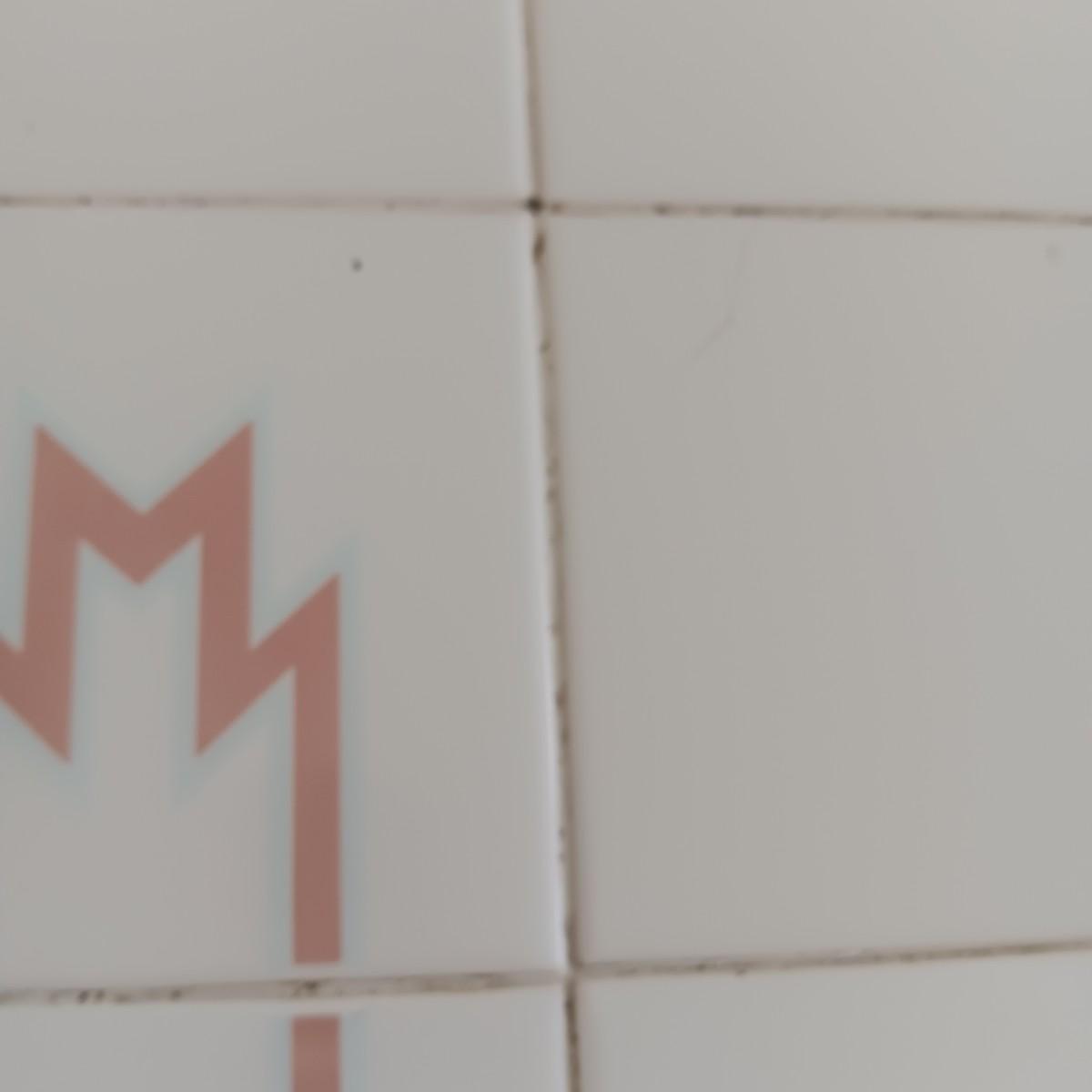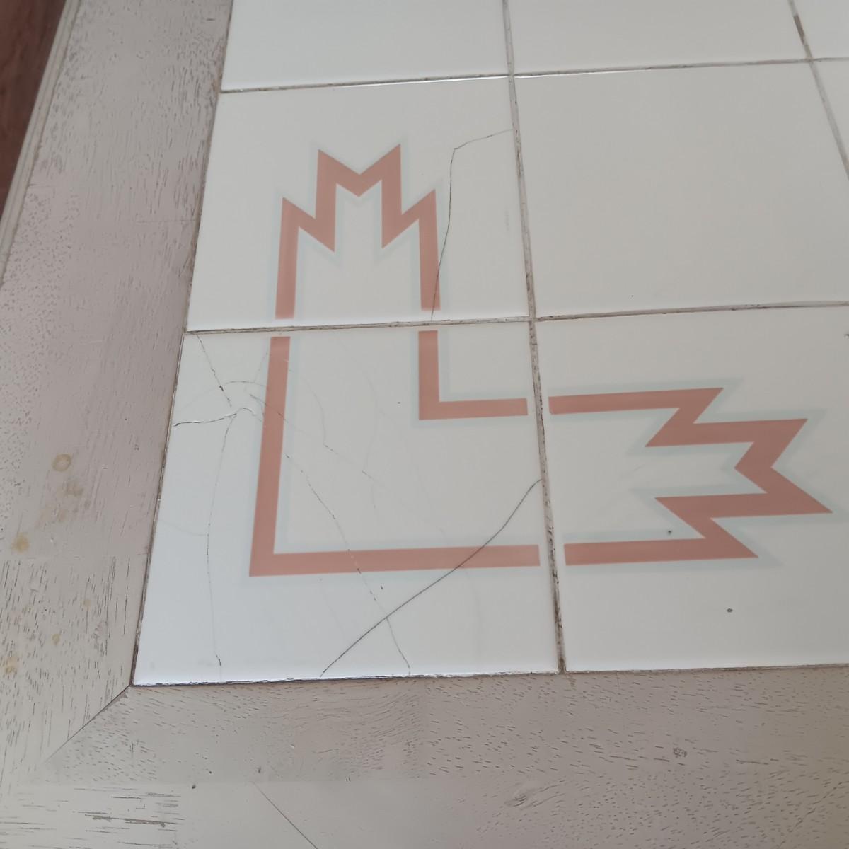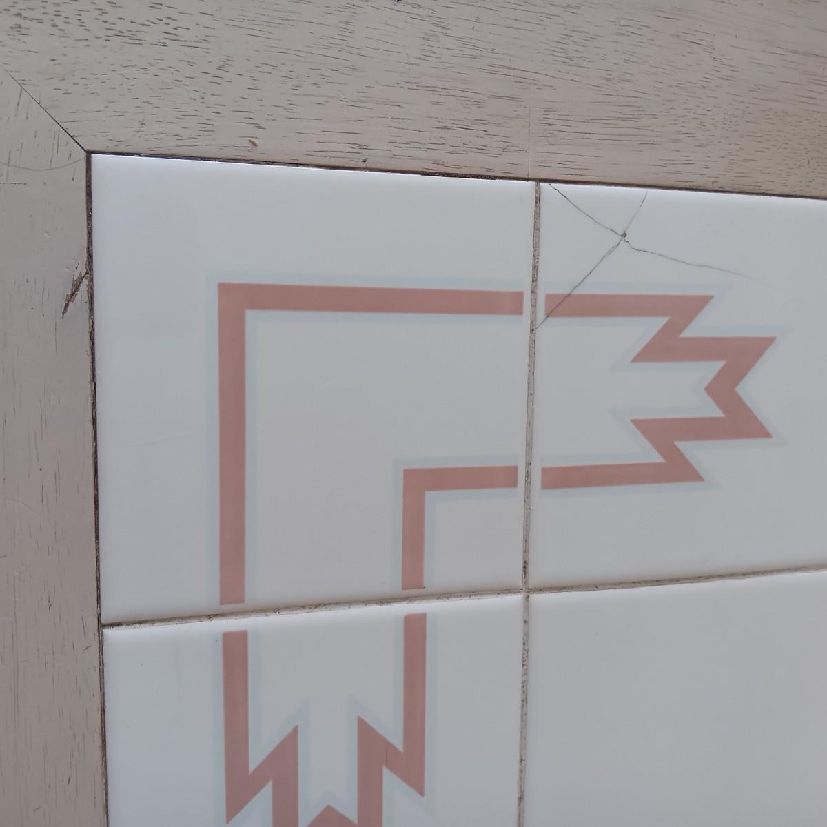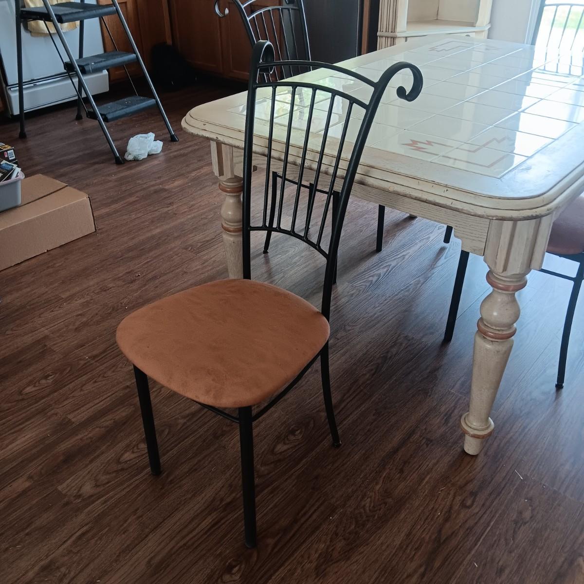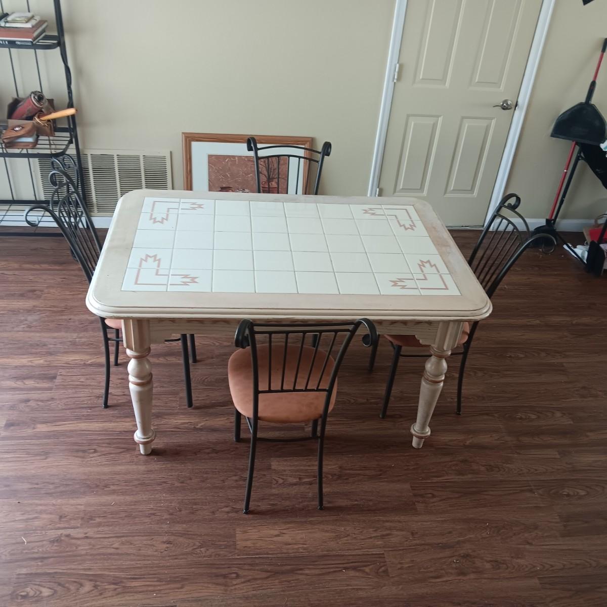 39 X 57 THERE ARE SOME HAIRLINE CRACKS IN SOME OF THE TILES, THE FOOT ON 1 CHAIR IS MISSING MAKING IT WOBBLE