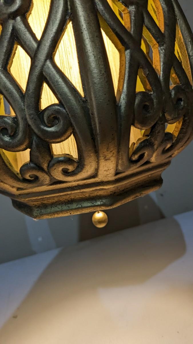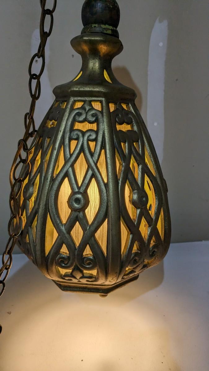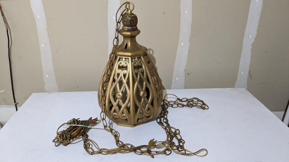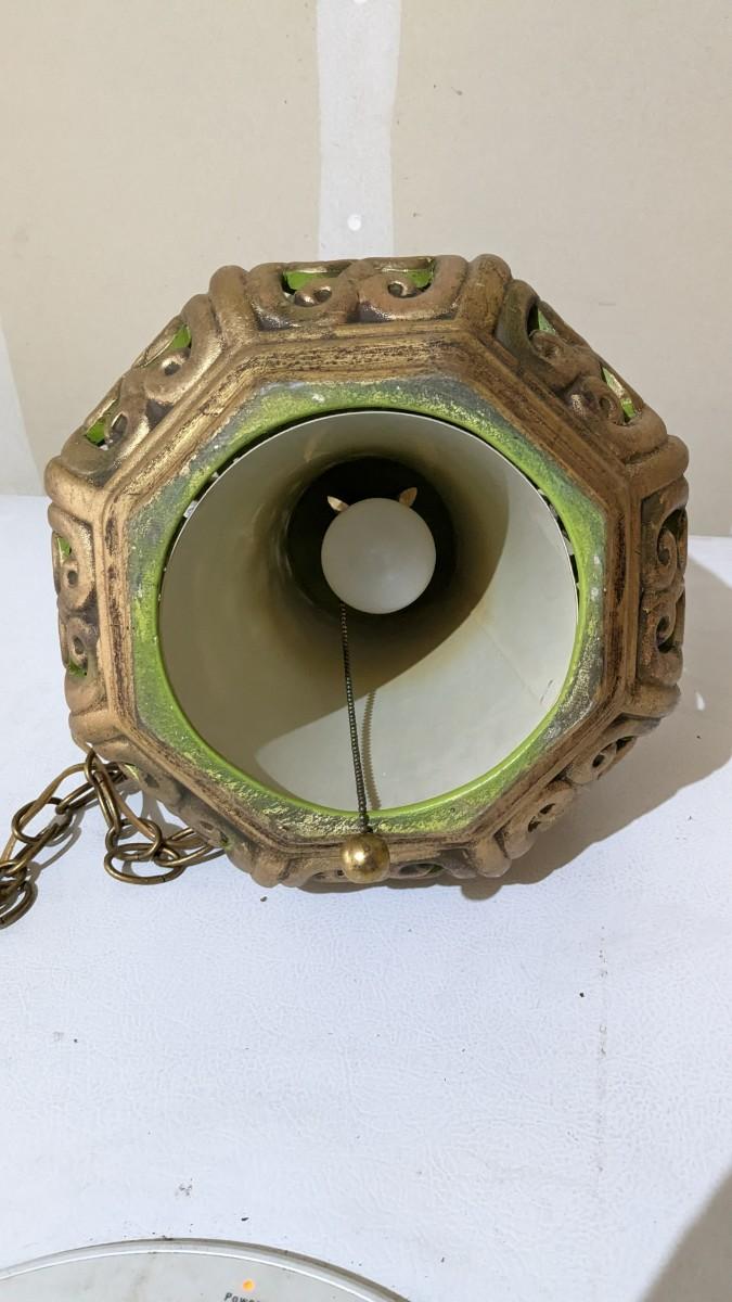 a beautiful vintage swag lamp with pull chain. In great condition with gold over green. Approx. 20.5"x10.25". Tested operable.