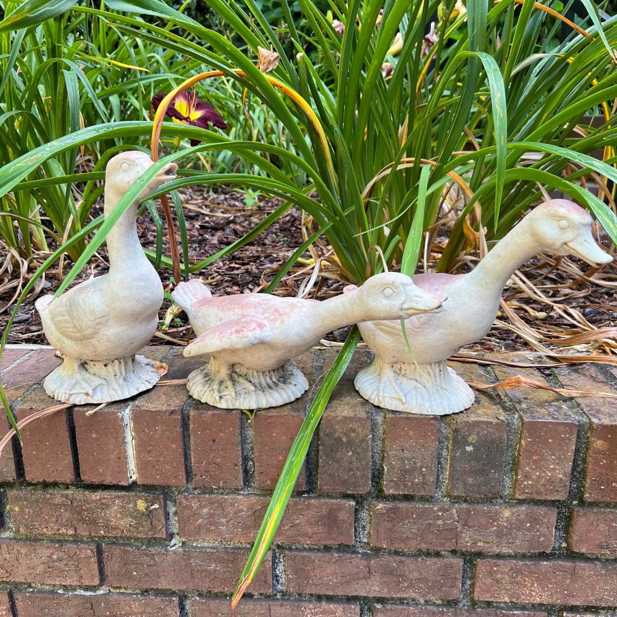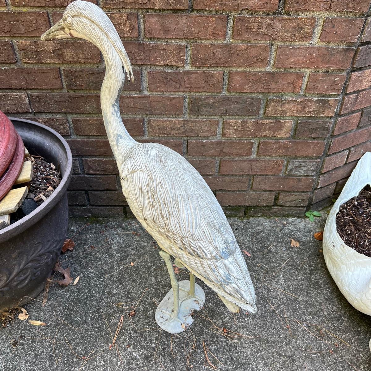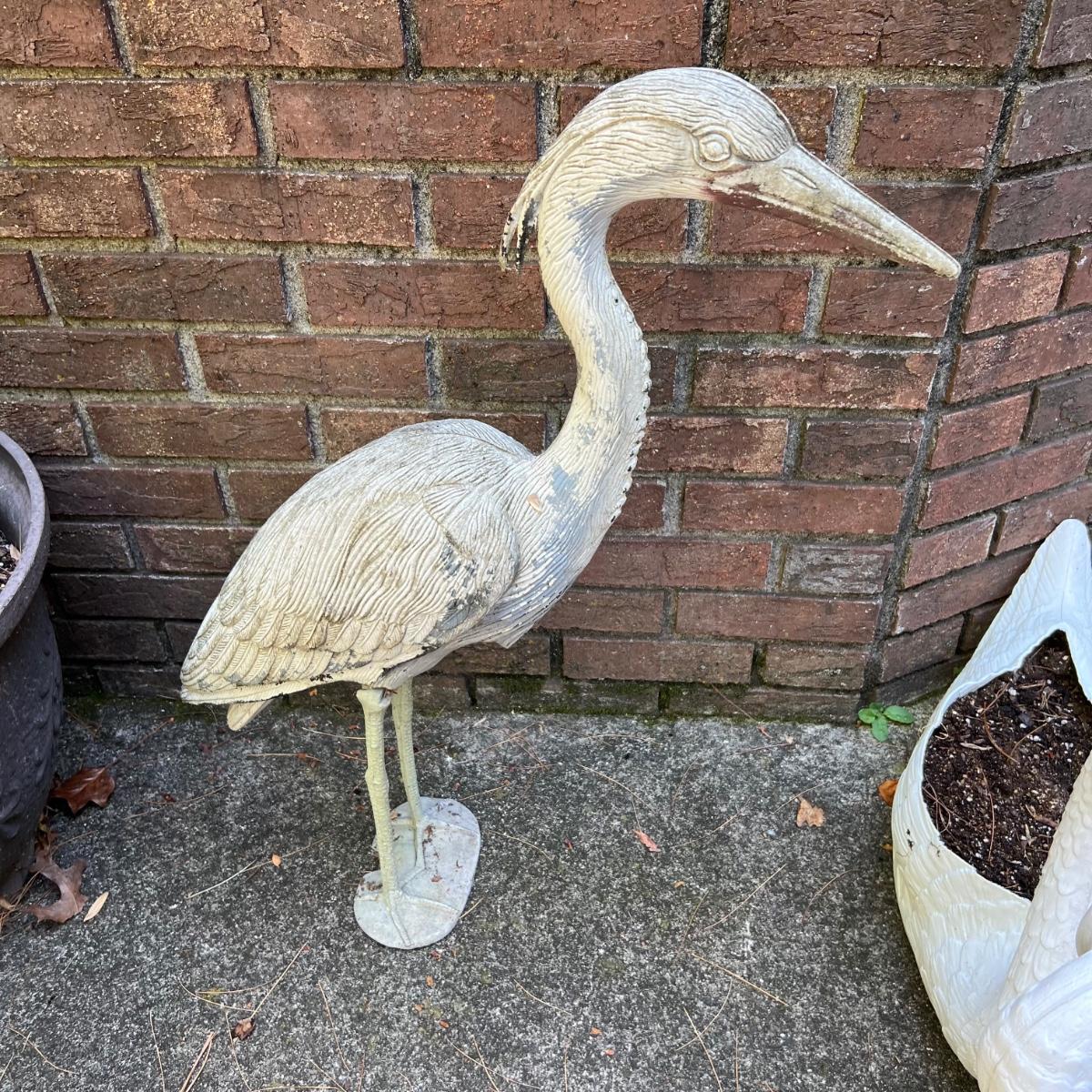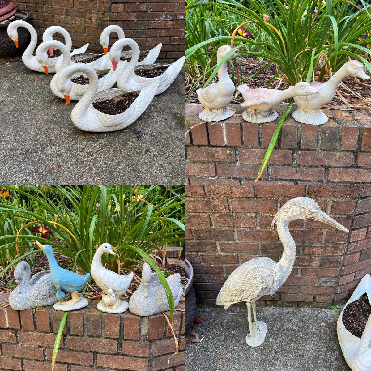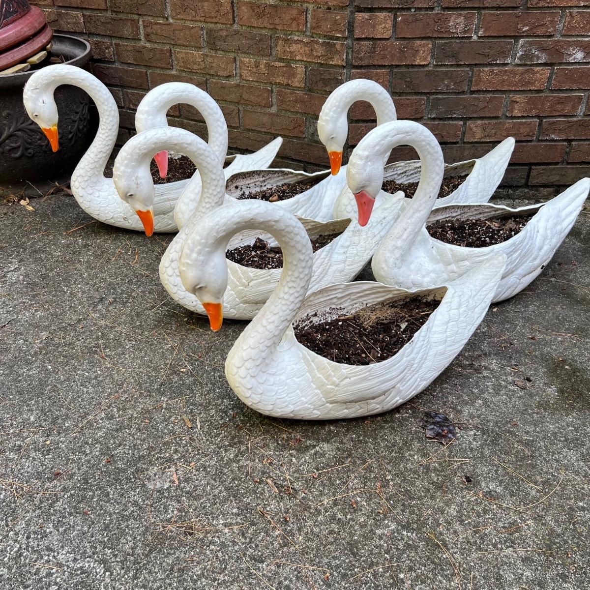 Six plastic planters come in the shape of swans; they have soil in them which can be dumped if desired by winning bidder. Also included is an assortment of ducks, heron and swans that are all plastic. Swan planters measure 26” x 9” x 17”H.