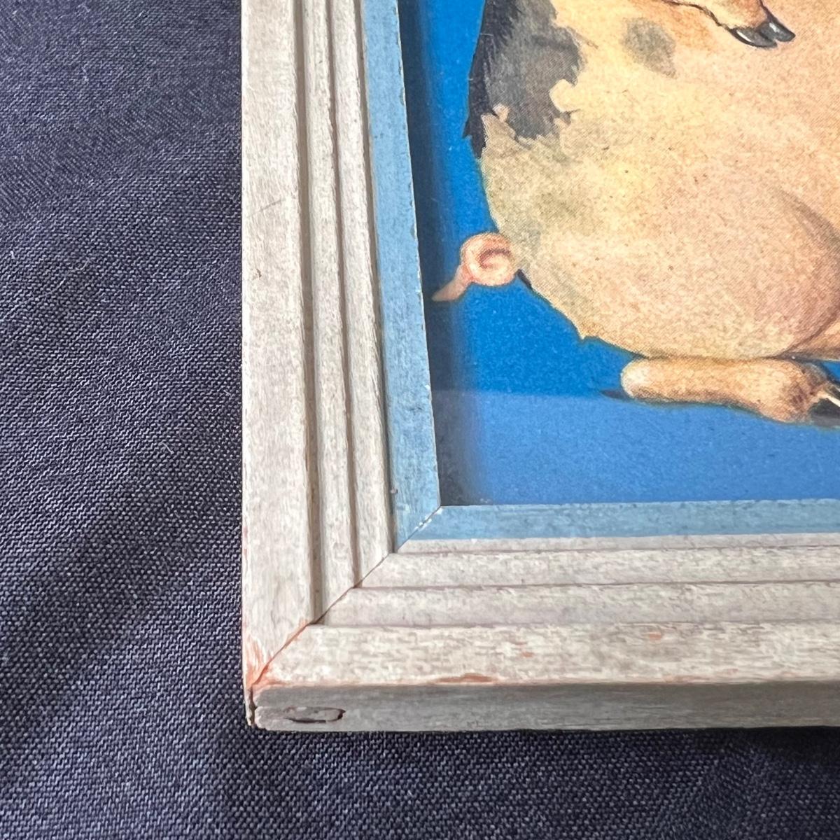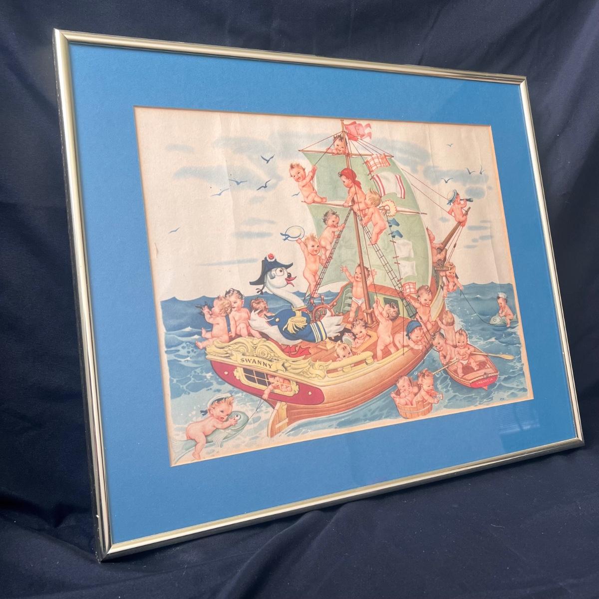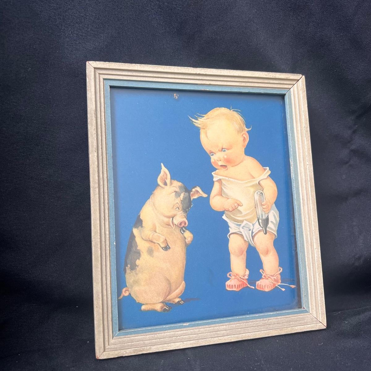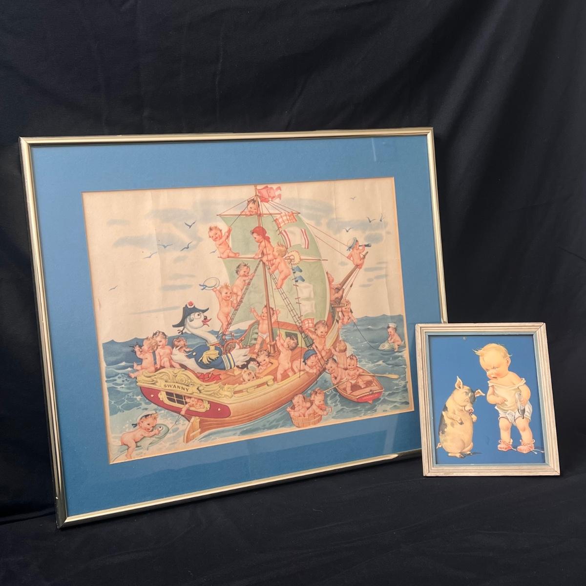 This lot includes two prints that are baby themed. The larger print appears to be a part of the Swan Soap series, involving Swanny babies and a boat. The print is matted and framed in a brass frame. This print measures 18” x 15”H. The smaller print involves a mischievous pig and baby, and is framed in a wooden frame. This print measures 5.75” x 6.75”. There are no signatures or titles visible so the artist and title are not confirmed on both pieces. Shipping available.