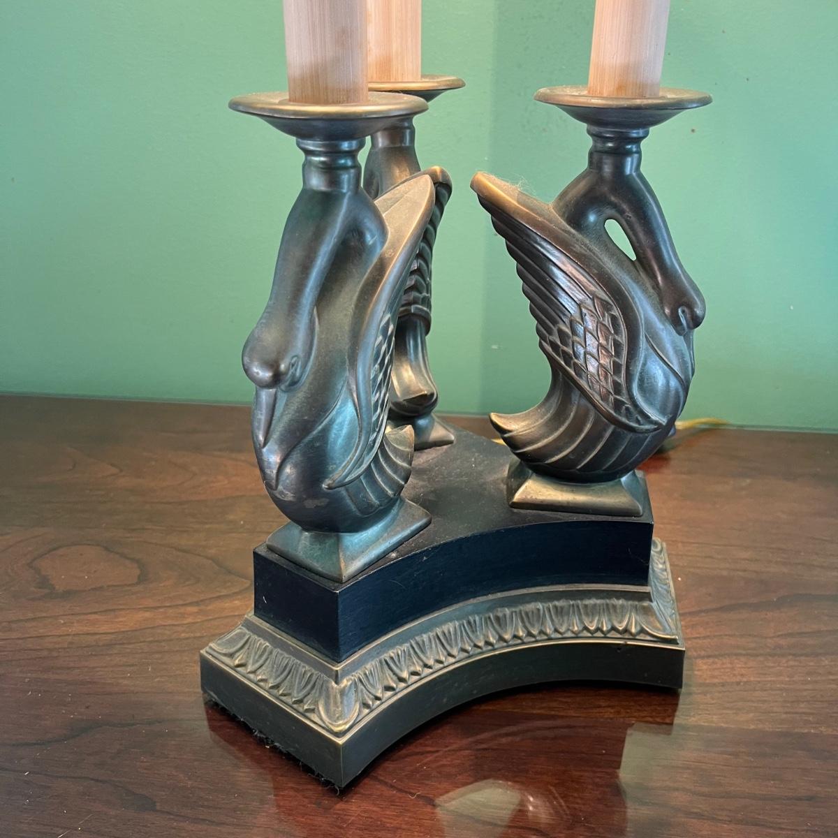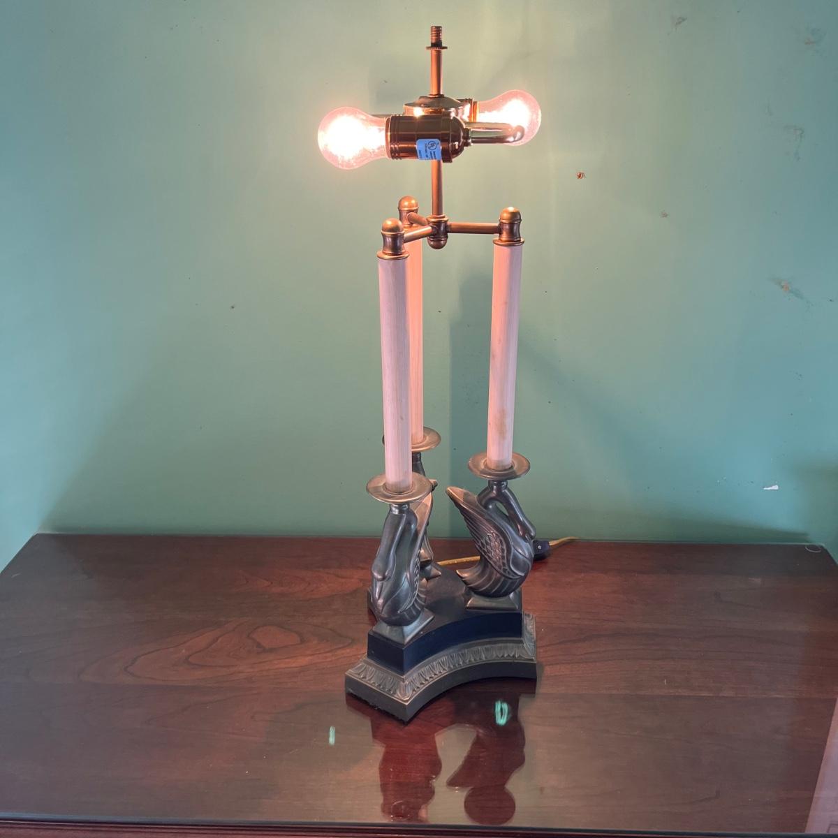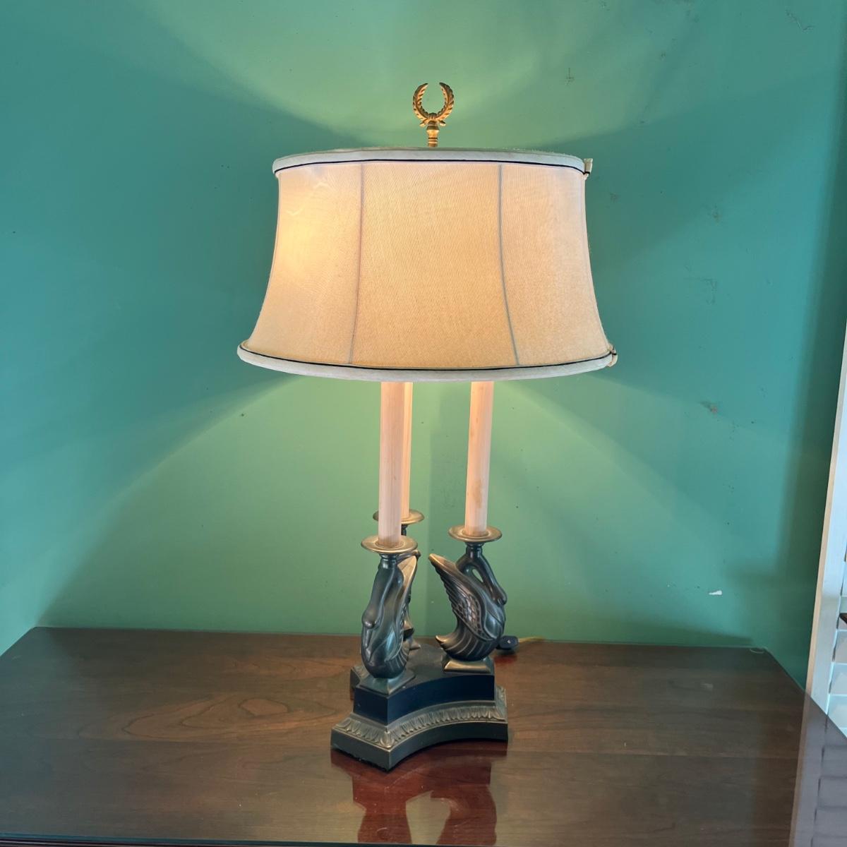 Lot includes a two bulb table lamp with a swan motif. Swans and base appear to be brass. Lamp without shade measures 8.5” x 8.5” x 26” tall. Shade is marked Ethan Allen.