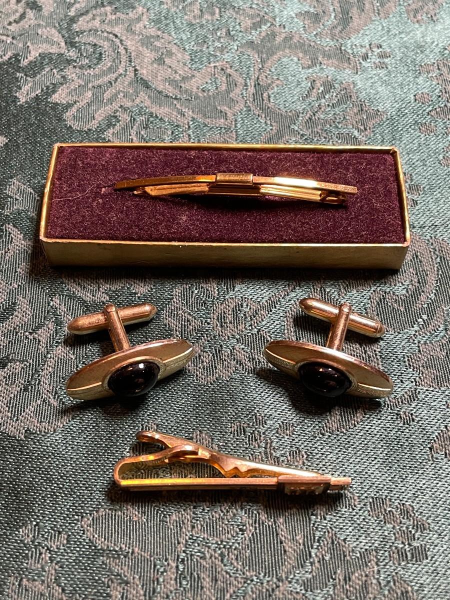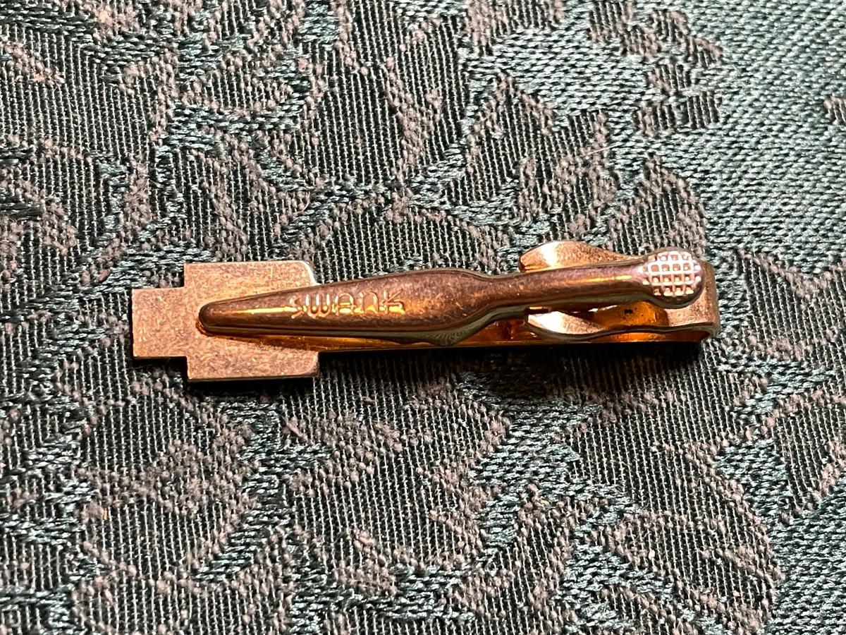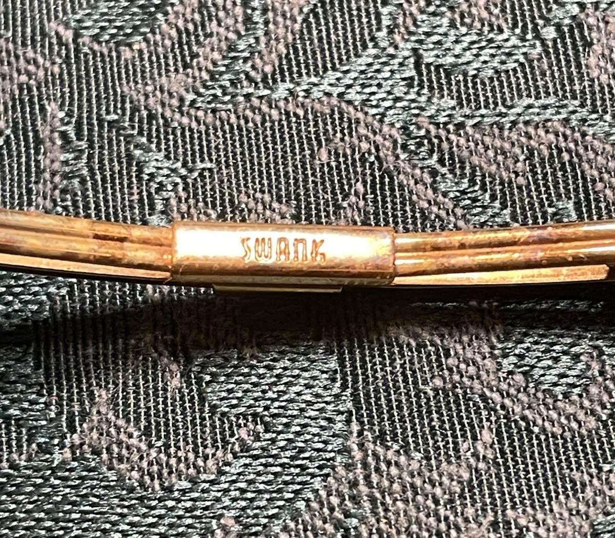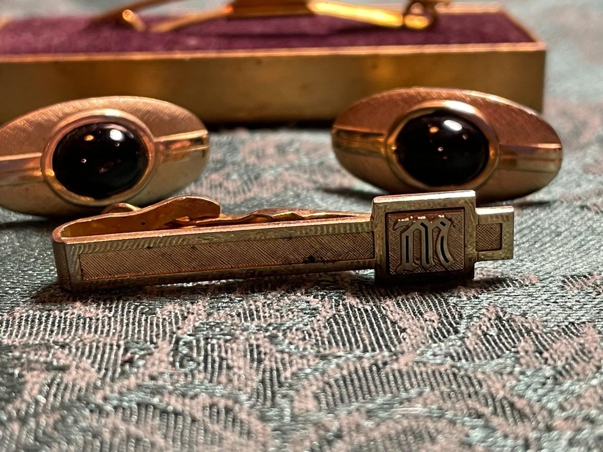 There is a collar bar clip, a pair of cufflinks, and a tie bar monogrammed with an M. All of the pieces are marked Swank.