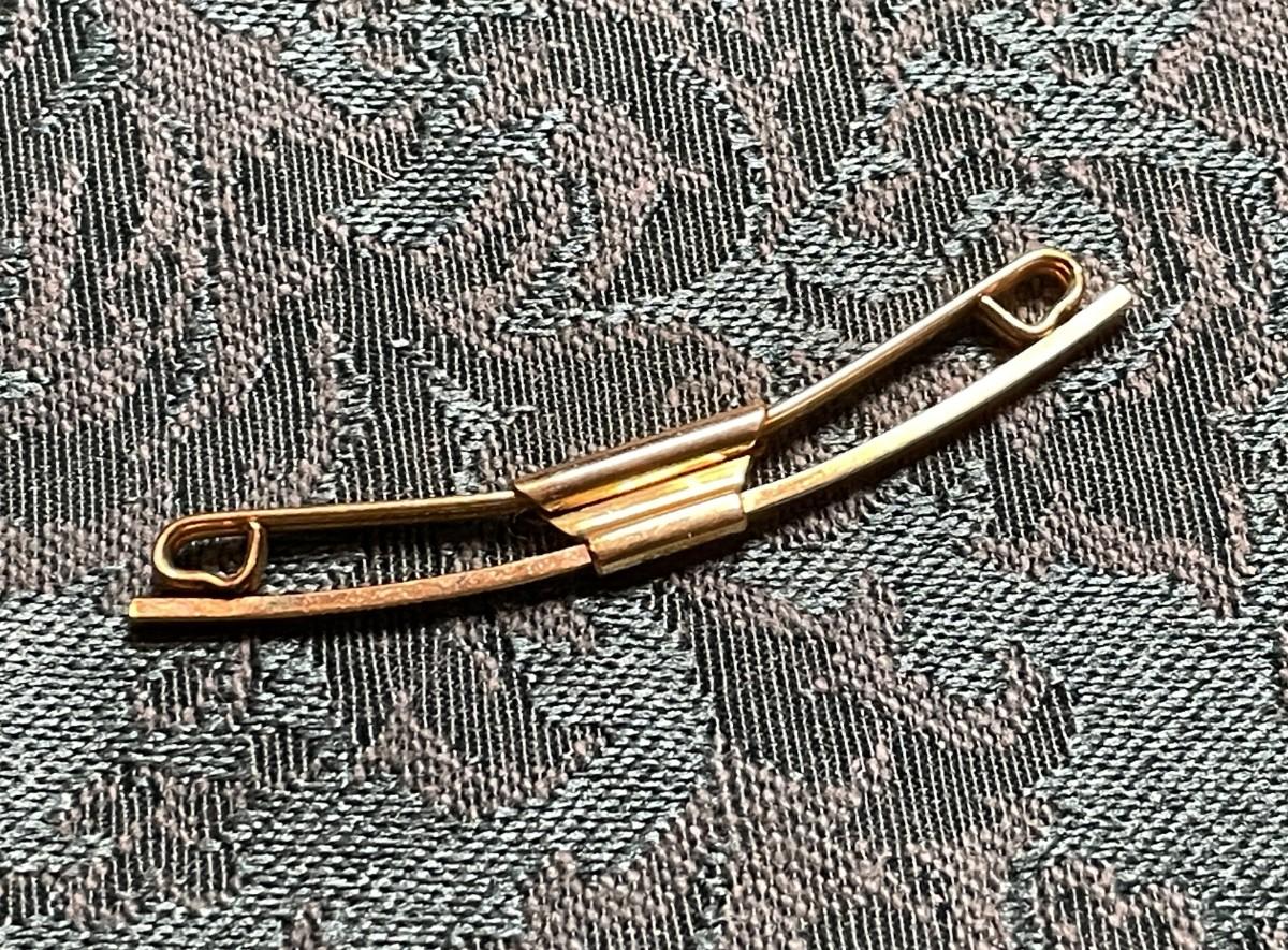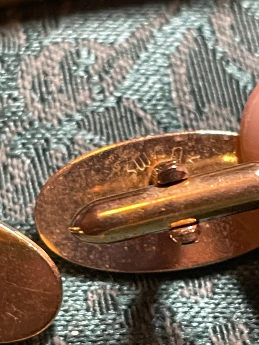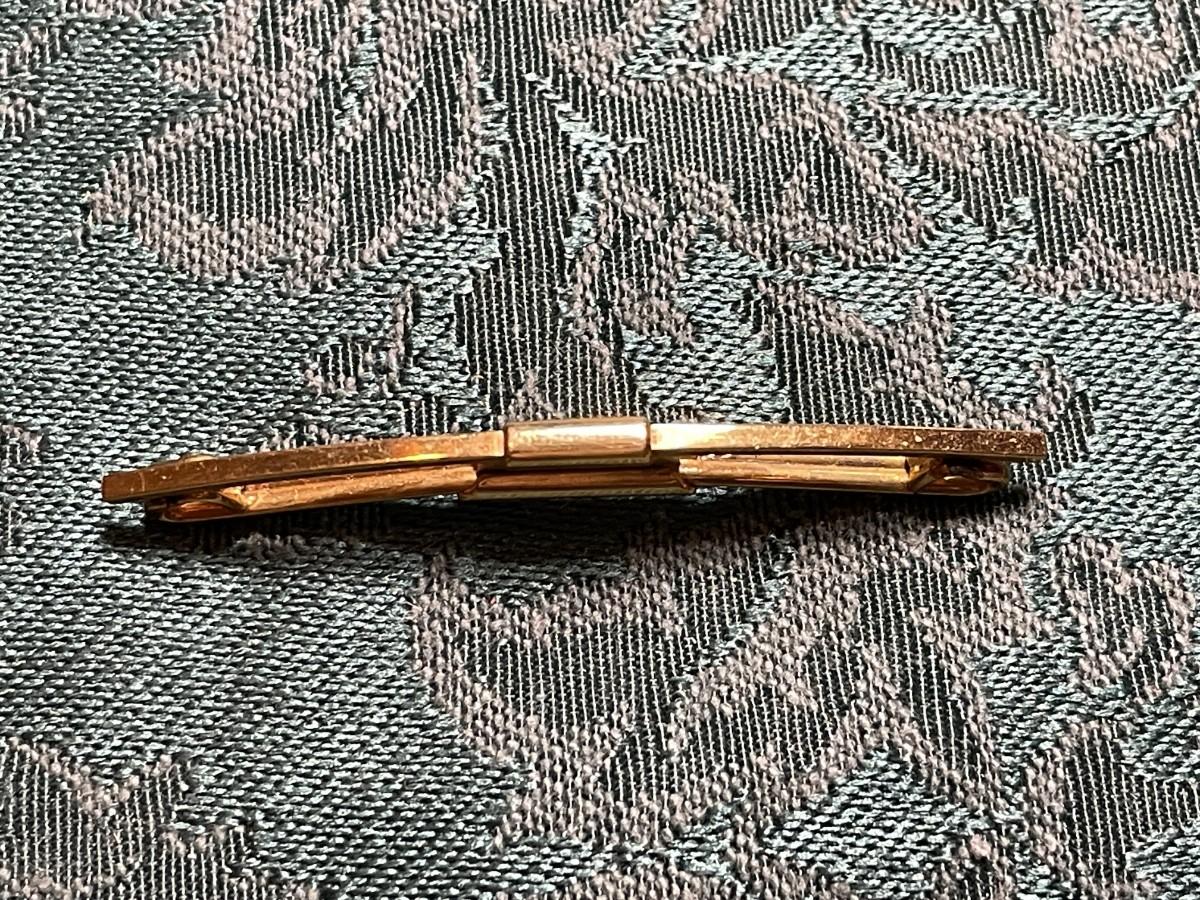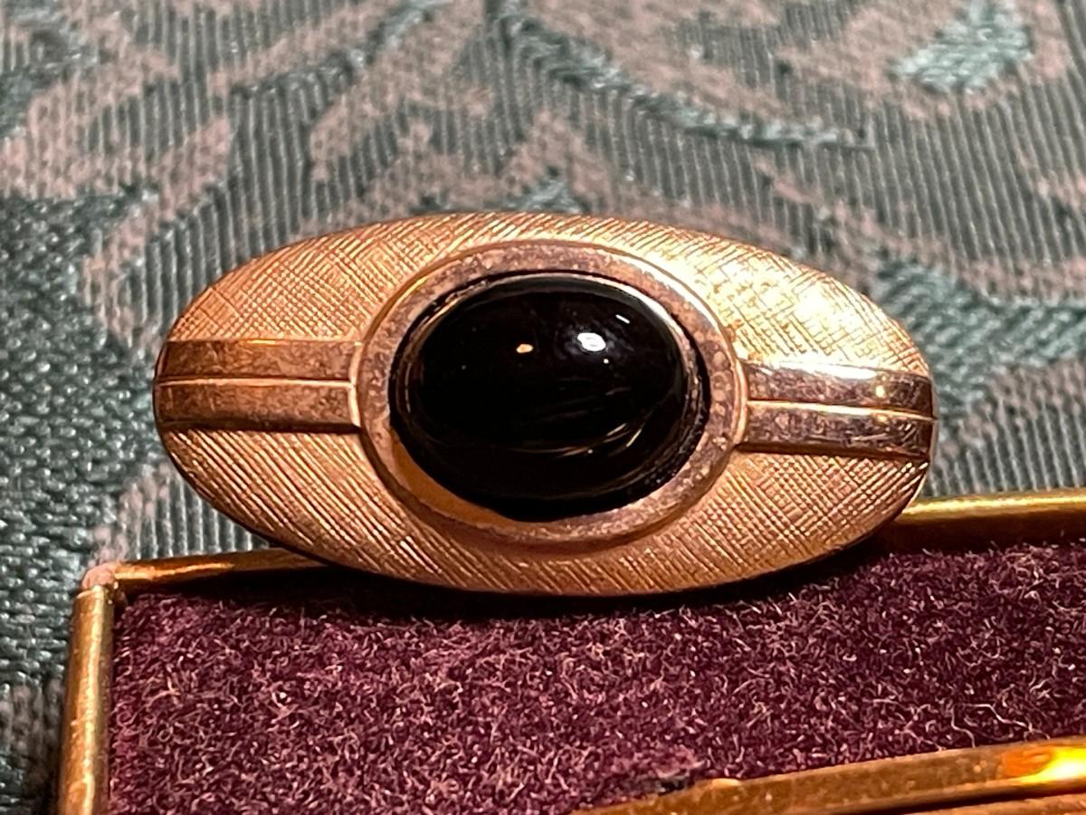 There is a collar bar clip, a pair of cufflinks, and a tie bar monogrammed with an M. All of the pieces are marked Swank.