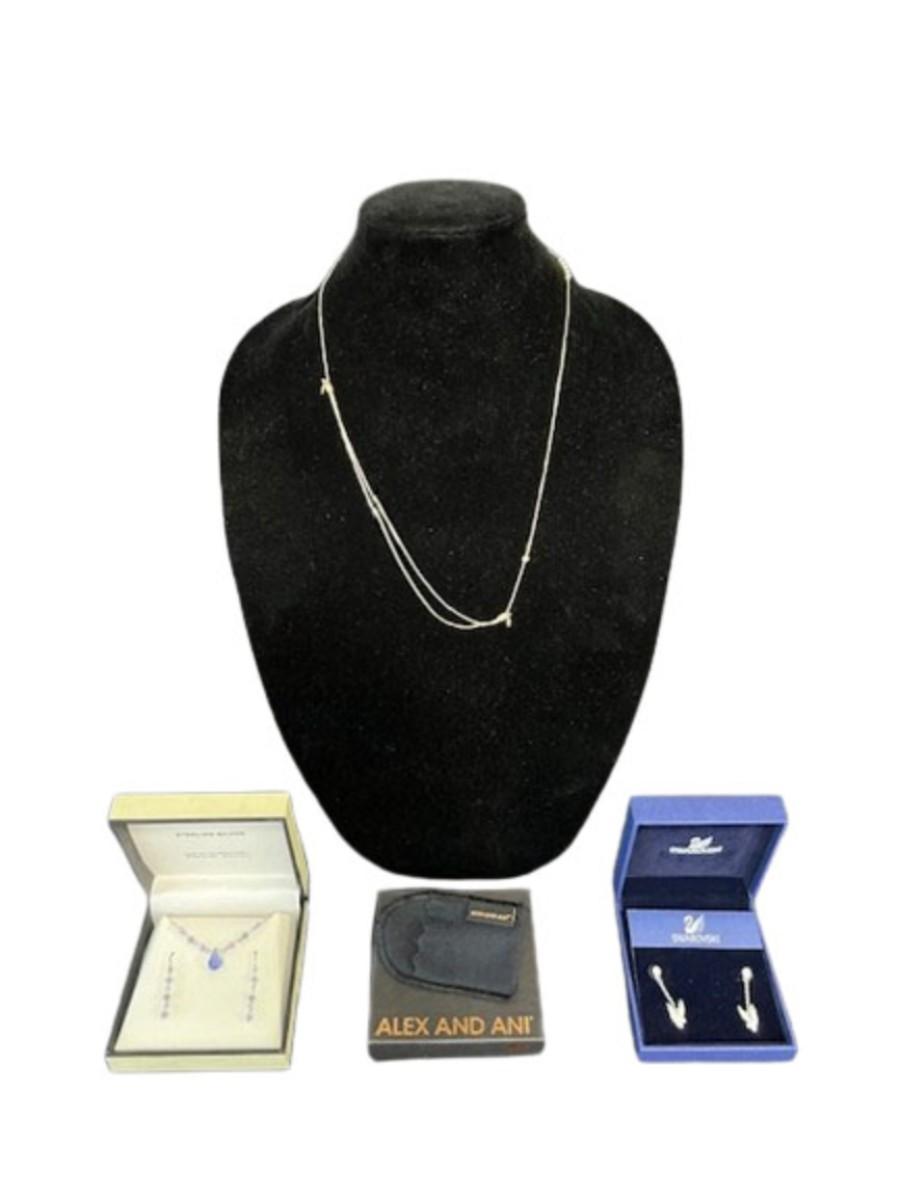 Includes Disney/Swarovski earrings, Swarovski sterling necklace and earrings, and Alex & Ani sterling expandable necklace (16-32"). Total of 3 pieces. In original boxes. [ST]